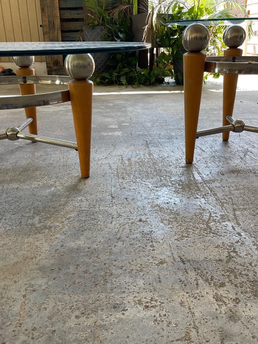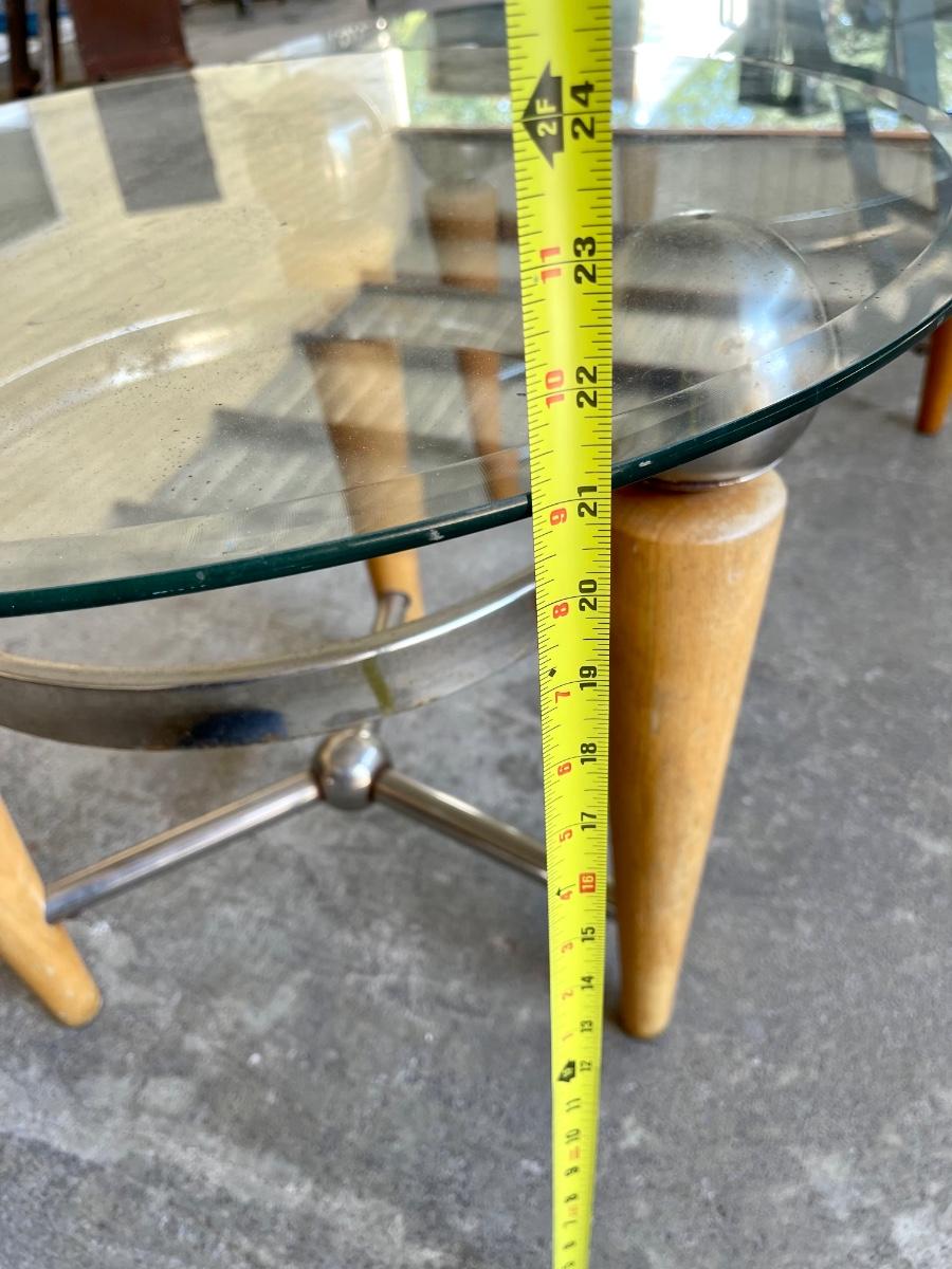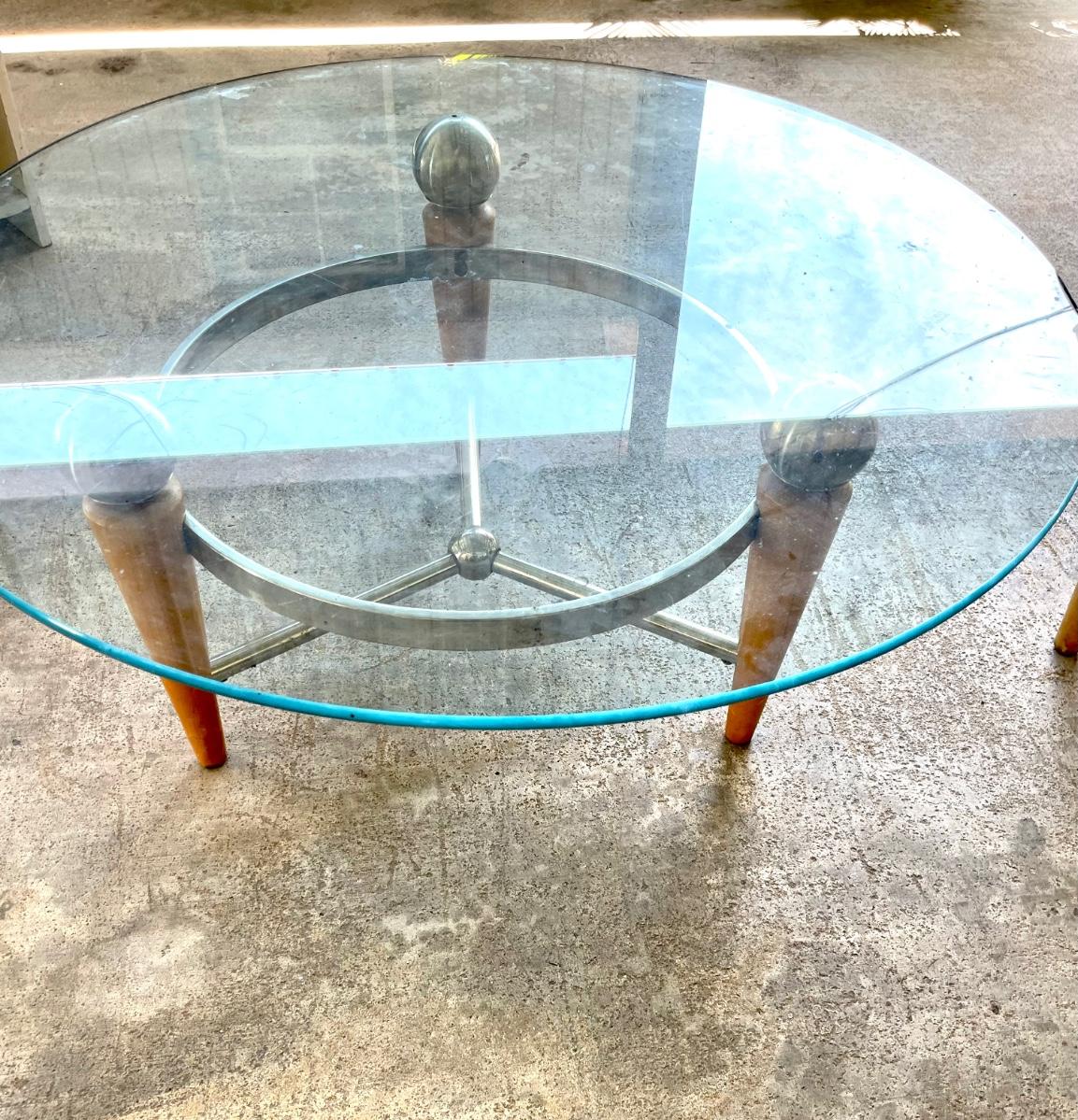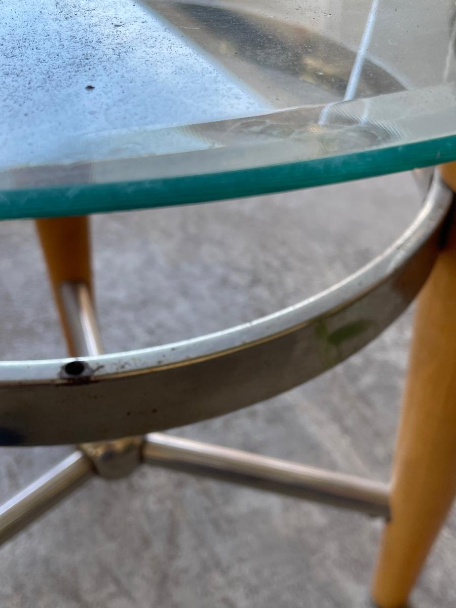 Cute set of indoor/outdoor tables in used condition. The large piece of glass alone would cost you more than the starting bid for these two cute glass top tables. I would use on patio. There are some spots of rust on small metal base. The 2 glass tops are in amazing condition. The glass on small one is beveled. The larger glass is super thick and in great shape! Probably 80s maybe early 90s tables. The rubber pads the glass rests on are missing on both tables which is a super easy fix. Wood and metal would be easy to paint and seal to match your outdoor or indoor decor. Great tables!! Great glass!!