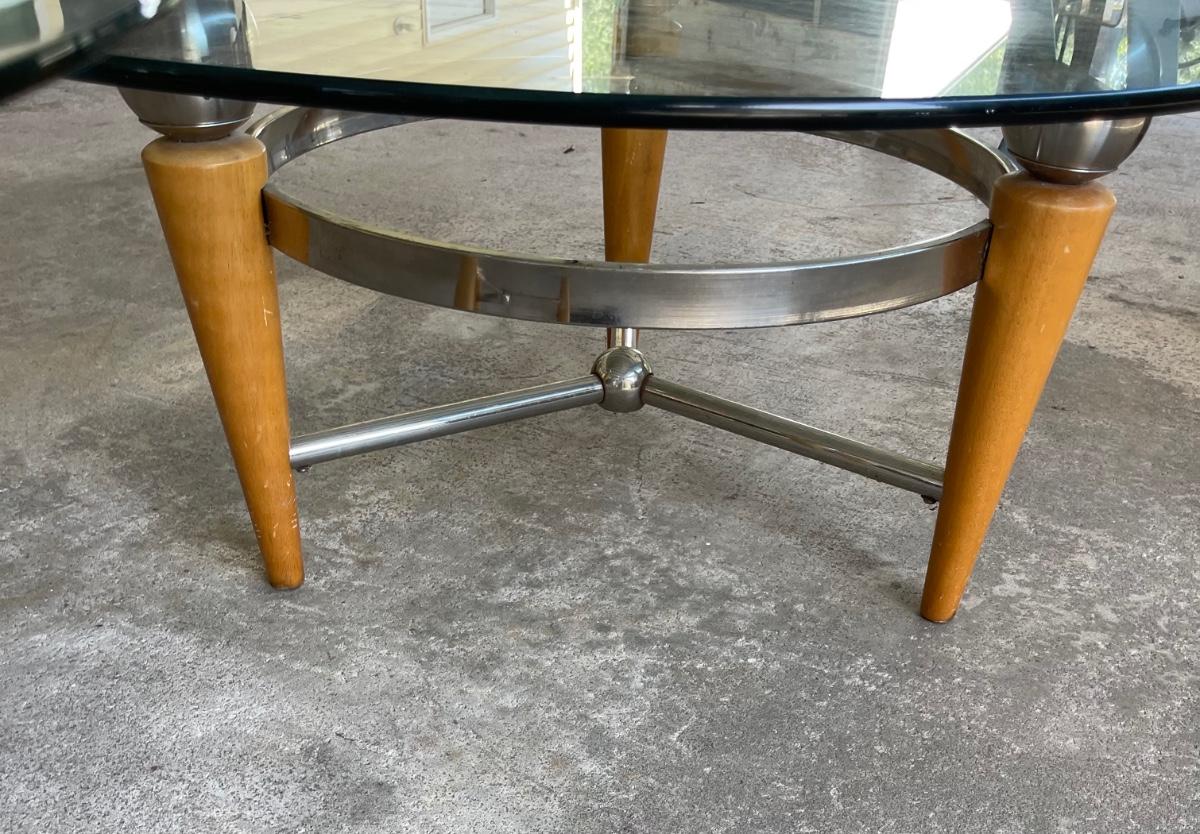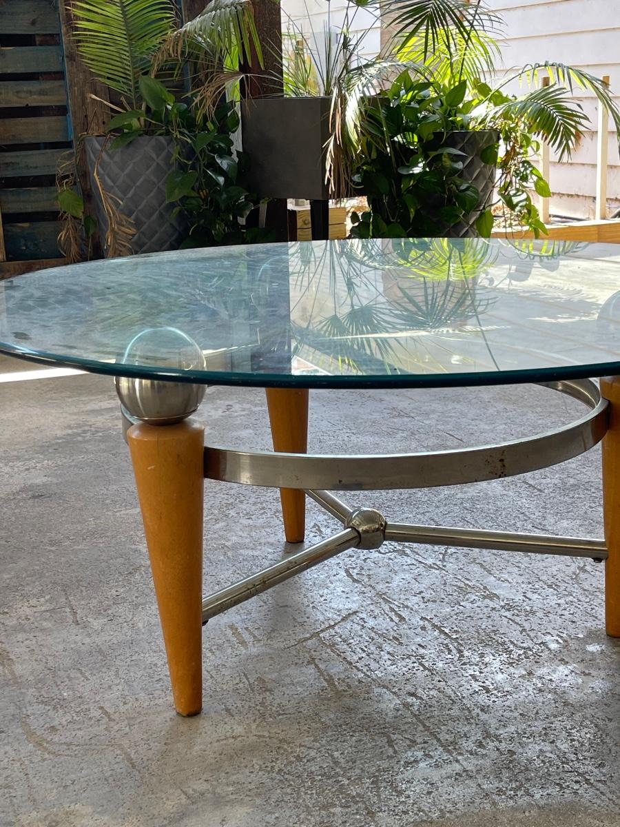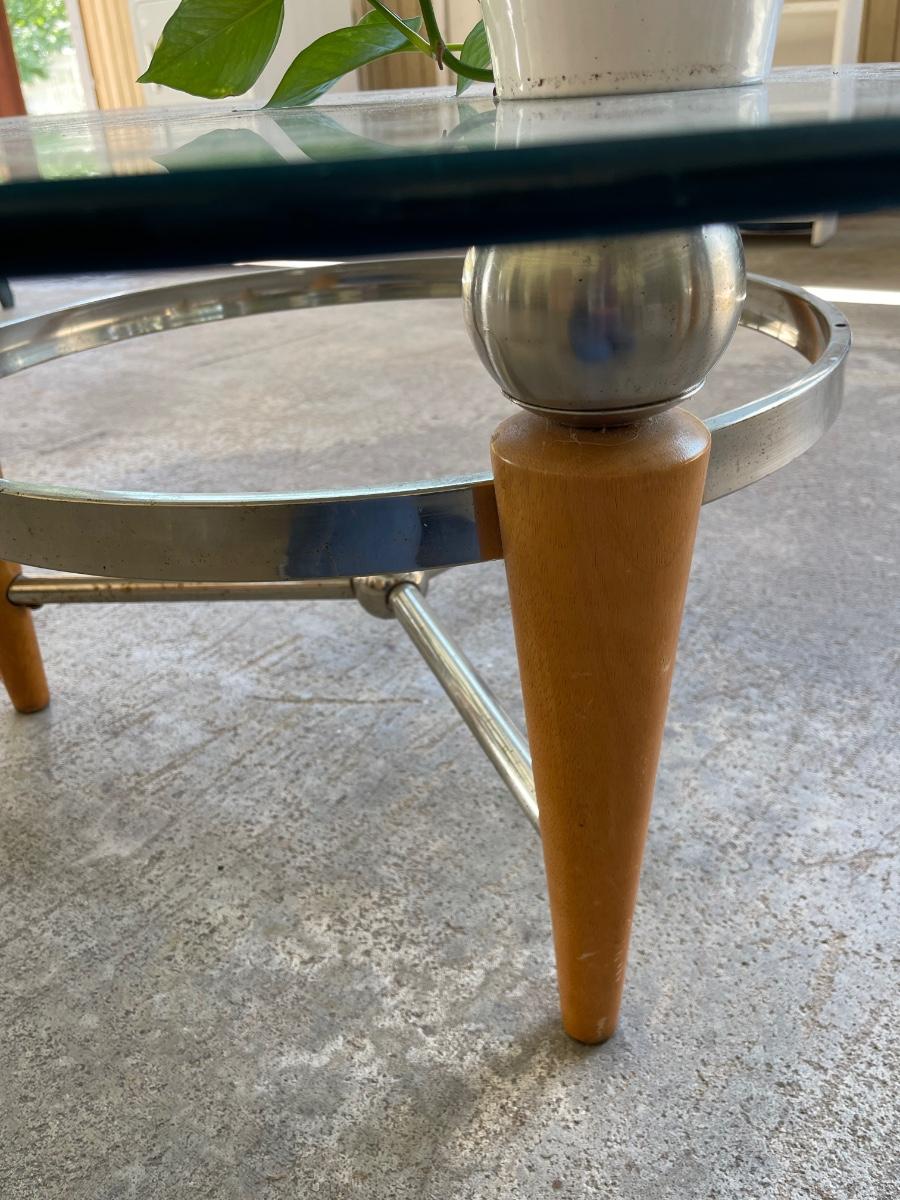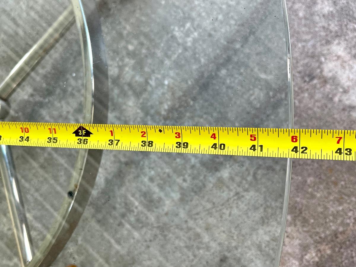 Cute set of indoor/outdoor tables in used condition. The large piece of glass alone would cost you more than the starting bid for these two cute glass top tables. I would use on patio. There are some spots of rust on small metal base. The 2 glass tops are in amazing condition. The glass on small one is beveled. The larger glass is super thick and in great shape! Probably 80s maybe early 90s tables. The rubber pads the glass rests on are missing on both tables which is a super easy fix. Wood and metal would be easy to paint and seal to match your outdoor or indoor decor. Great tables!! Great glass!!