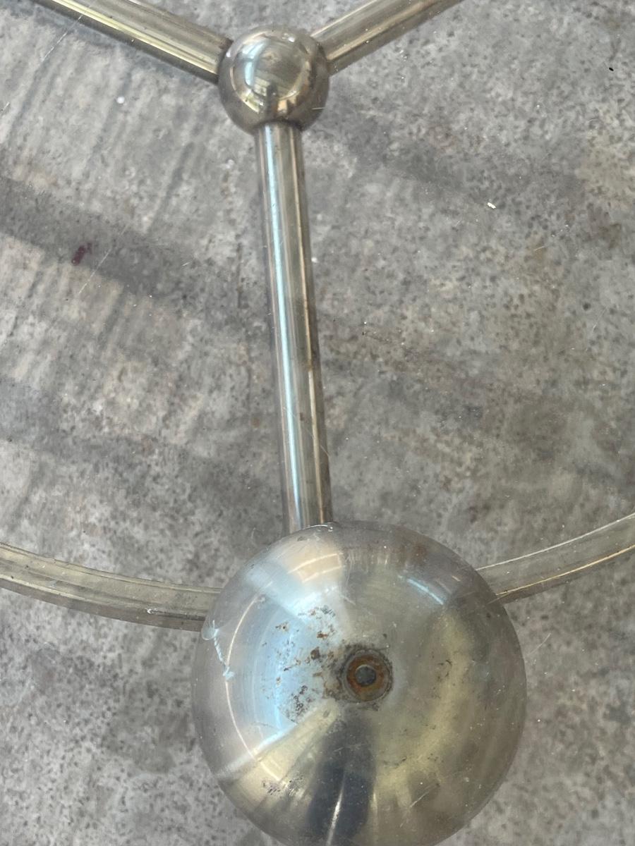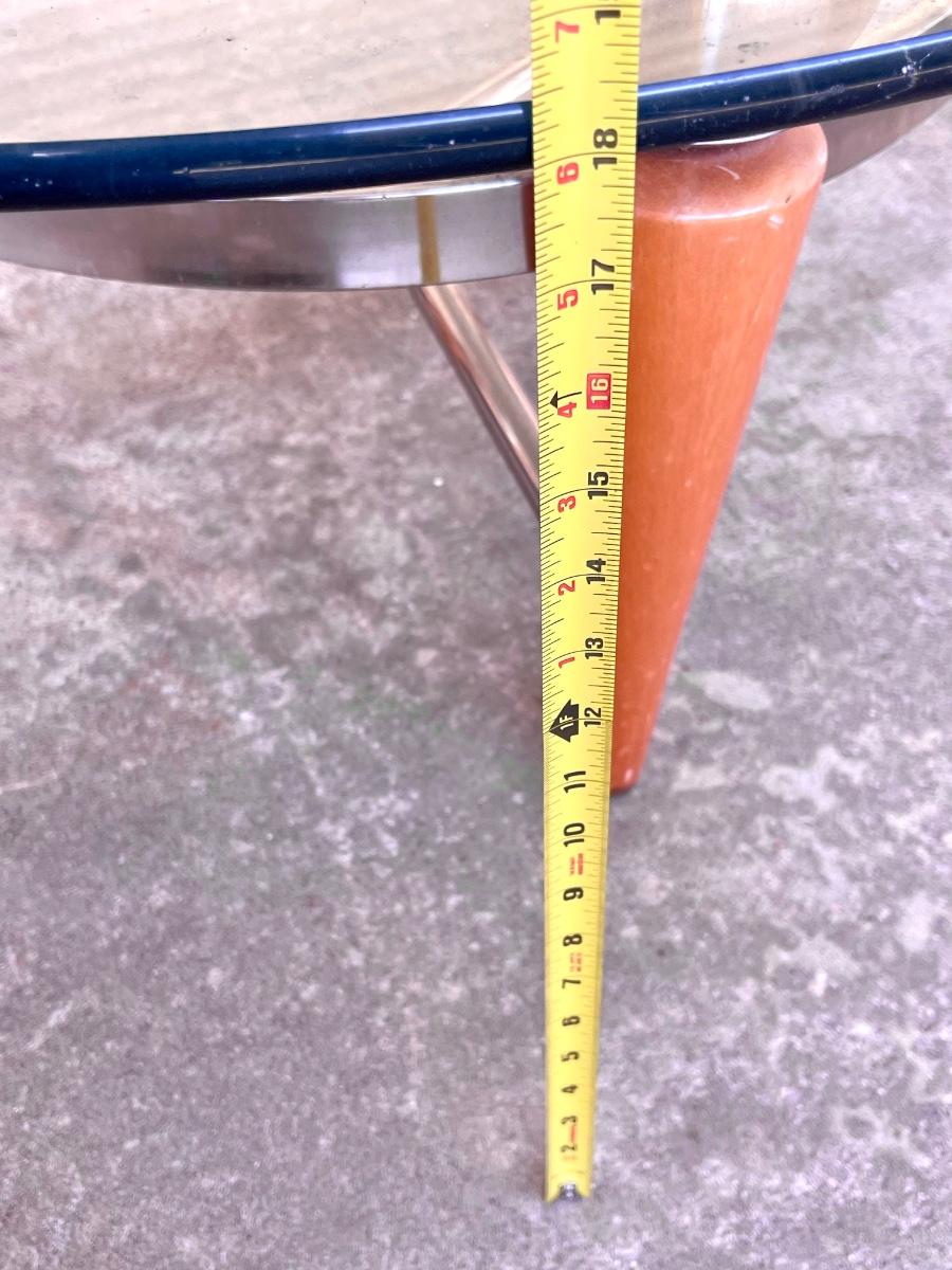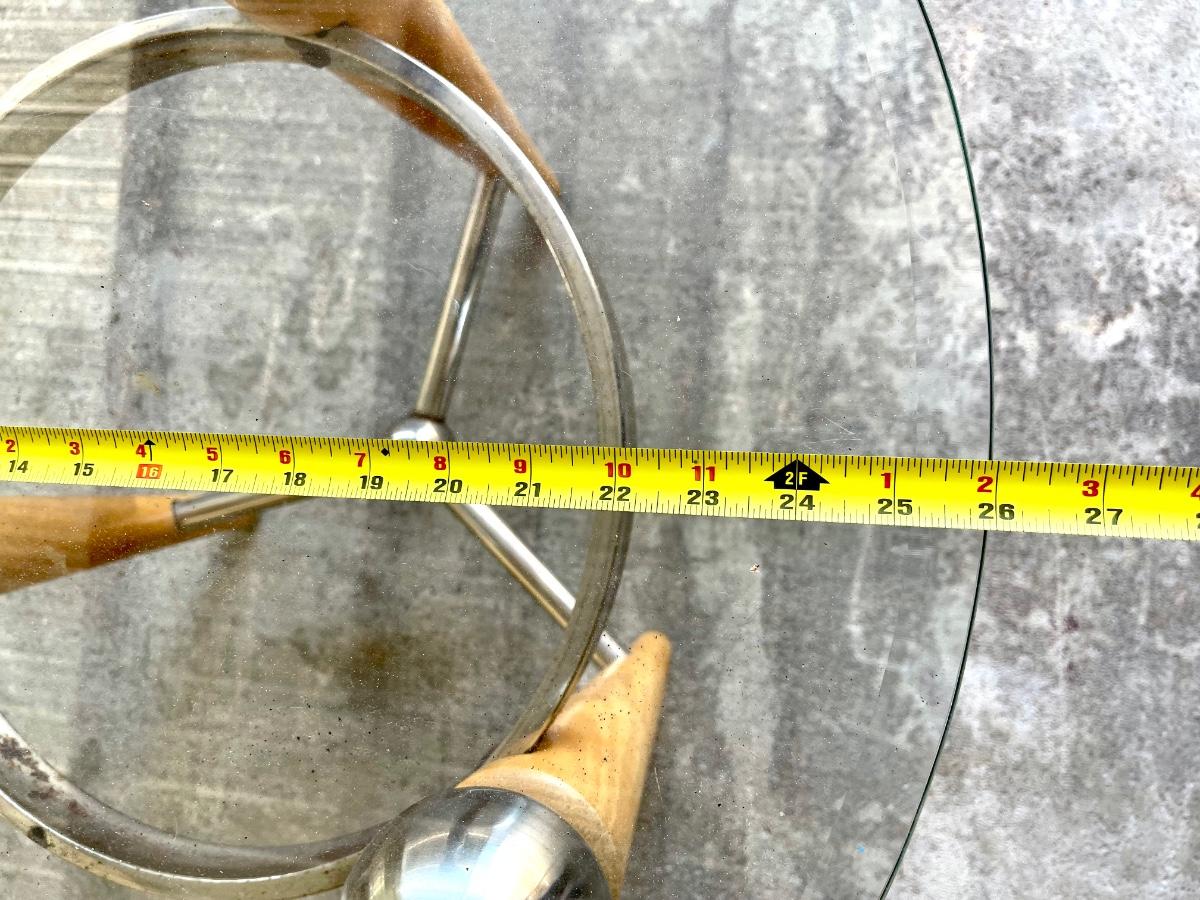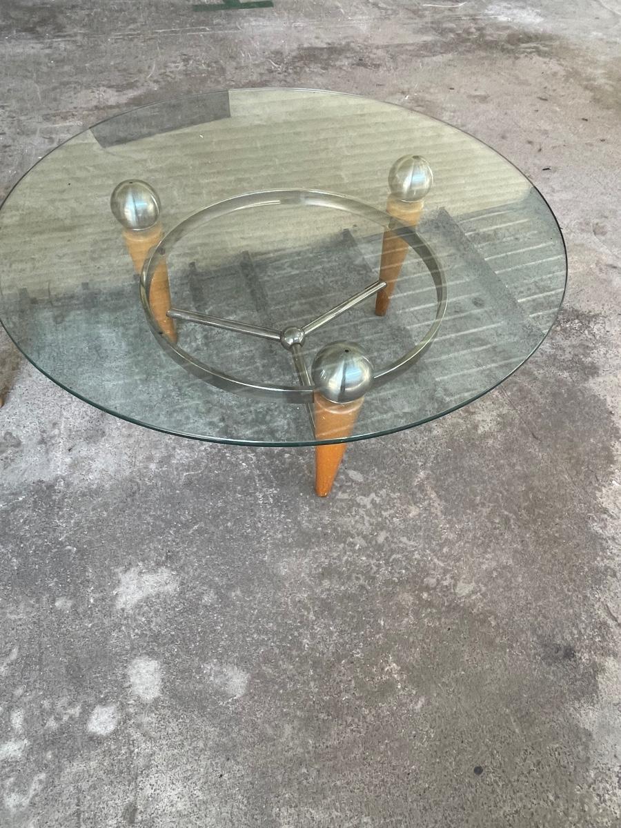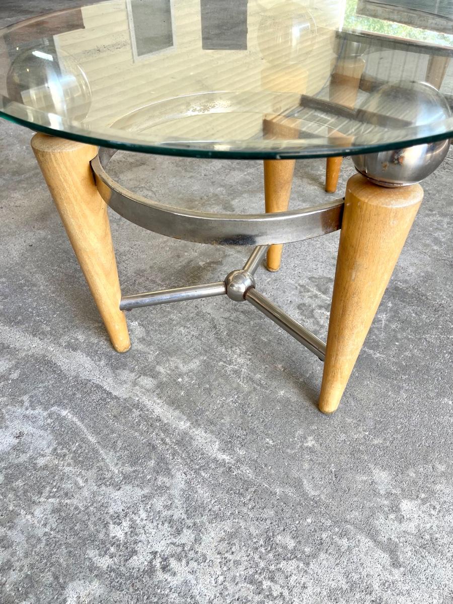 Cute set of indoor/outdoor tables in used condition. The large piece of glass alone would cost you more than the starting bid for these two cute glass top tables. I would use on patio. There are some spots of rust on small metal base. The 2 glass tops are in amazing condition. The glass on small one is beveled. The larger glass is super thick and in great shape! Probably 80s maybe early 90s tables. The rubber pads the glass rests on are missing on both tables which is a super easy fix. Wood and metal would be easy to paint and seal to match your outdoor or indoor decor. Great tables!! Great glass!!