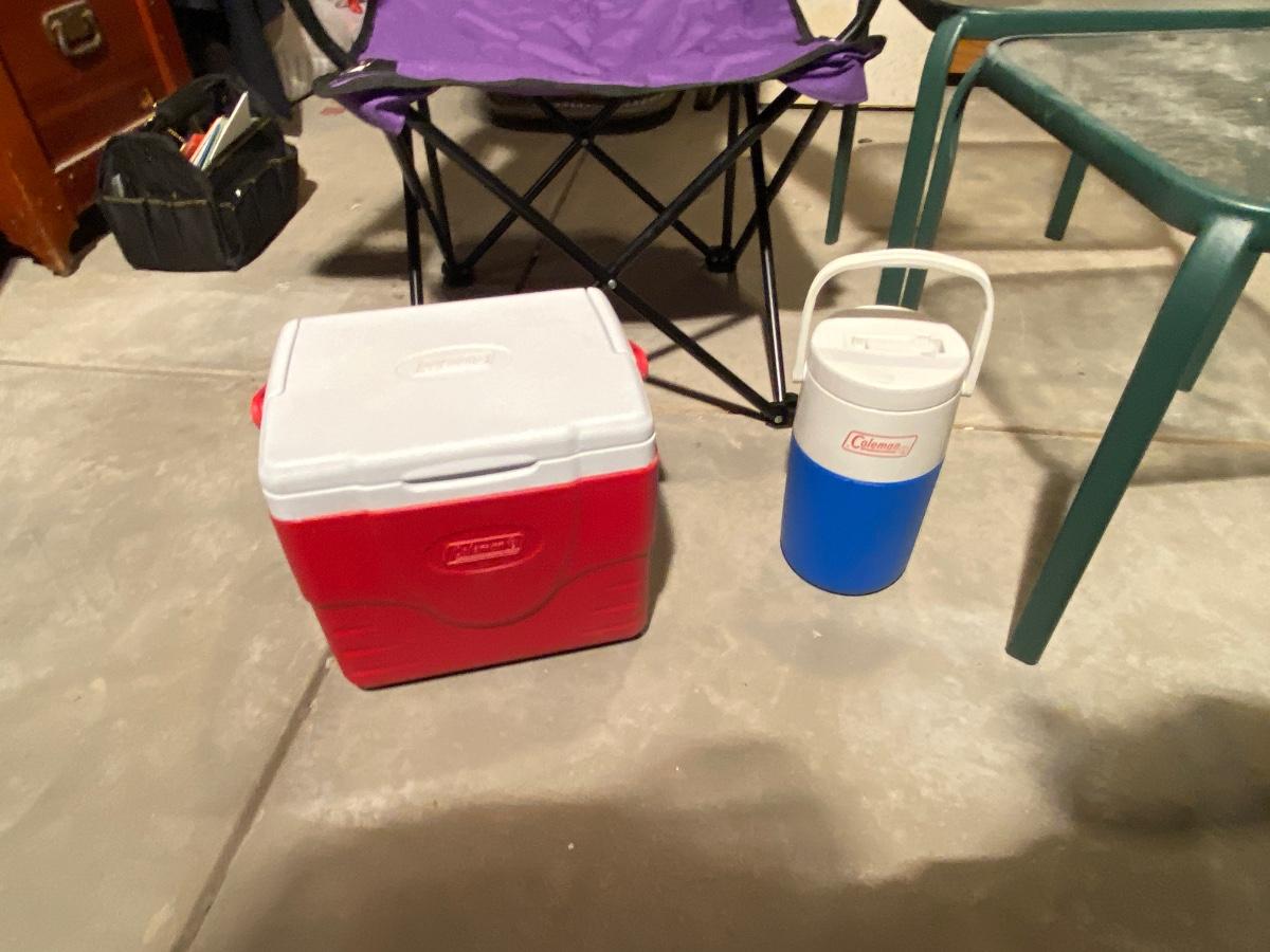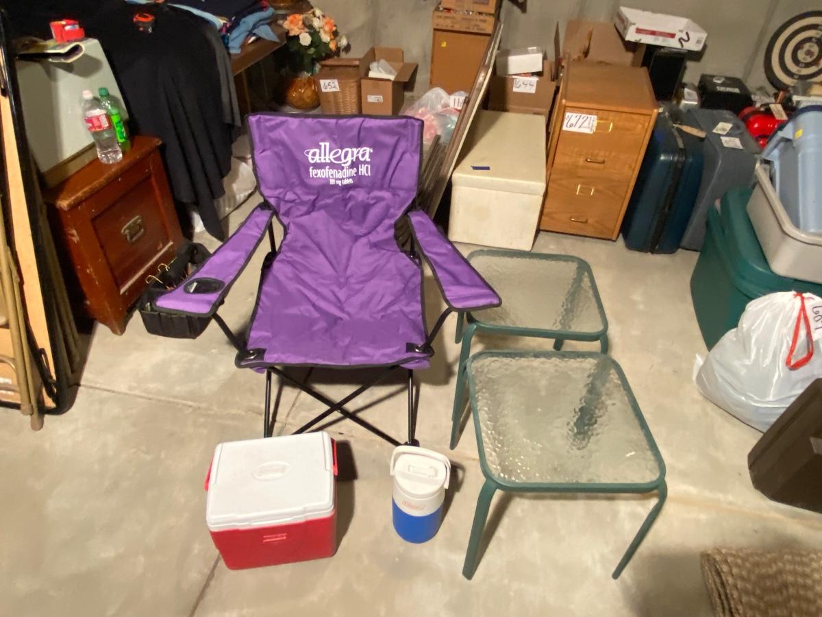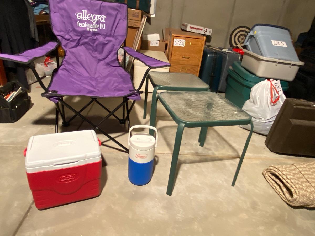 PATIO TABLES, COOLERS, FOLDING CHAIR
