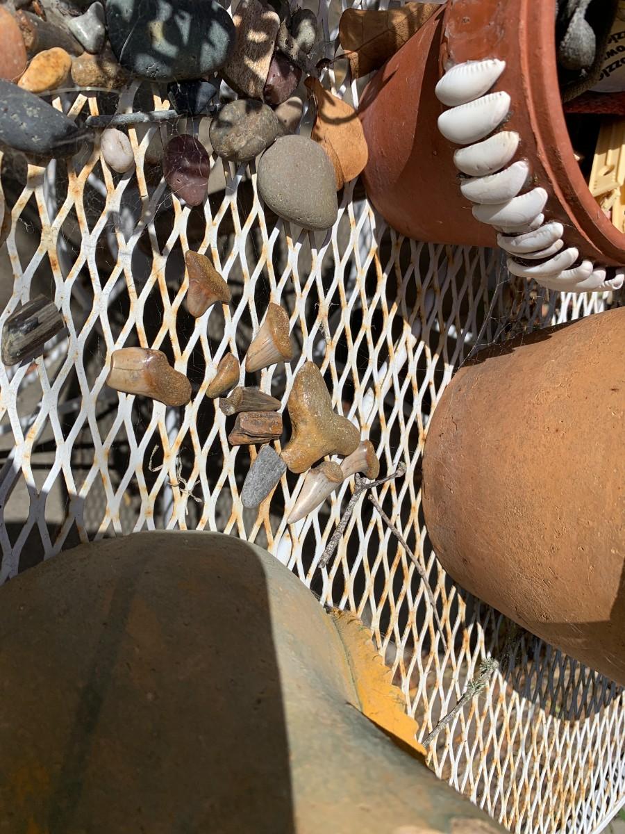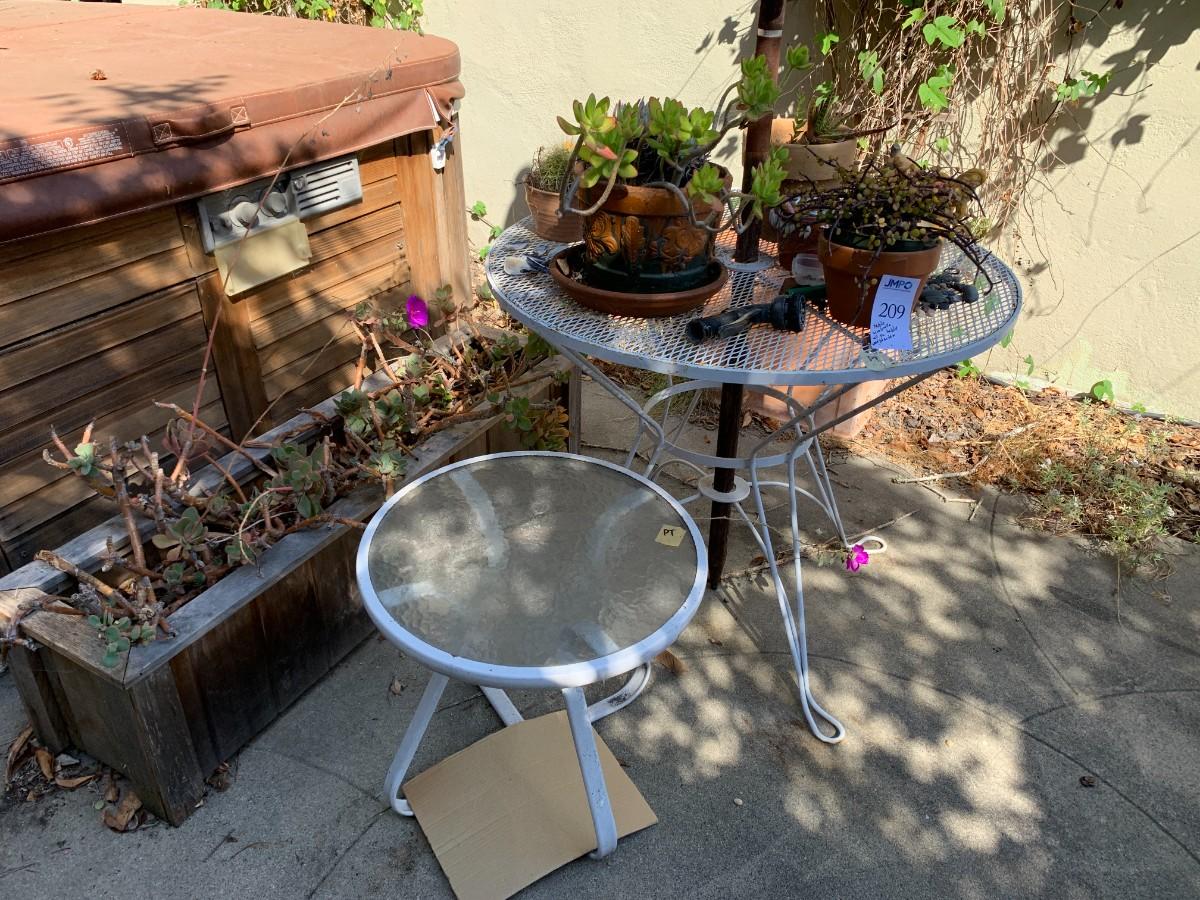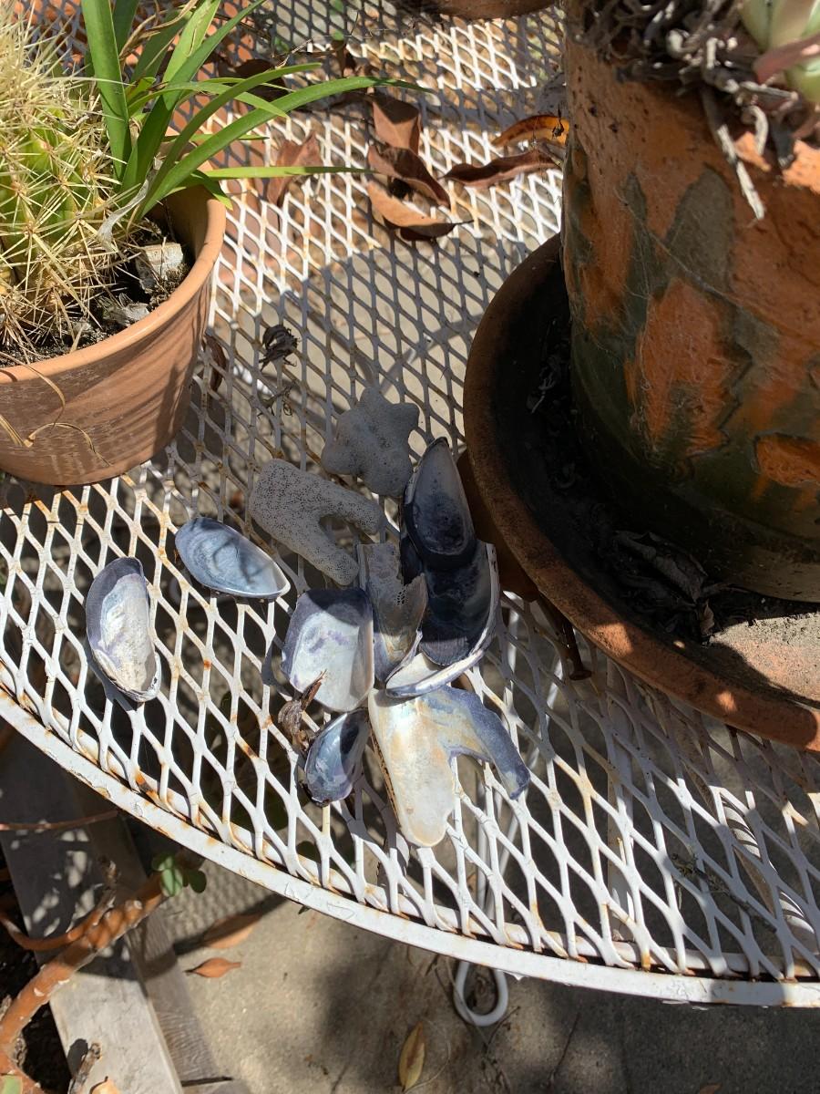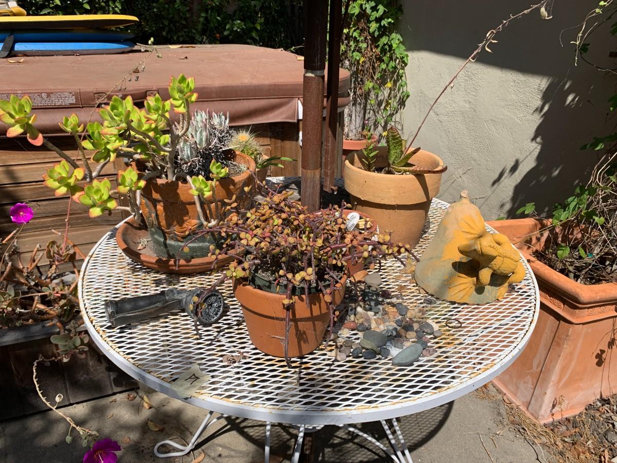 42" round patio table (some rust) and umbrella. Glass and metal side table. Needs cleaning. Includes stones and beach finds as shown.