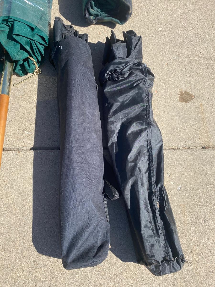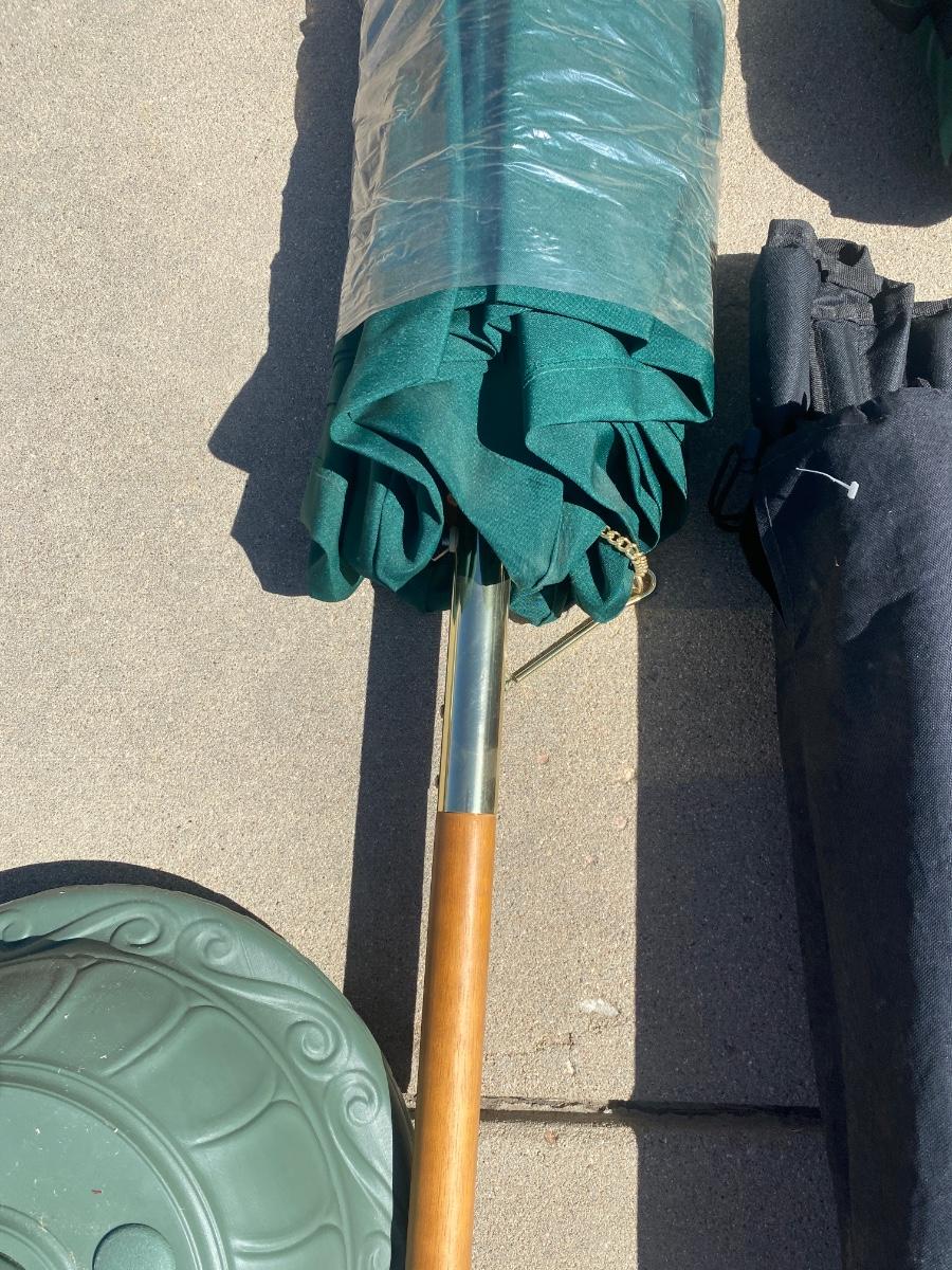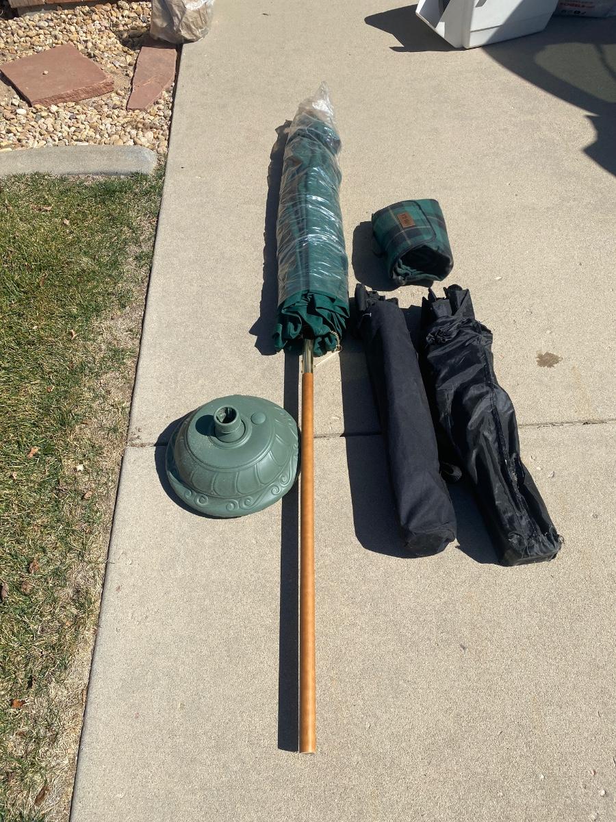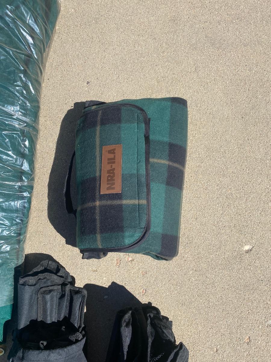 PATIO UMBRELLA AND STAND, TWO LAWN CHAIRS, NRA-ILA BLANKET