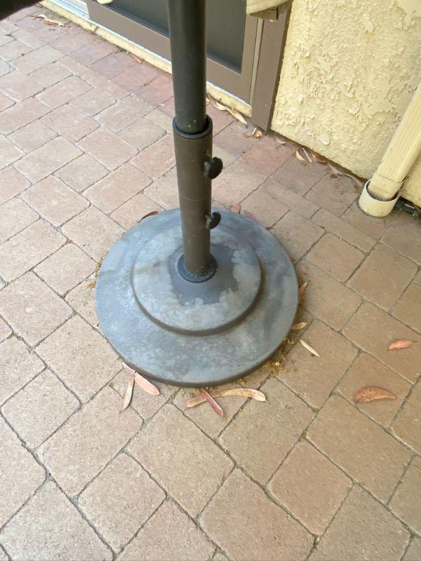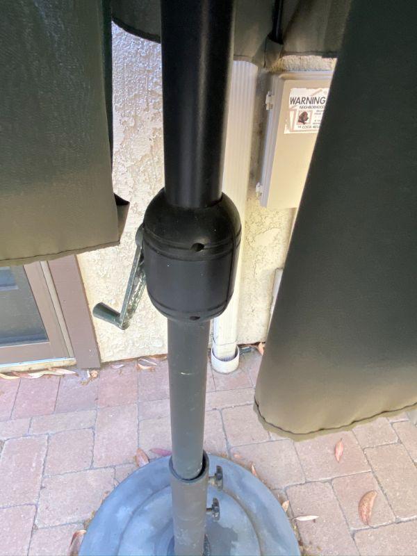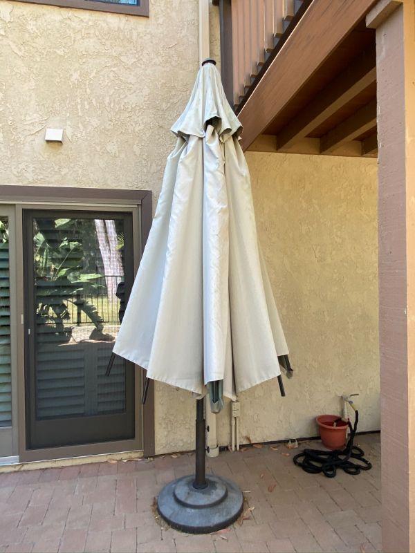 Large patio umbrella with stand base. Crank style open and close. Turns nicely. The shade looks a little faded but did not notice any tears.