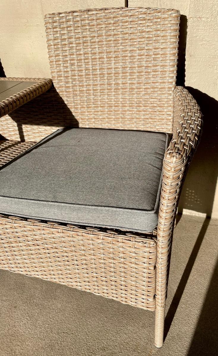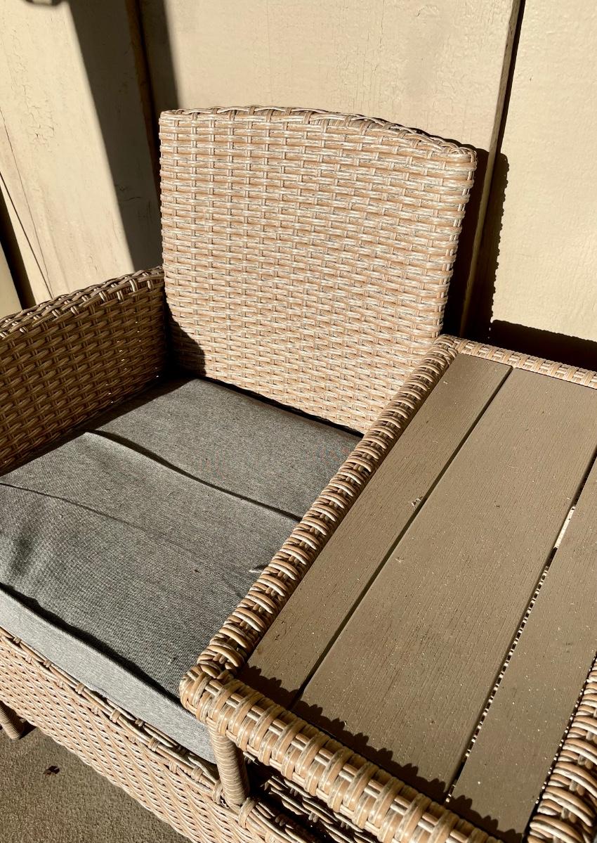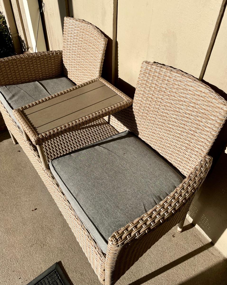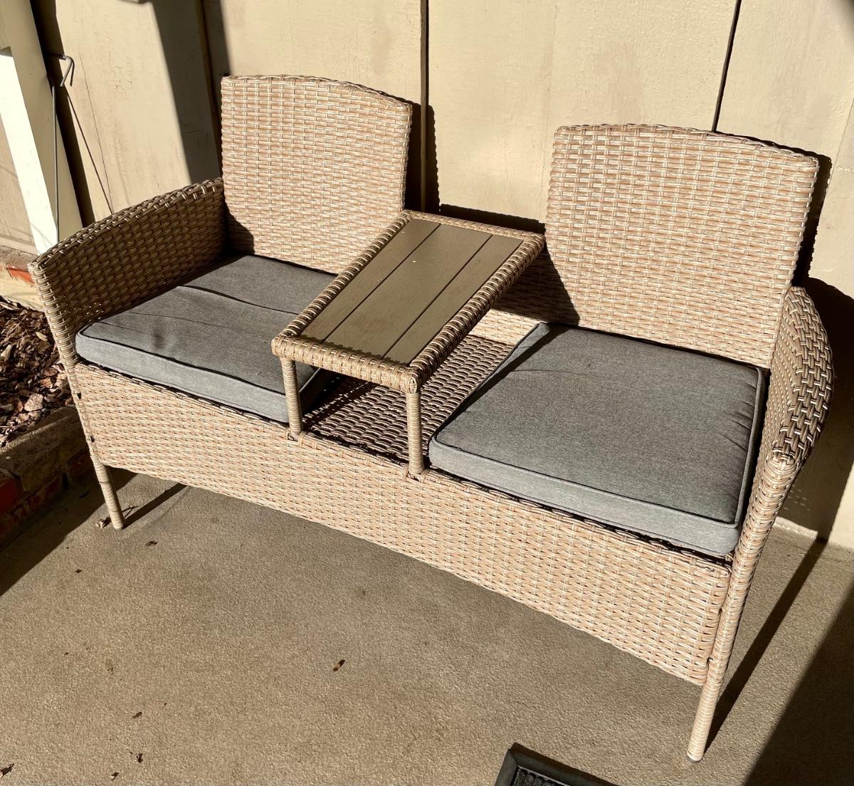 Patio Wicker Loveseat. With small table between seats. Has cushions. 55” long x 24” deep.