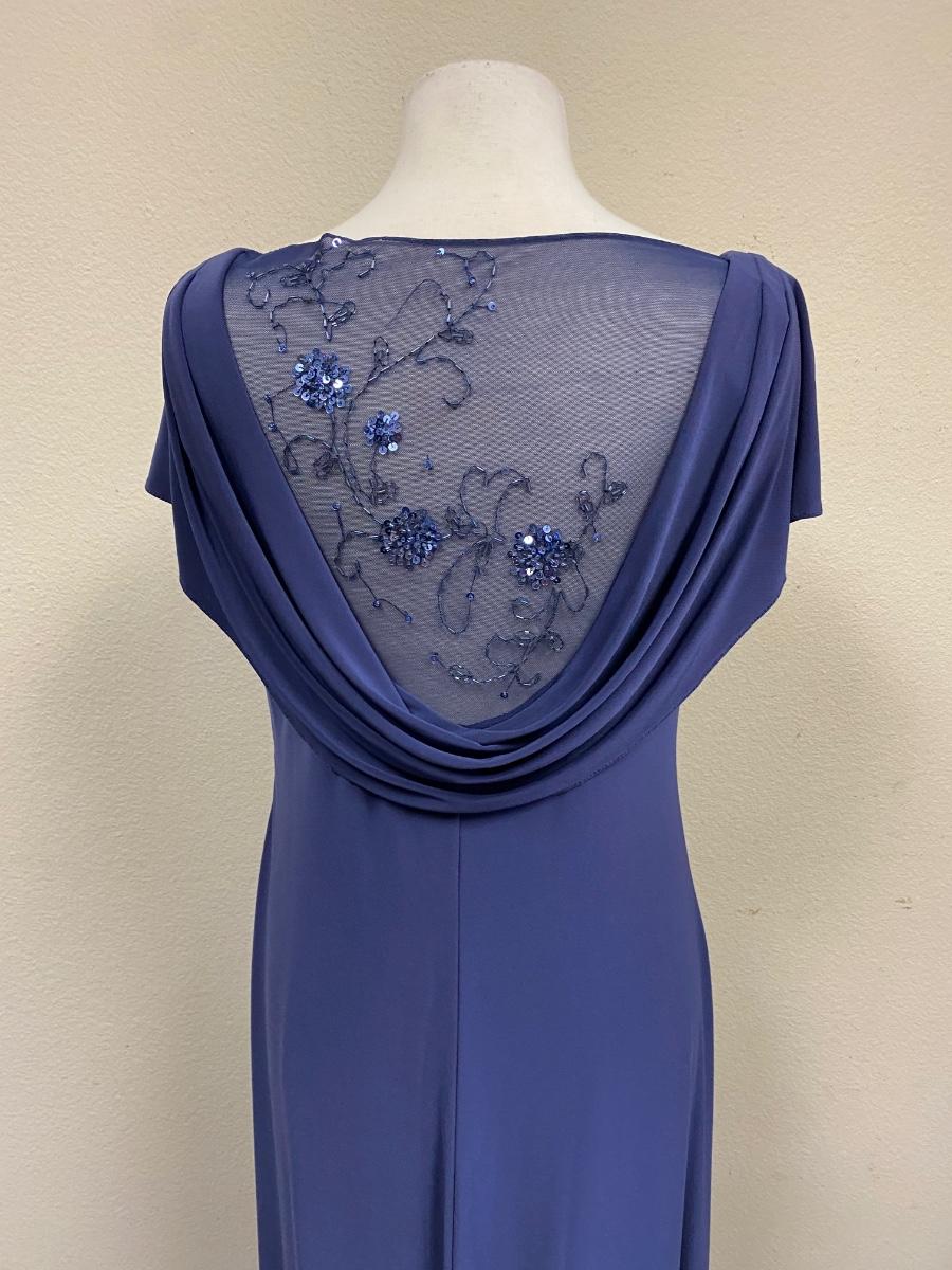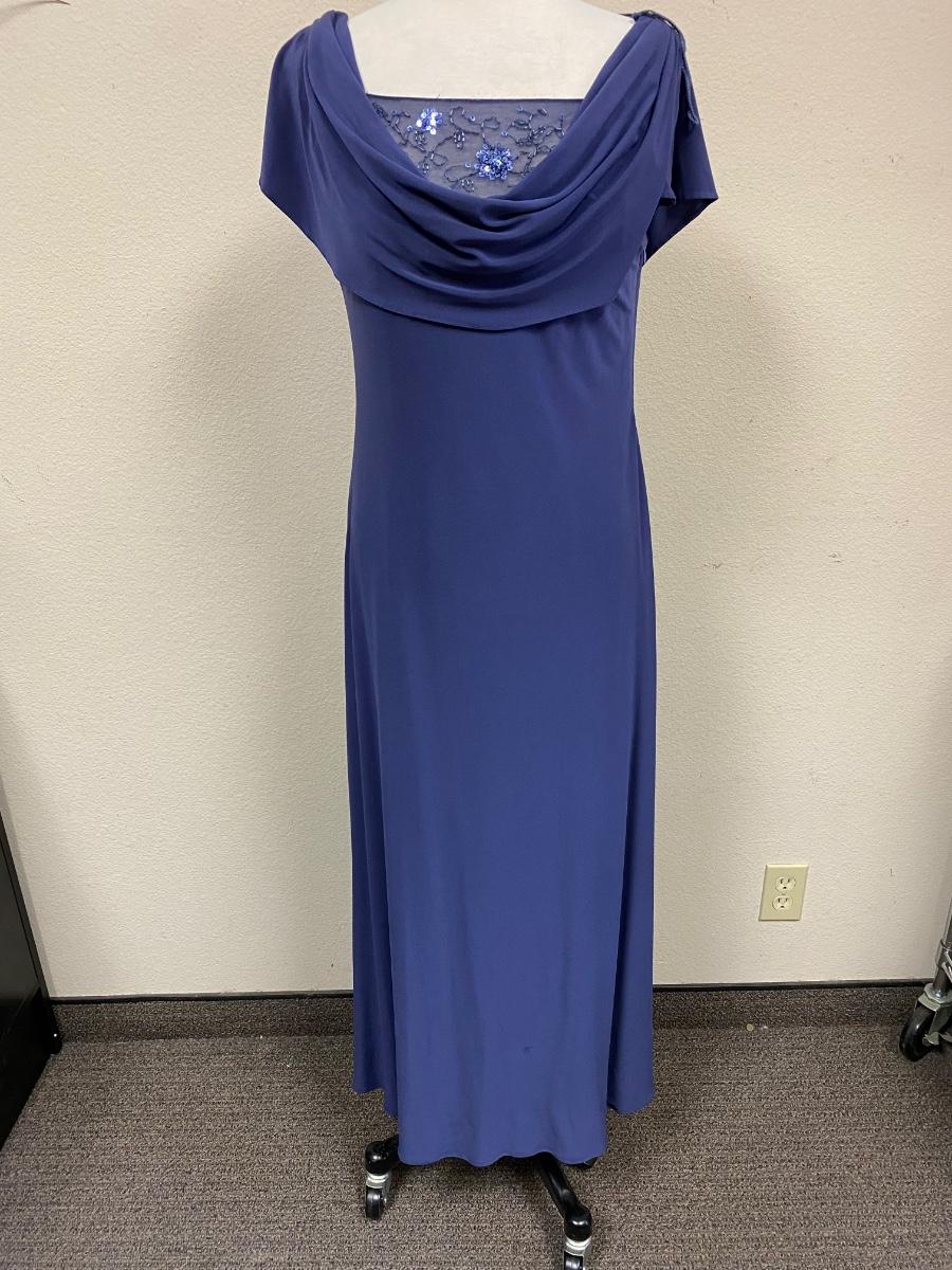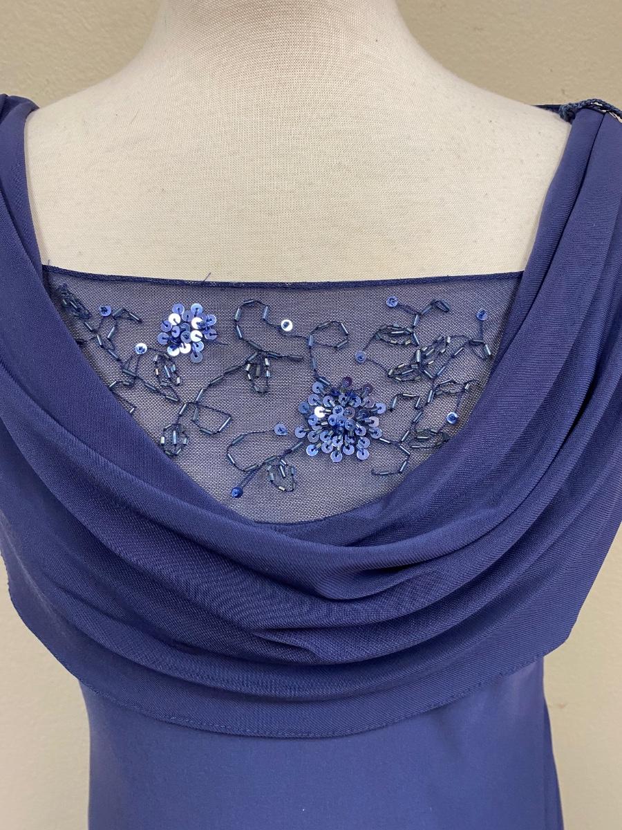 Patra Royal Blue Fitted Floor Length Dress Size 12. Draped collar and back with beaded mesh. There are some missing beads on the back. Side zip for easy on/off. Small snag near the bottom front.