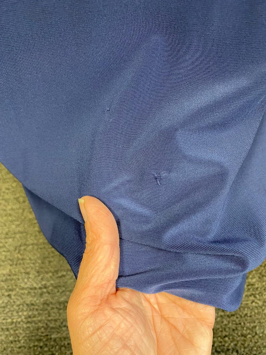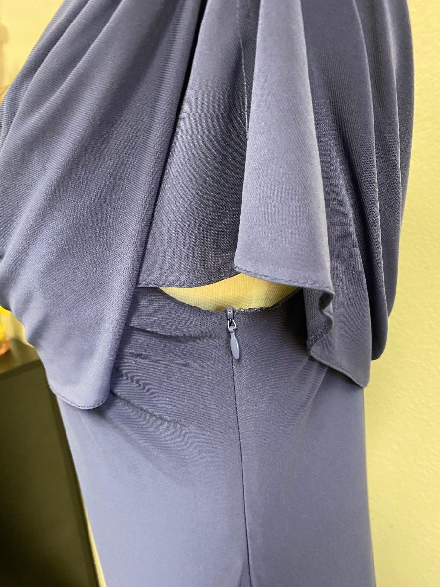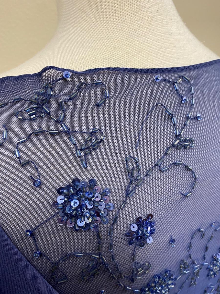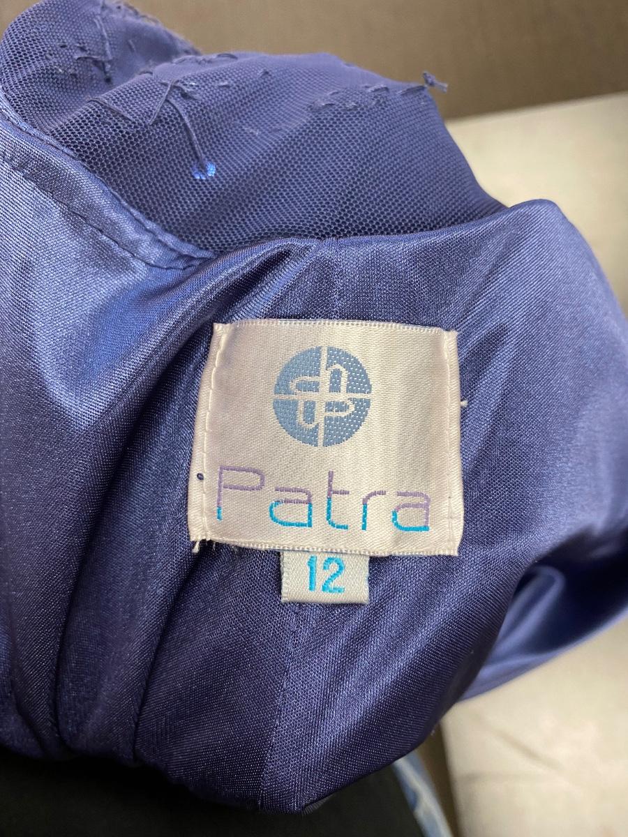 Patra Royal Blue Fitted Floor Length Dress Size 12. Draped collar and back with beaded mesh. There are some missing beads on the back. Side zip for easy on/off. Small snag near the bottom front.
