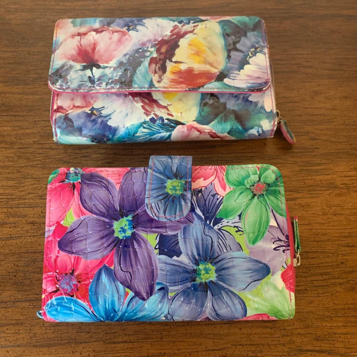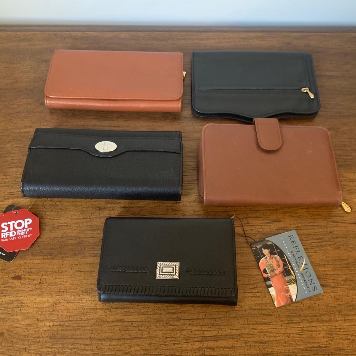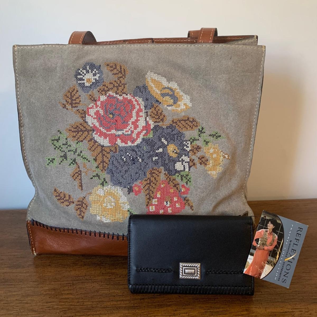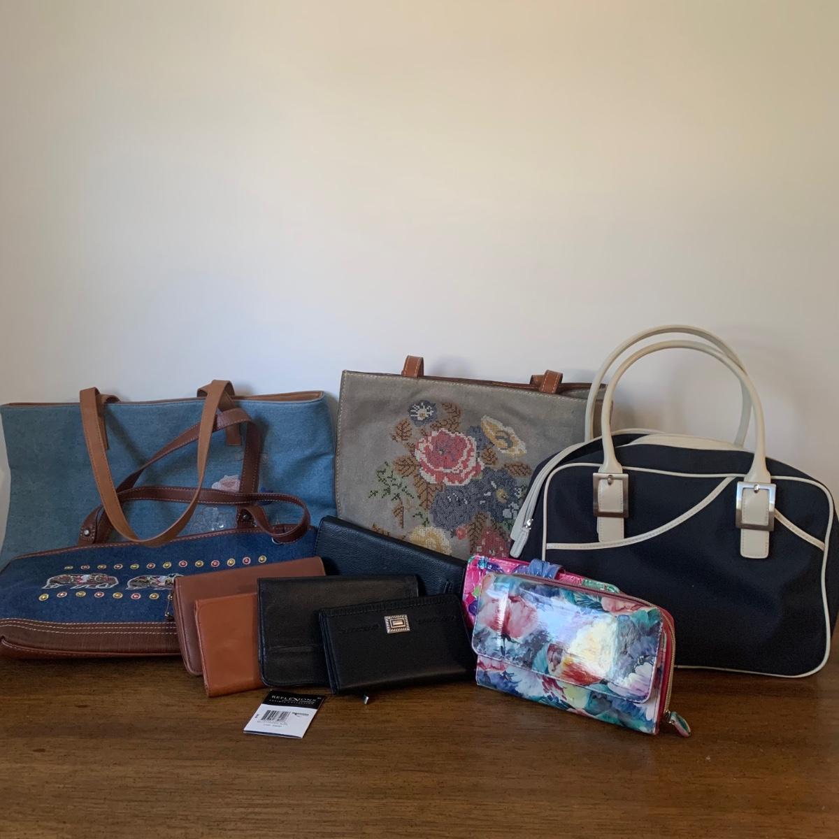 Four handbags and seven wallets. A few of the items are brand new with their original tags still attached. The handbags are by Patricia Nash, Liz Claiborne, Sakroots, and Bueno. The wallets are from Reflexions by Montana Silversmiths, Princess Gardner, Mundi, Rolfs, and Safekeeper. All but the two floral wallets appear to be leather or leather-like. The floral wallets have a vinyl-feel. The largest bag is the Bueno. It is about 18” wide and 14” tall. Each of the items in this collection appear to be in good to like new condition. The Patricia Nash shows some wear on its exterior.