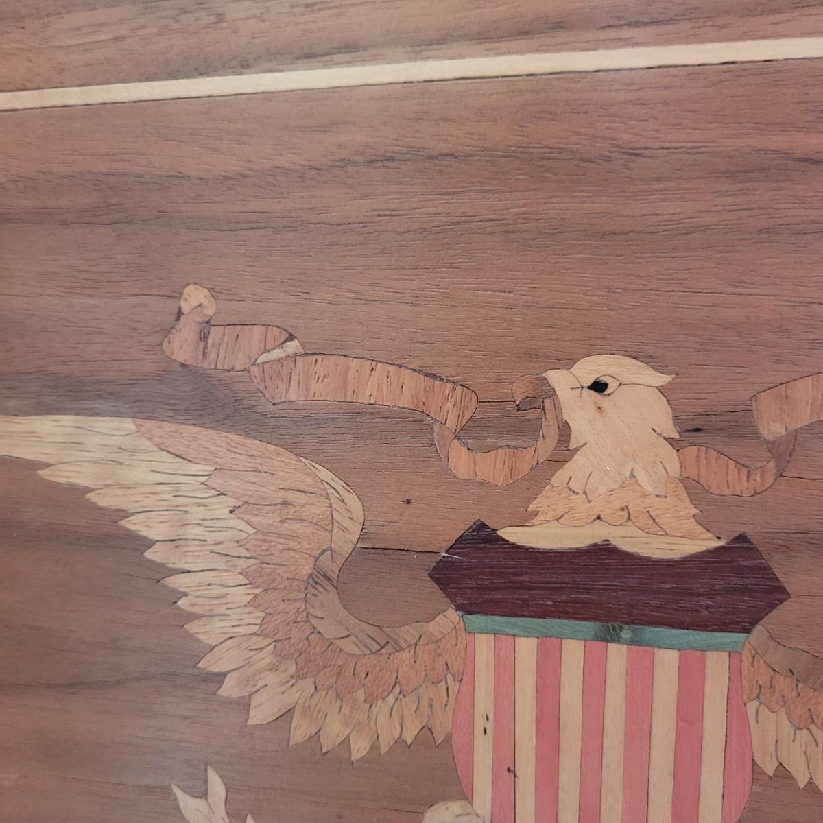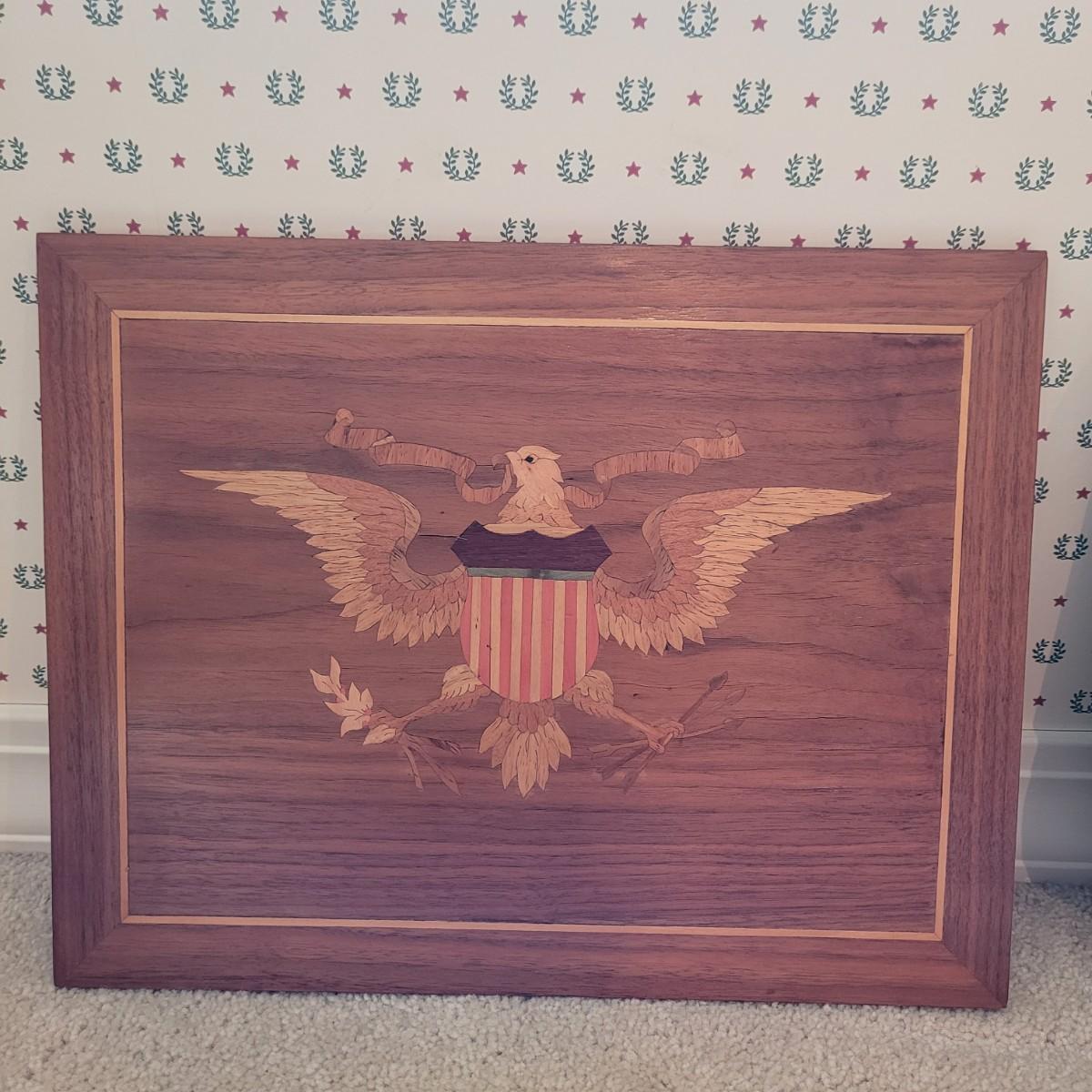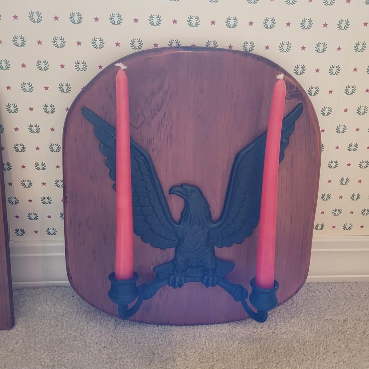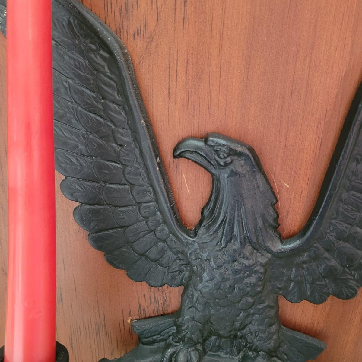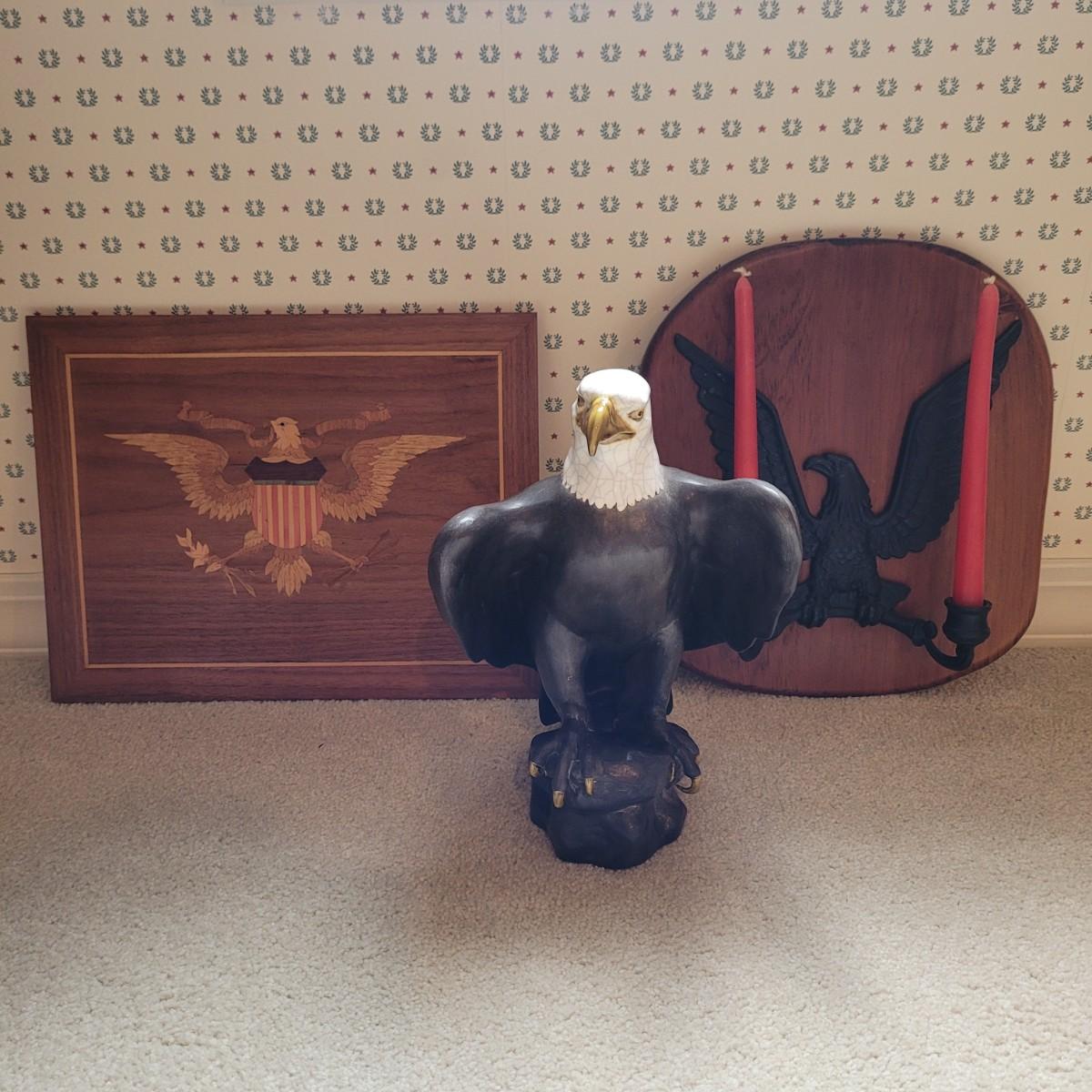 This collection of American Eagle decor includes a signed metal and ceramic sculpture, candle holder plaque, and federal eagle and shield panel with various stained wood inlays. Sculpture measures approximately 8”W (at widest part of wings) x 13”H. Shield panel approximately 12” x 15.5”. Shipping available.
