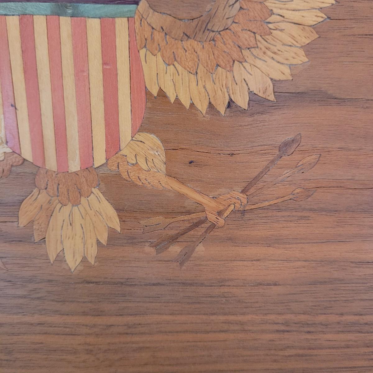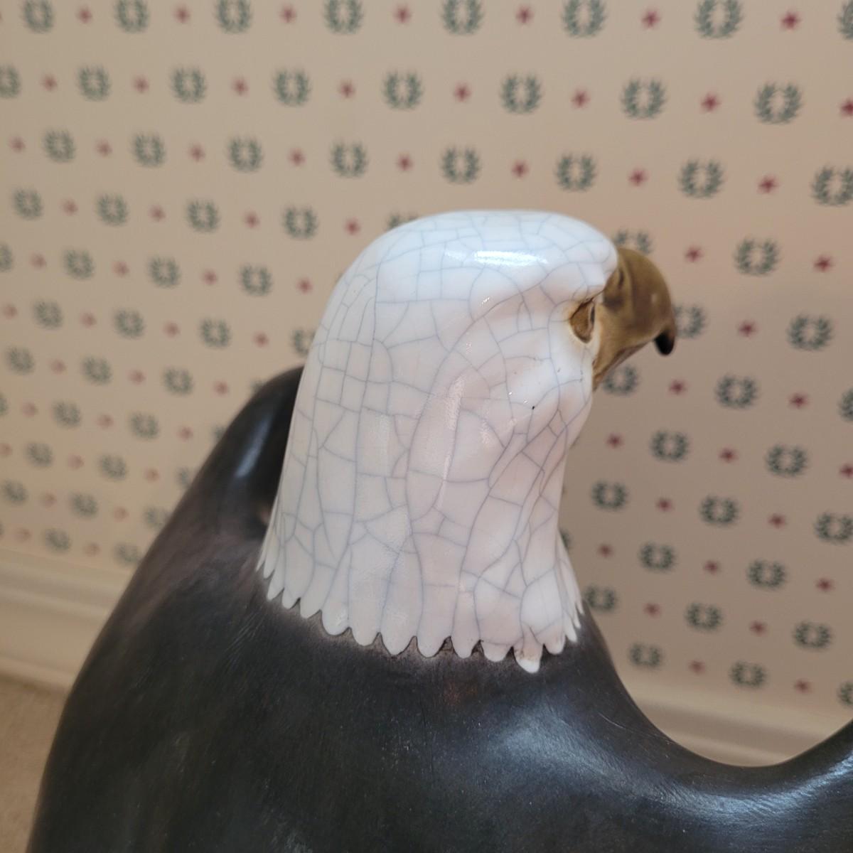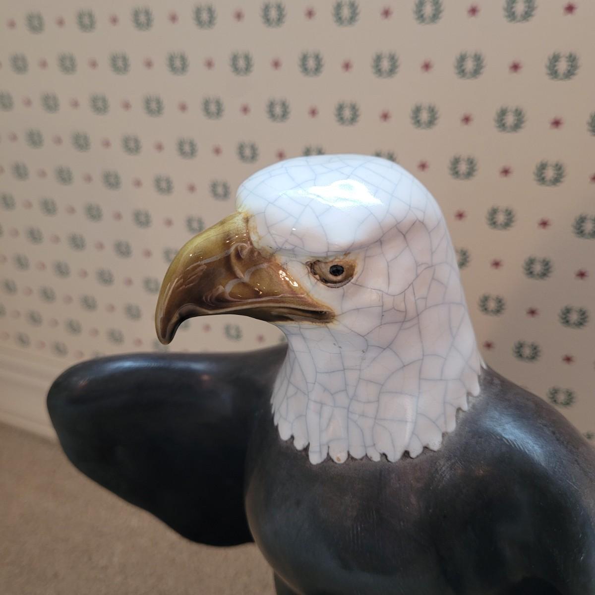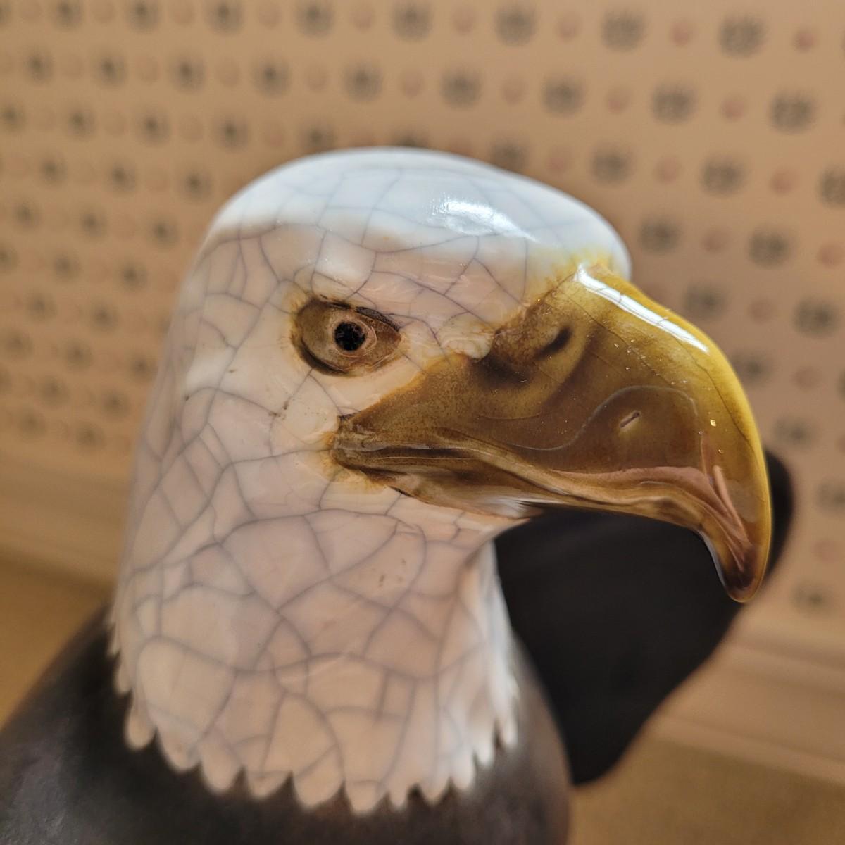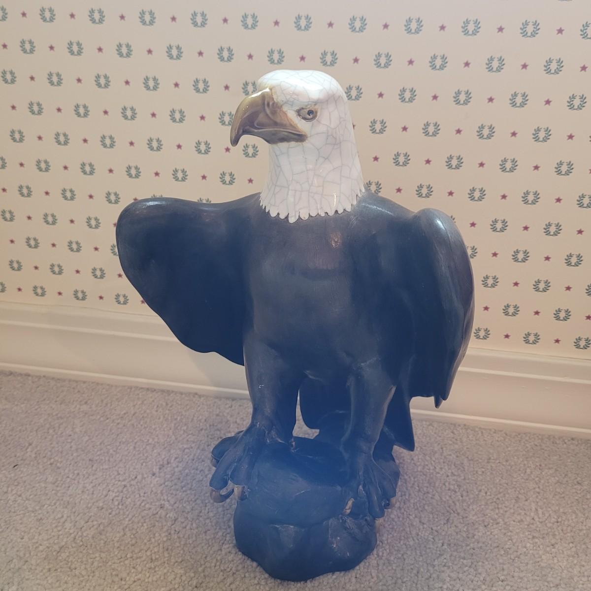 This collection of American Eagle decor includes a signed metal and ceramic sculpture, candle holder plaque, and federal eagle and shield panel with various stained wood inlays. Sculpture measures approximately 8”W (at widest part of wings) x 13”H. Shield panel approximately 12” x 15.5”. Shipping available.