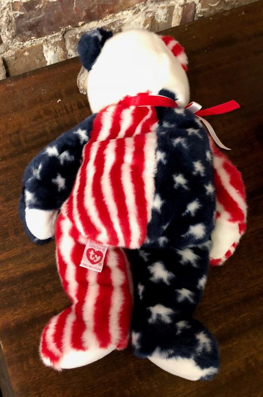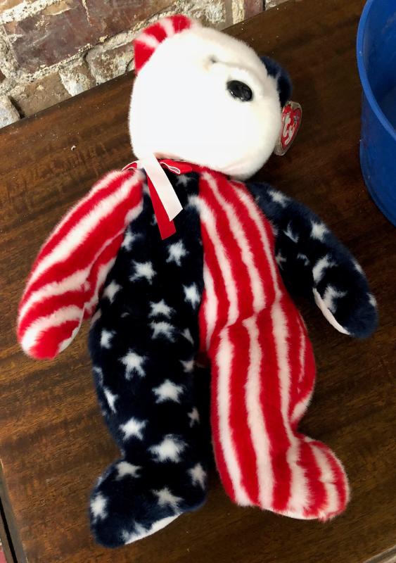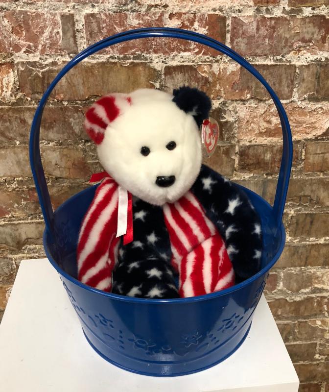 PATRIOTIC BEANIE BABY PLUSH BEAR DOLL w/ BLUE BUCKET