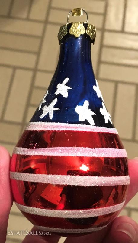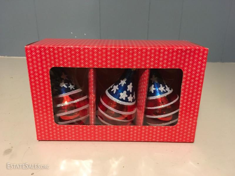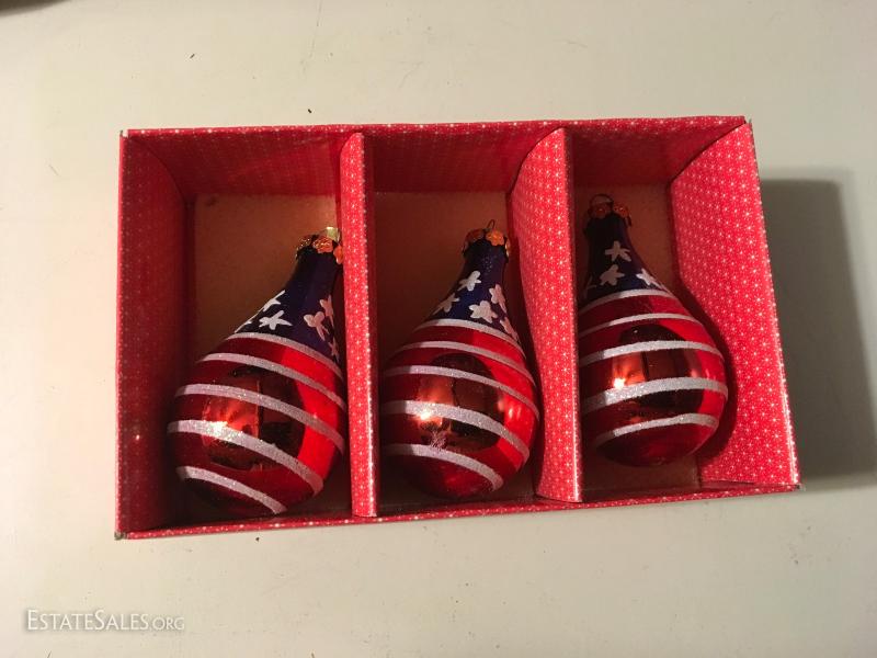 Set of three red, white and blue Christmas ornaments, still in their original box.