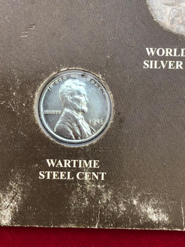 Lot of three war time coins, silver dime and nickel, steel penny. Cardboard cover shows wear.