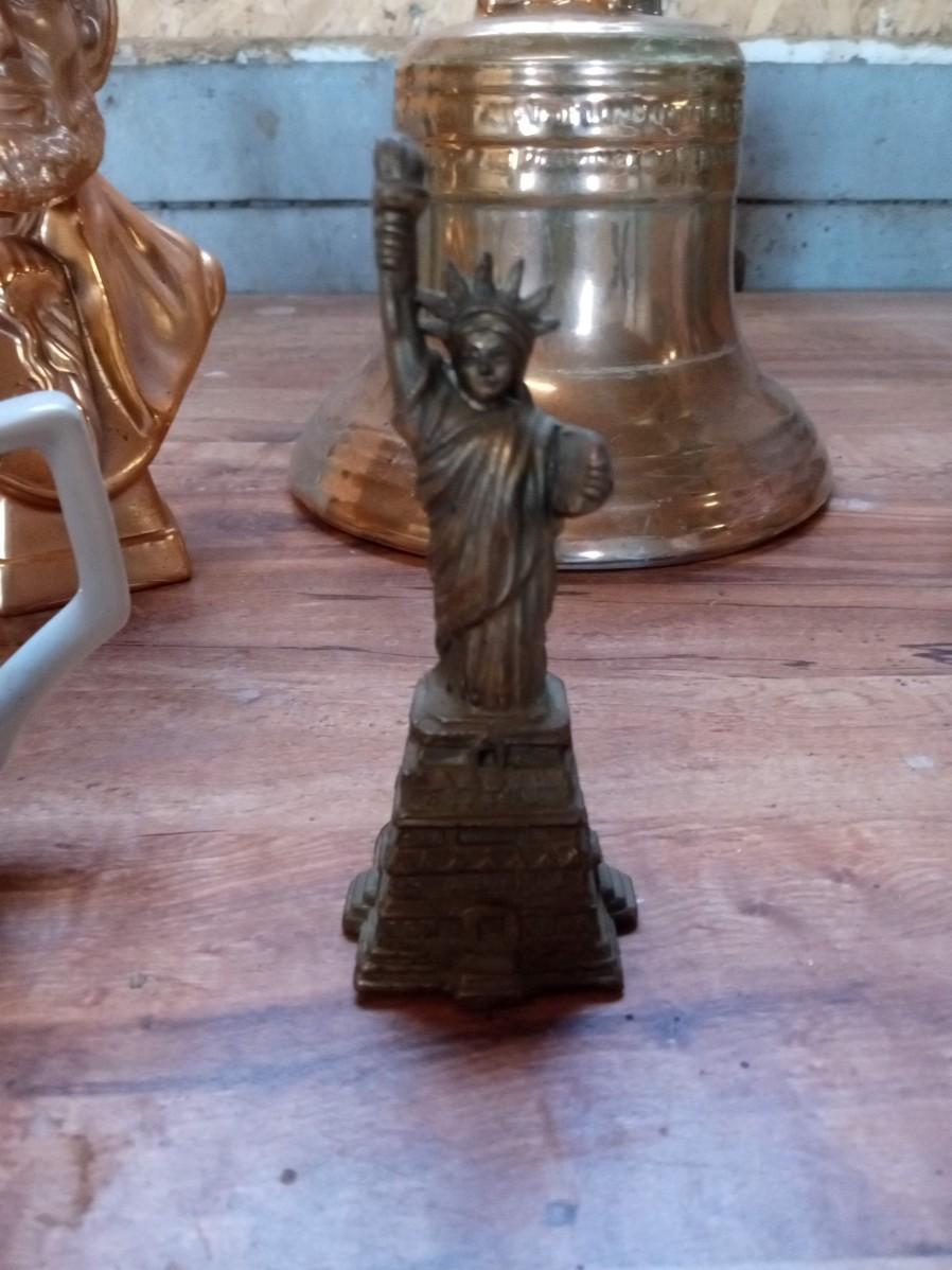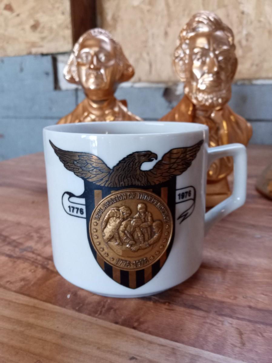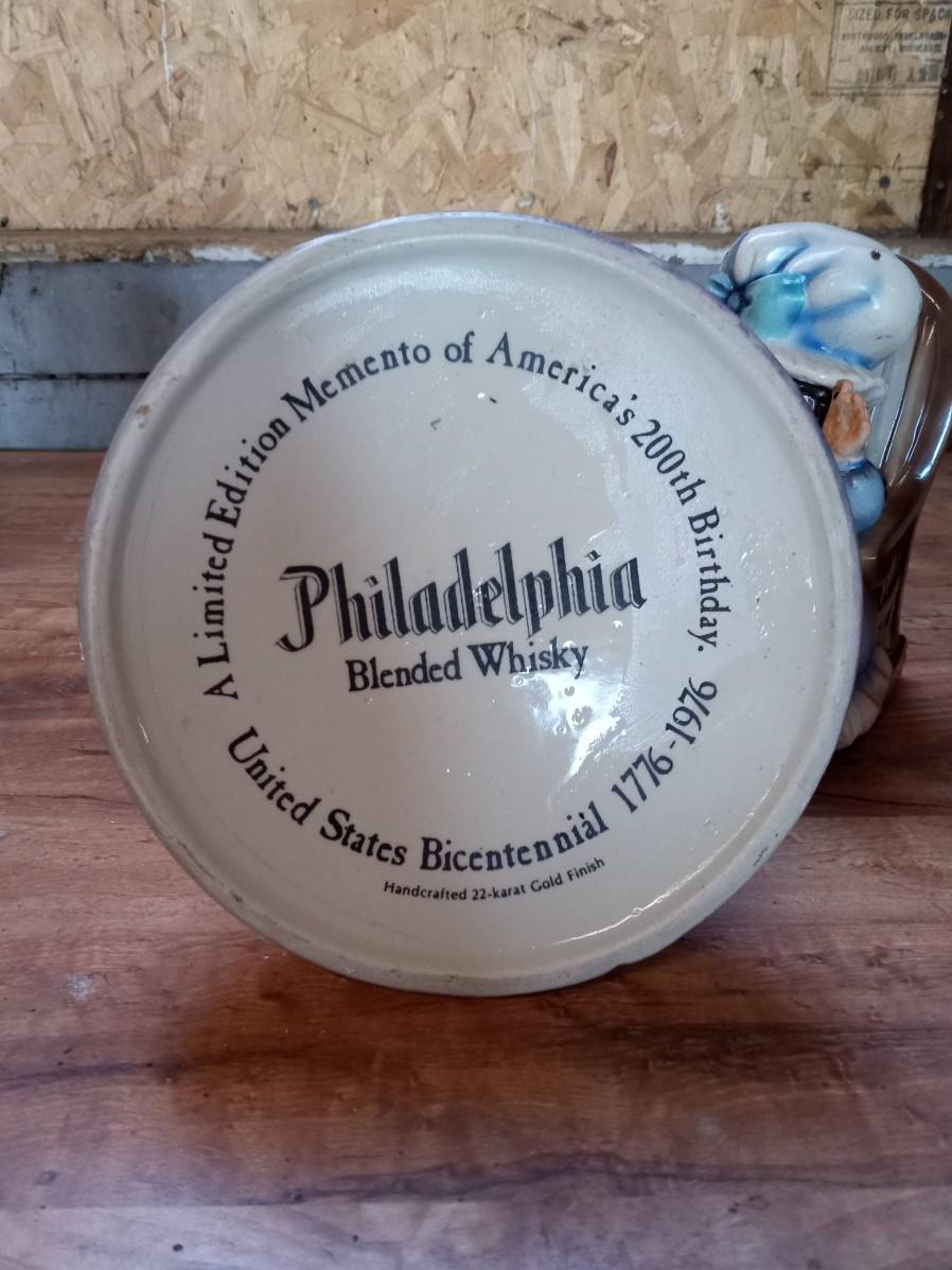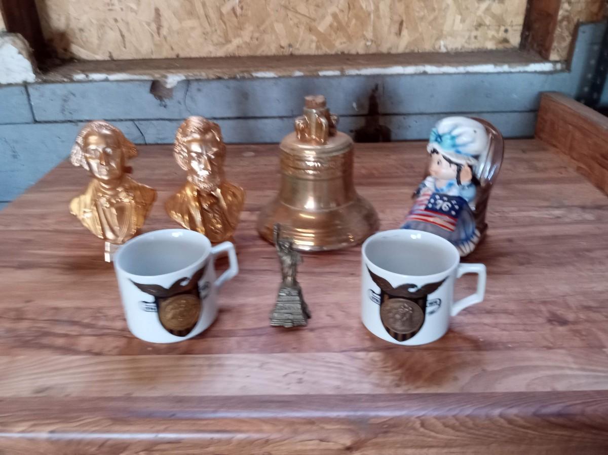 PHILADELPHIA BLENDED WHISKEY DECANTER, ROCKING MUSIC BOX, 2 AVON BUSTS (FULL), 2 COFFEE MUGS AND A BRONZE STATUE OF LIBERTY