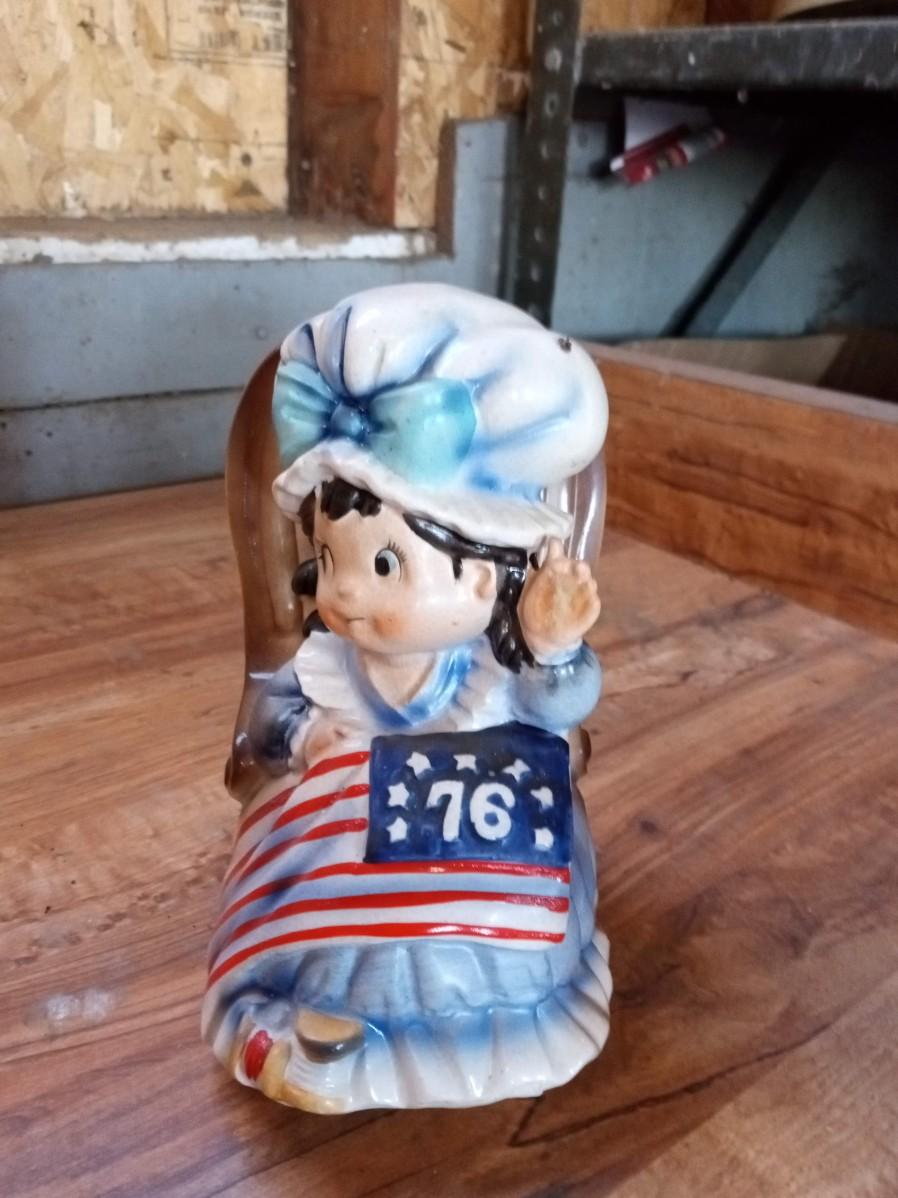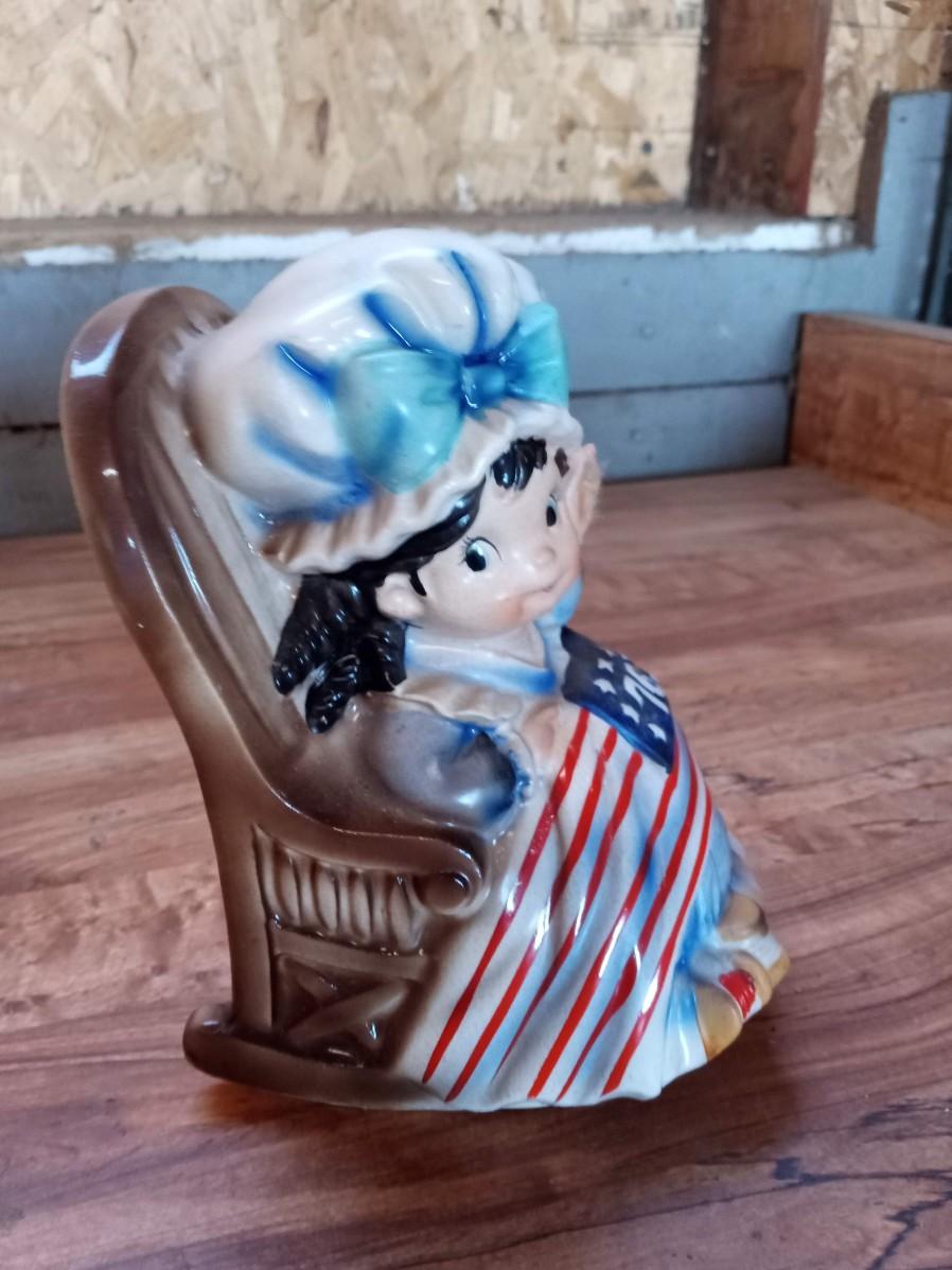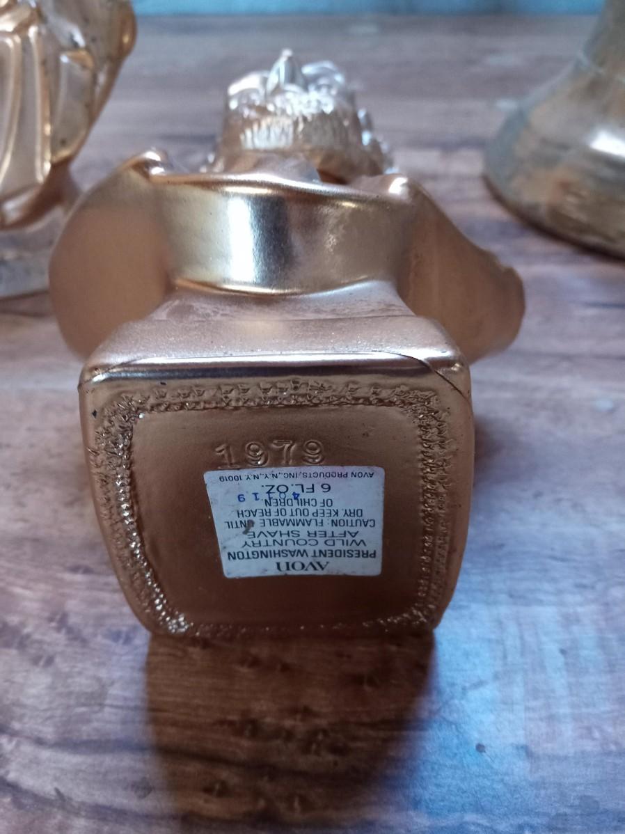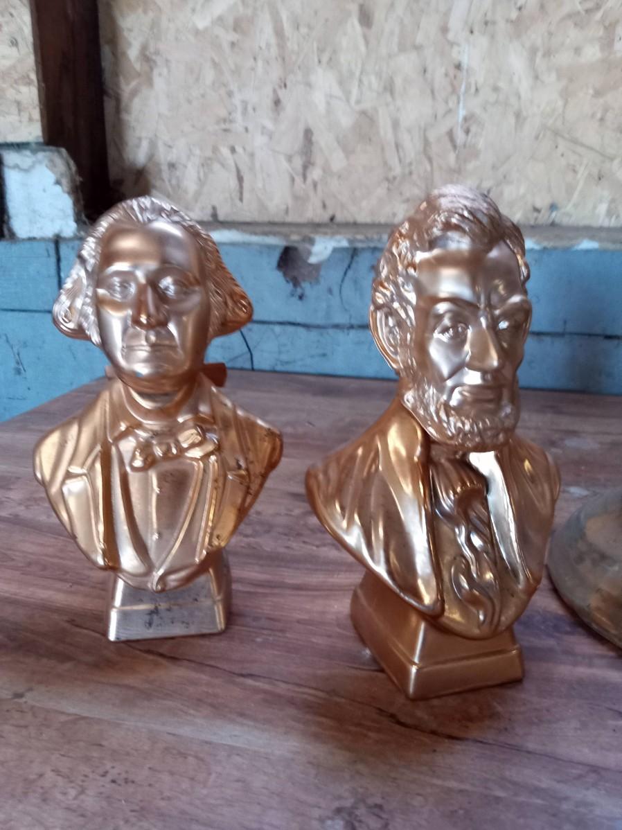 PHILADELPHIA BLENDED WHISKEY DECANTER, ROCKING MUSIC BOX, 2 AVON BUSTS (FULL), 2 COFFEE MUGS AND A BRONZE STATUE OF LIBERTY