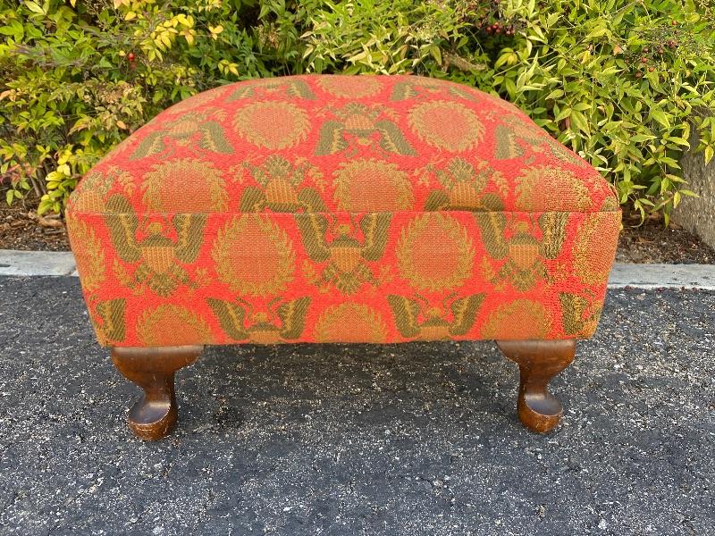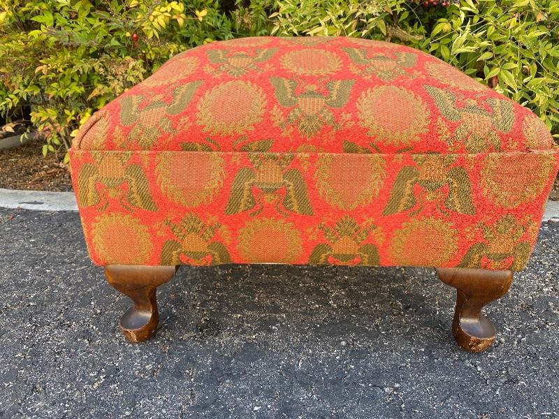 Vintage patriotic footstool ottoman. Red background with a greenish gold eagle and wreath pattern. Cushion top looks a little lumpy from age. No rips, holes, or spots. Wood feet. Measures 17"x21".