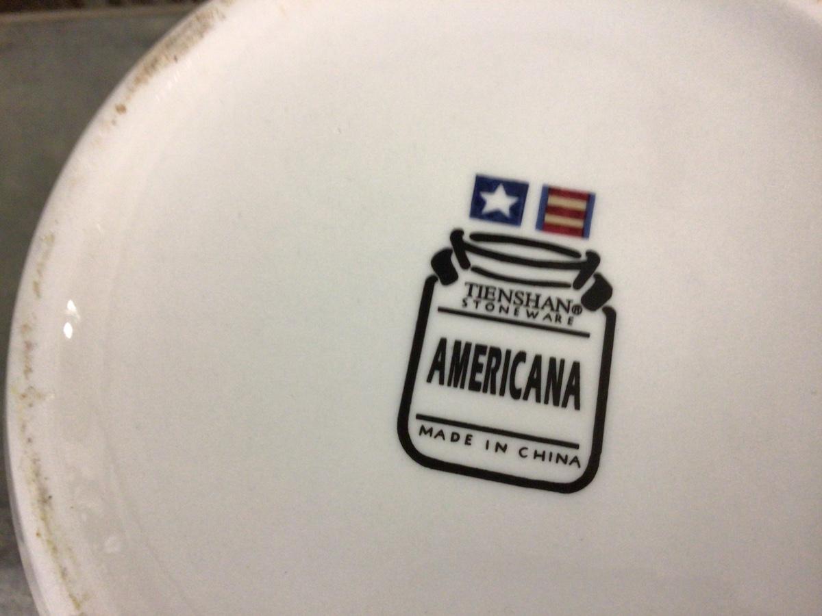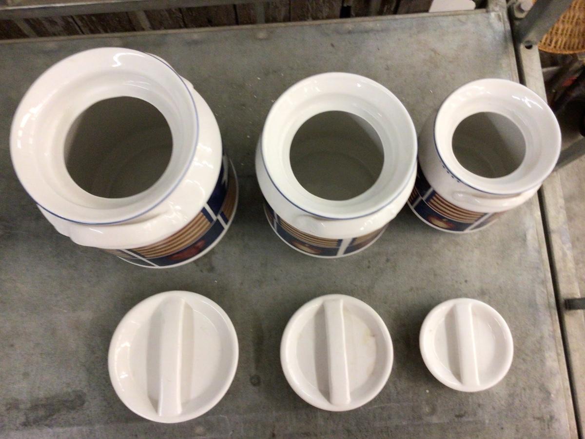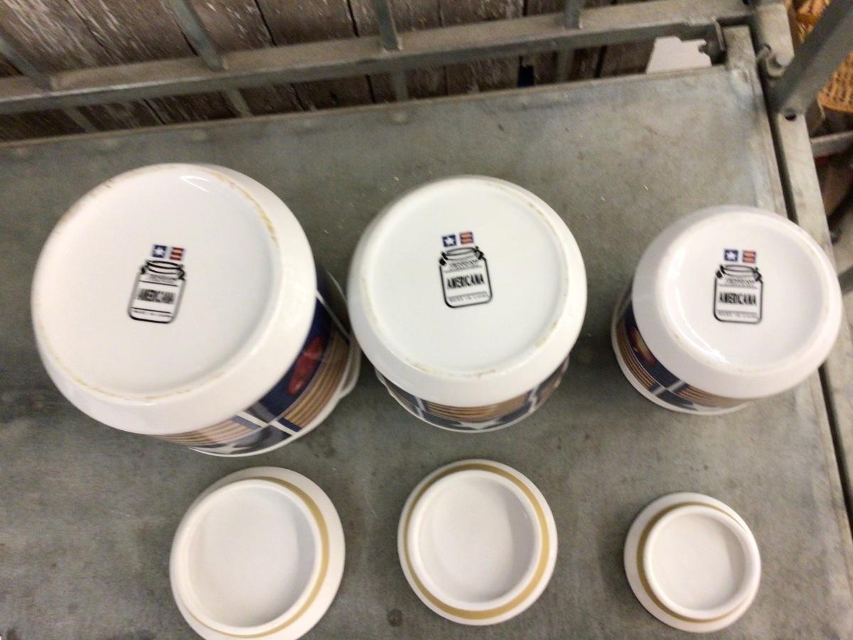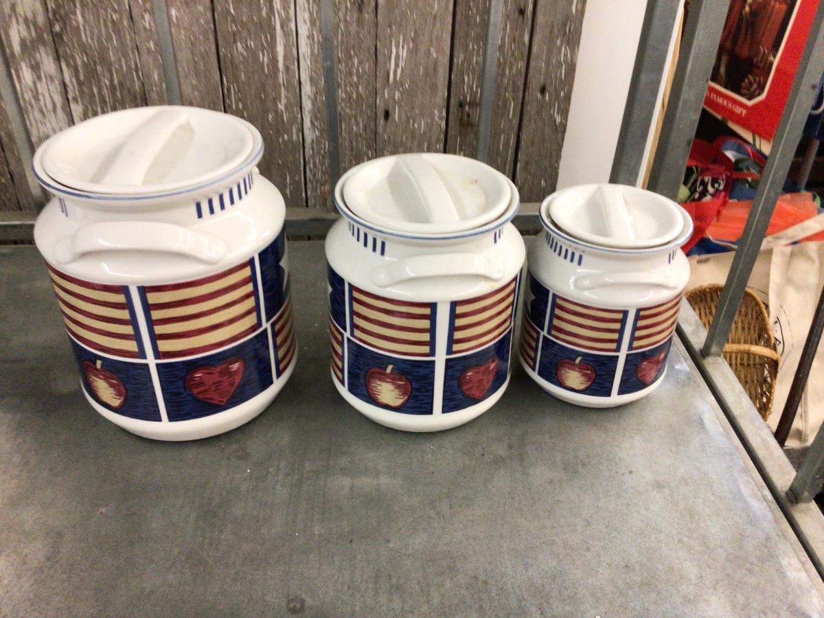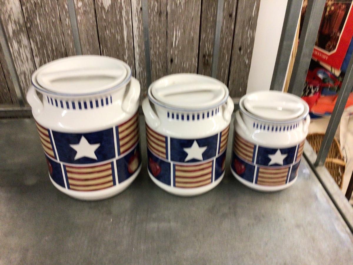 This modern Patriotic Canister Set. They are milk cans all three have rubber seals. Tienshaw Stoneware pottery Americana set.