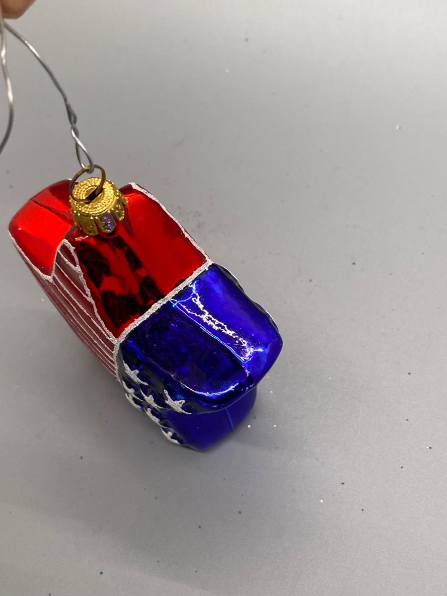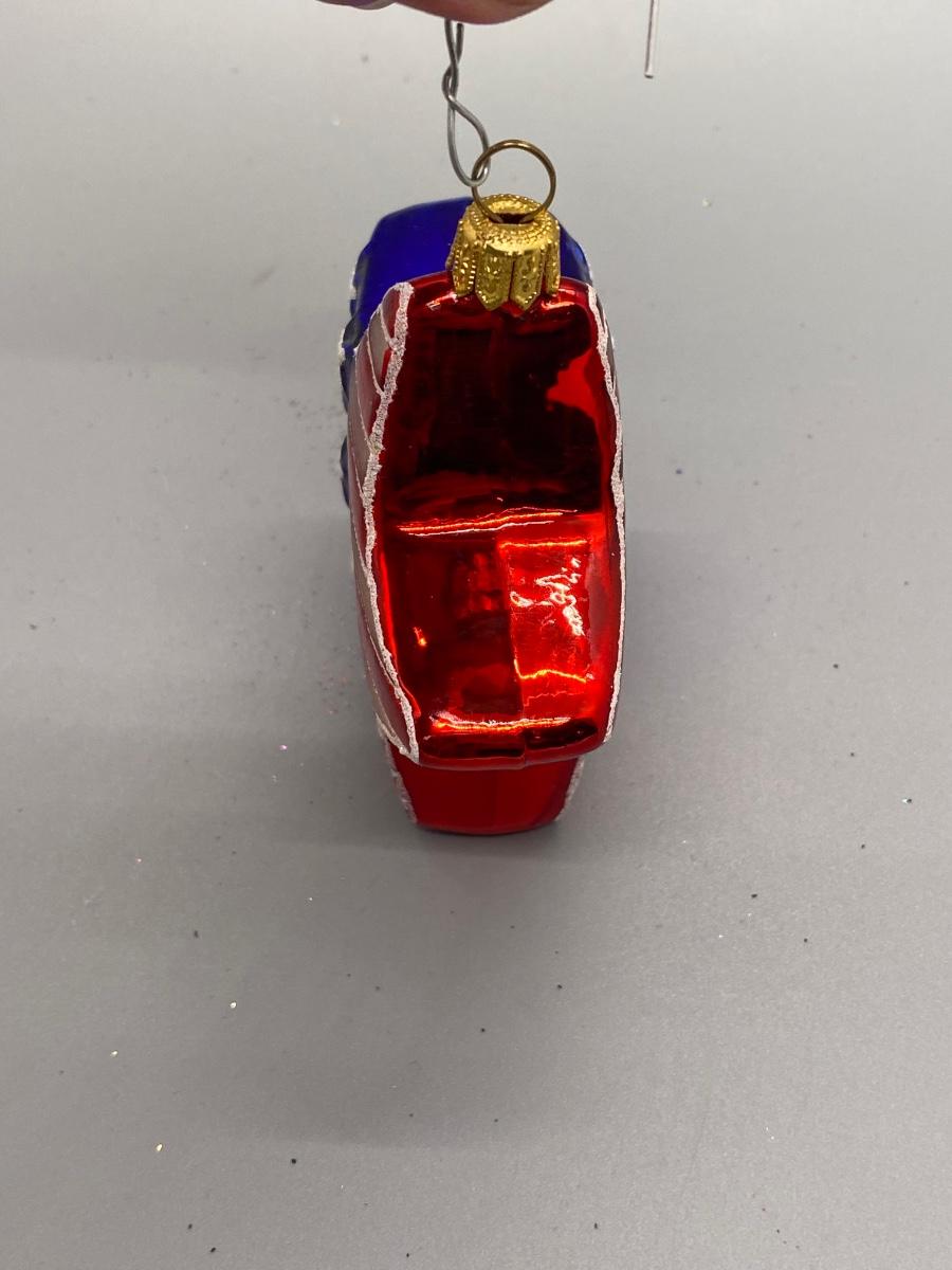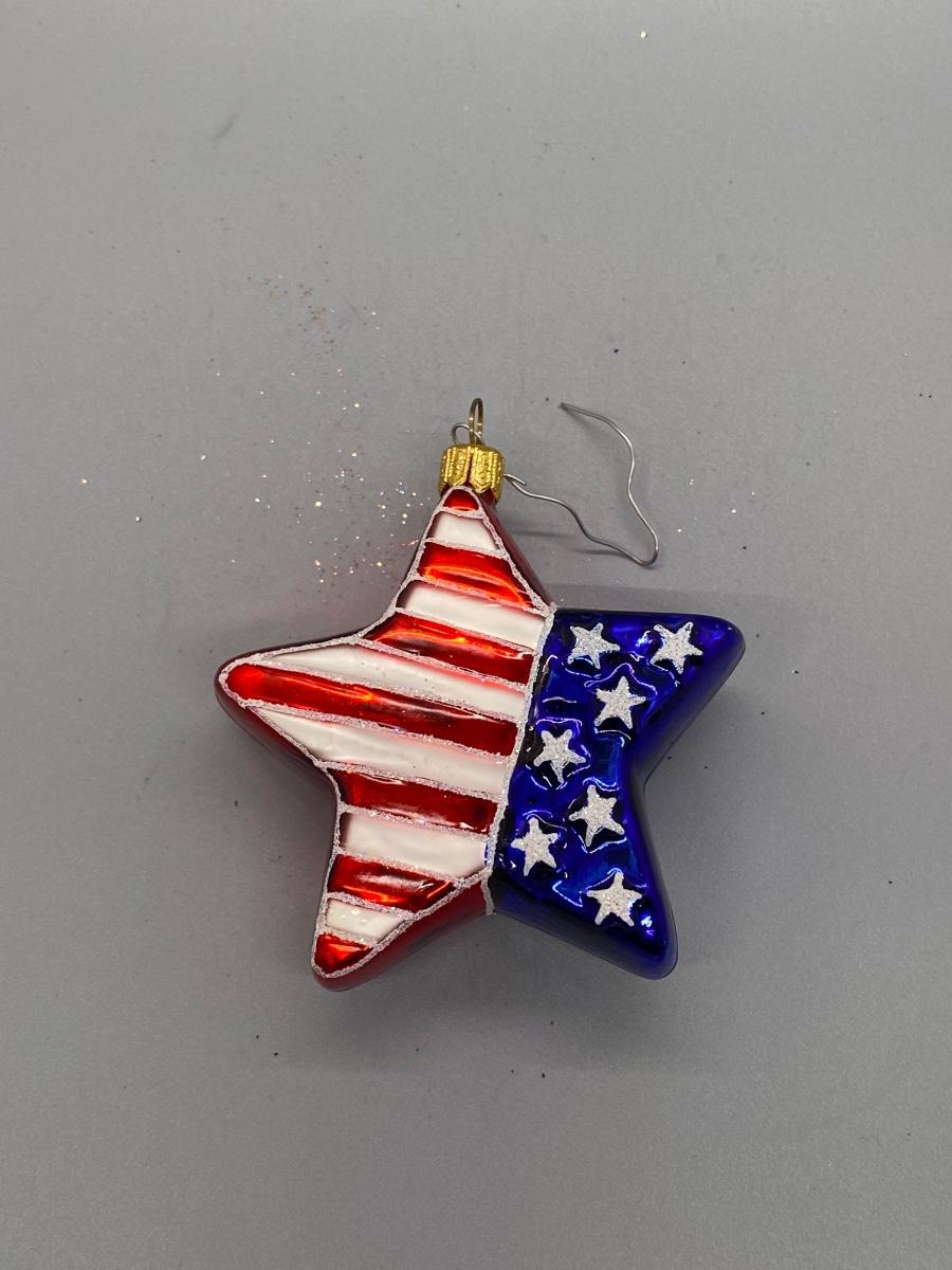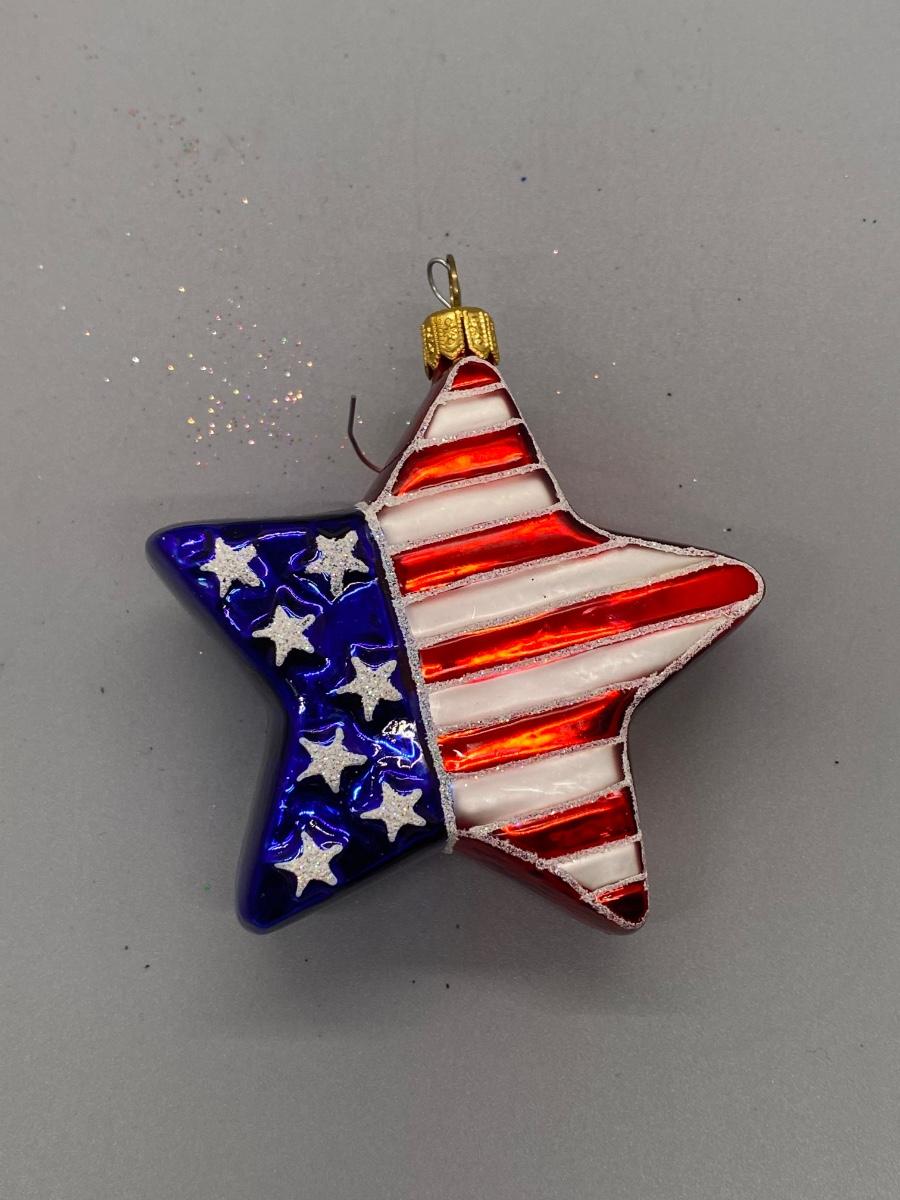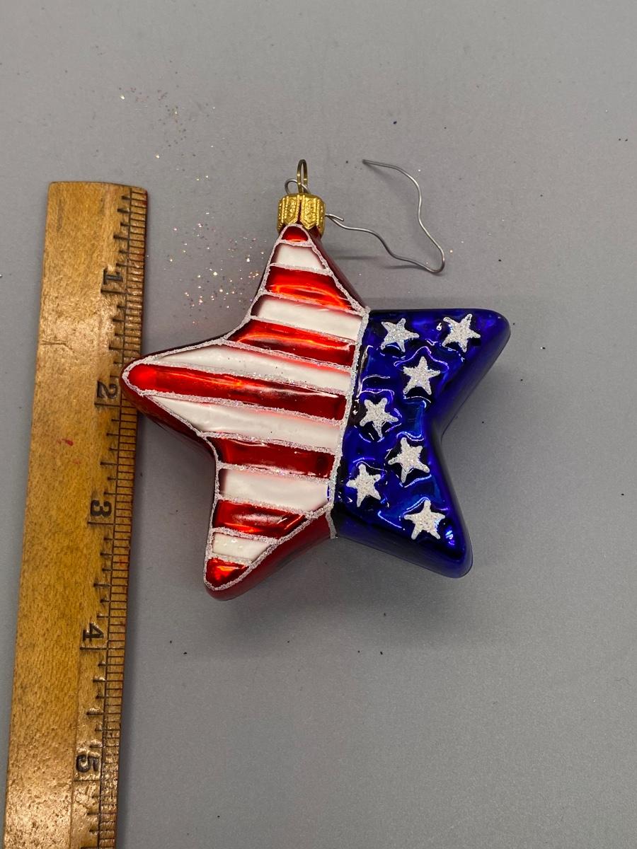 Star shaped blown glass Christmas holiday ornament with the American flag design on it. In good condition. Can be displayed year-round. About 4" size.