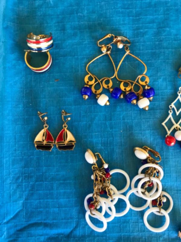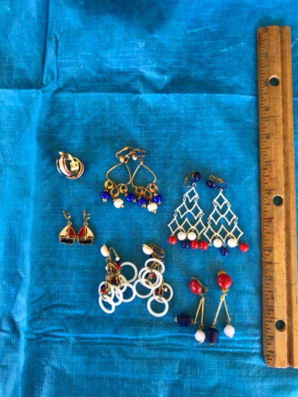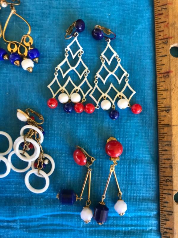 6 pairs of vintage clip earrings. Goldtone patriotic, red white and blue.