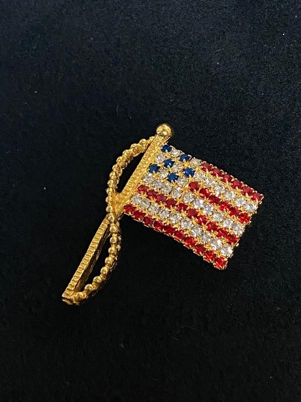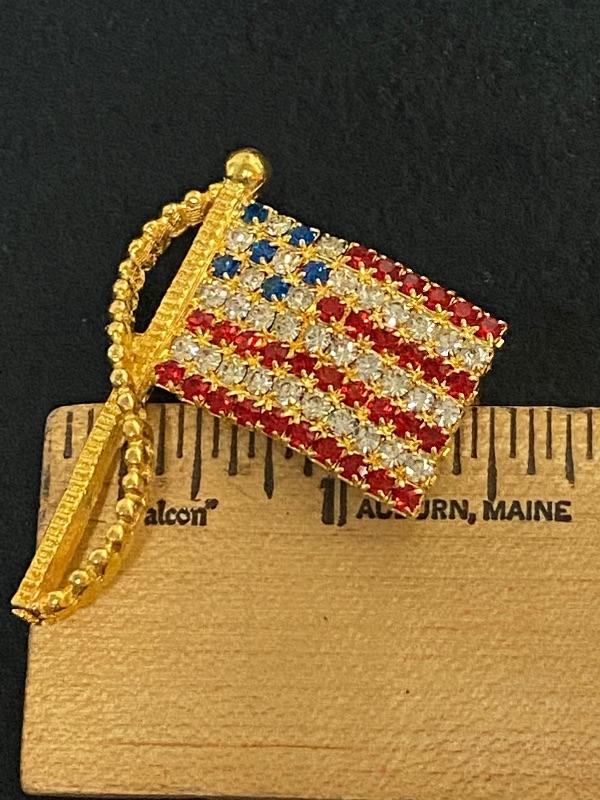 American Flag Pin. Brilliant red, white, and blue rhinestones in a goldtone setting. It is marked on the back but can not make it out. About 2" in length.