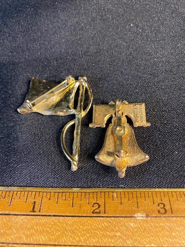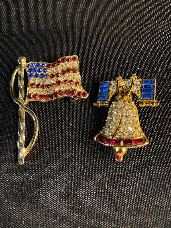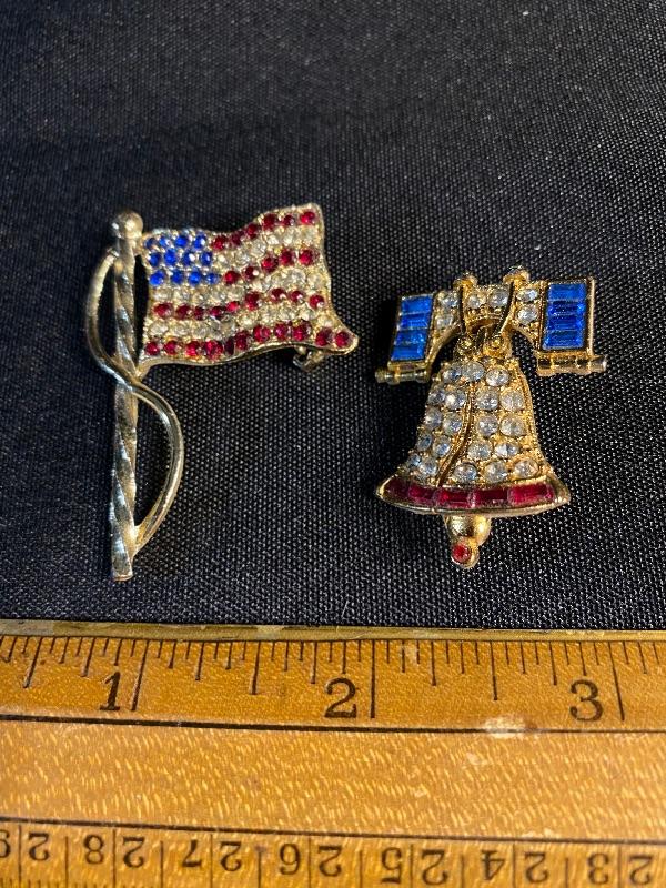 Patriotic Rhinestone Flag Brooch and Liberty Bell