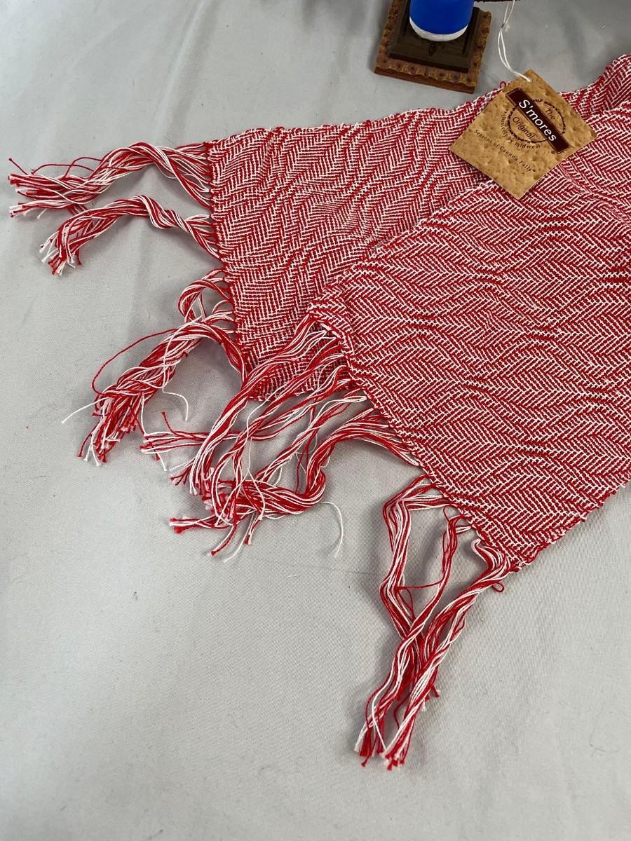 In great condition. The scarf would be more of a piece that I would use on a talble or buffet as it is a keitted thread and not yarn. The scarf is about 72 inches.<br />