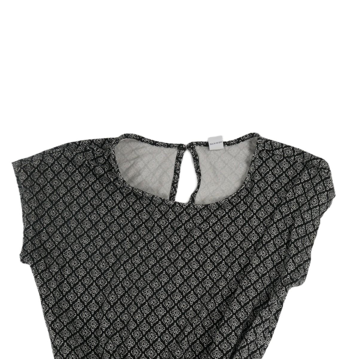 Black and white patterned romper with pockets and waist tie, women's size XS.