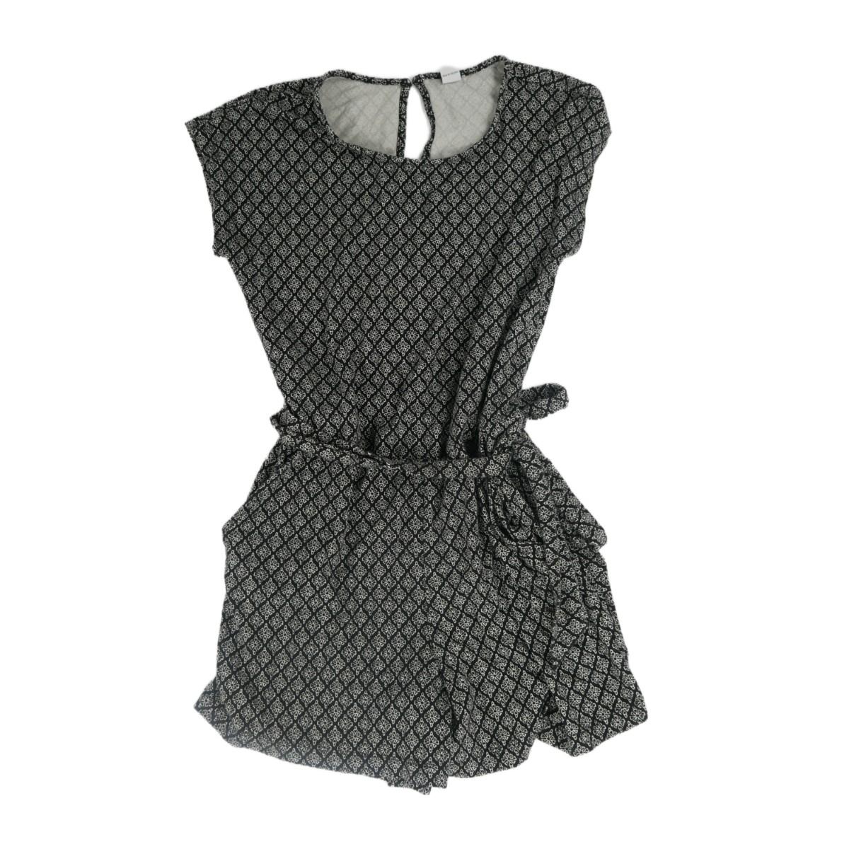 Black and white patterned romper with pockets and waist tie, women's size XS.