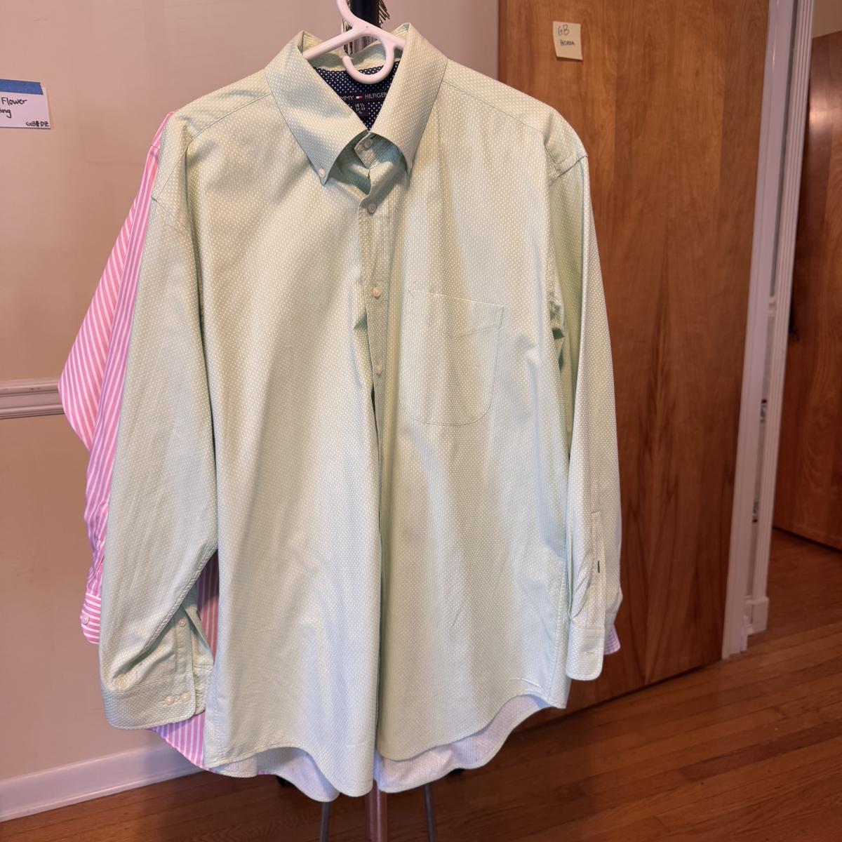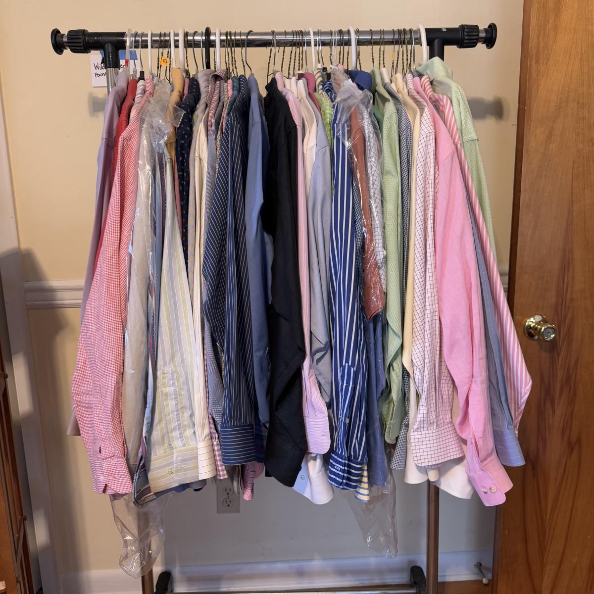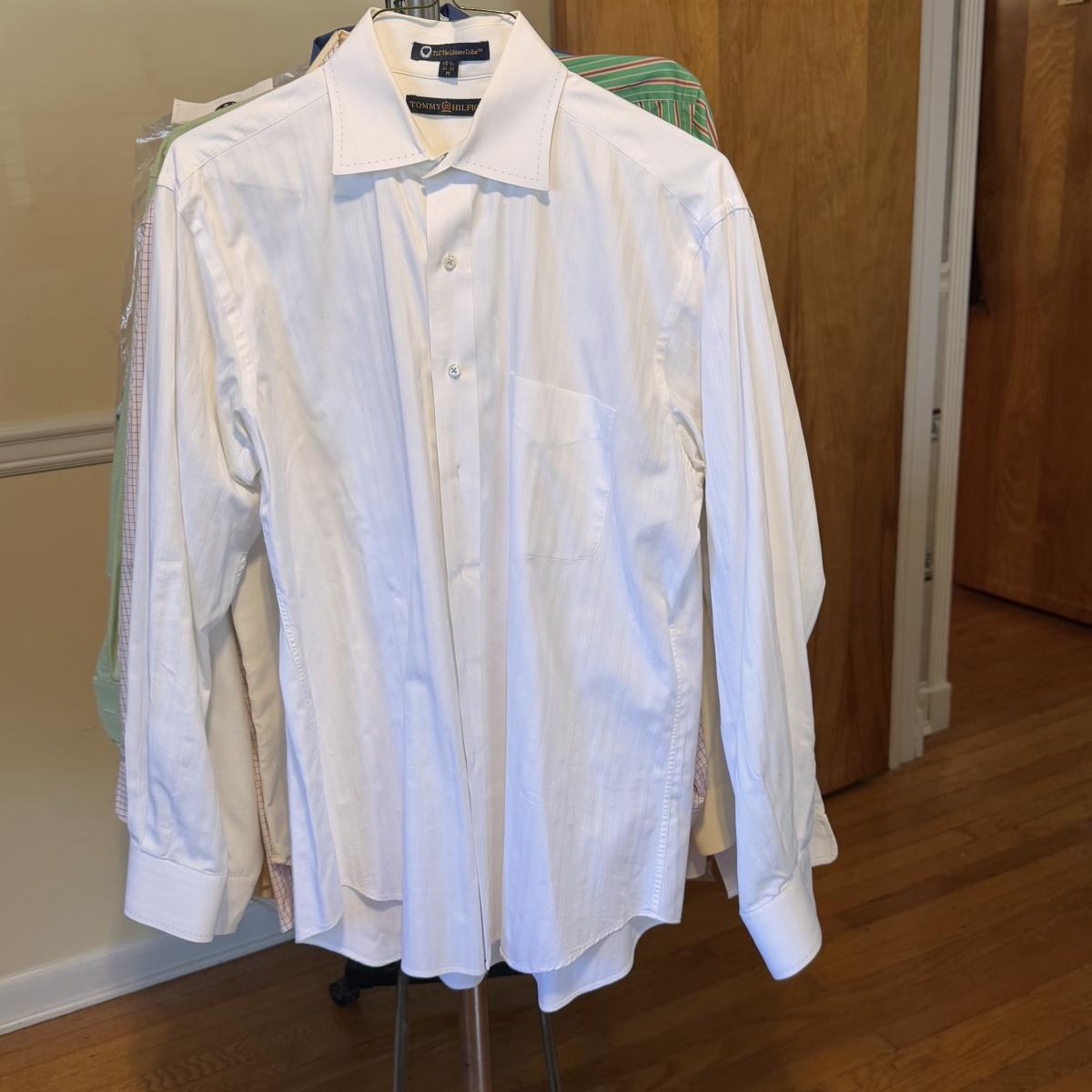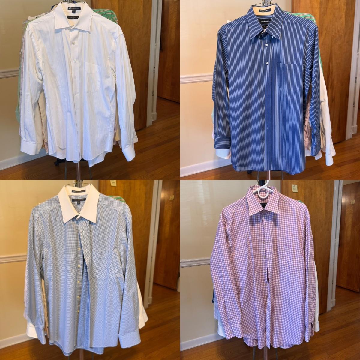 Lot includes over thirty men’s long sleeve button-ups, all in size medium or large. You’ll find shirts by Paul Frederick, Tommy Hilfiger, Scott Barber, Jos. A. Bank, Daniel Cremieux, and more. Shipping available.