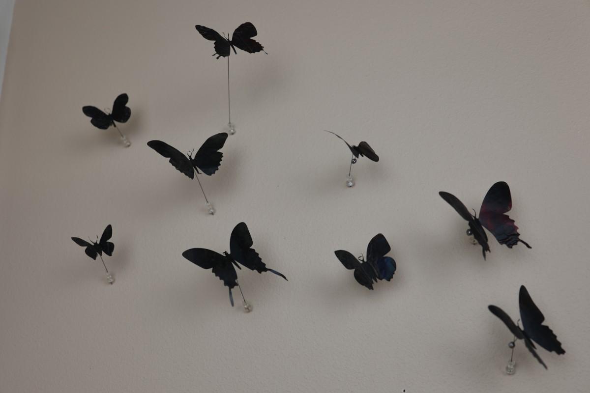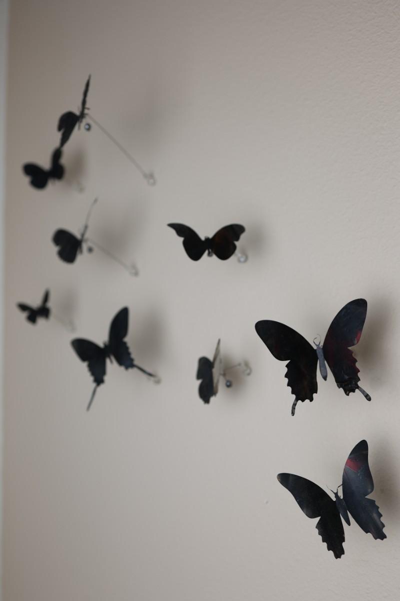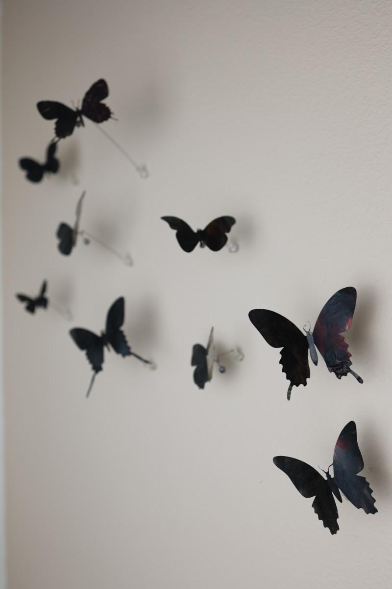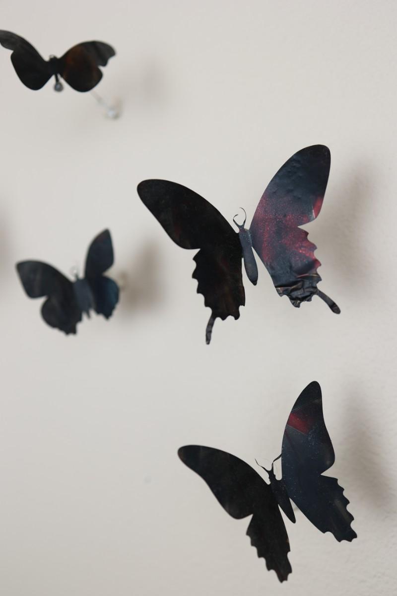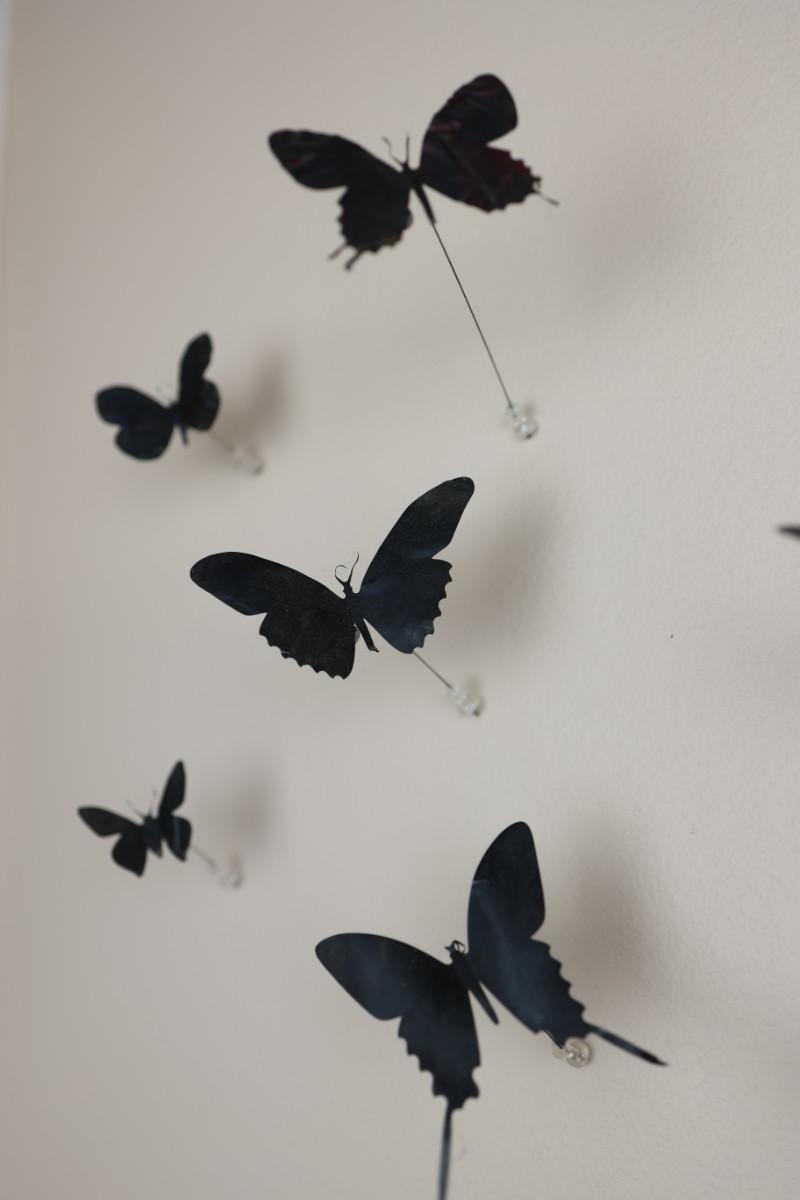 “I am drawn to humble, yet evocative materials; in this case, crushed aluminum cans from the streets of New York - every one of them once raised to someone’s lips. My process of “recycling” them into images of butterflies is a quiet physical meditation, a yoga of tin snips and files and fingers. As the butterflies alight on the walls of my studio, they lead into an exploration of formal, painterly issues. They function both as marks in these abstract, three-dimensional “paintings,” and as actors in curious narratives. Finally, the butterflies operate symbolically, and I try to develop a conceptual unity between materials, process, and imagery: metamorphosing littered beer cans into flocks of butterflies mirrors the act of transformation and rebirth that symbolize across all cultures.” - Paul Villinski