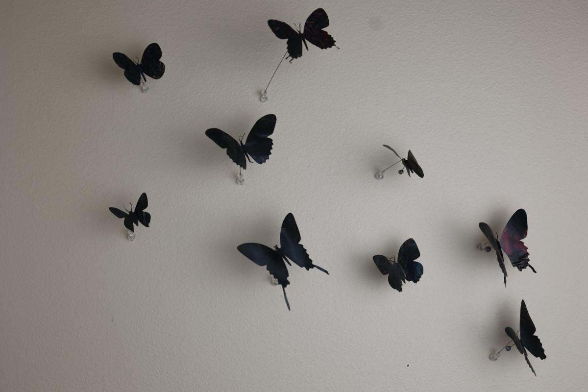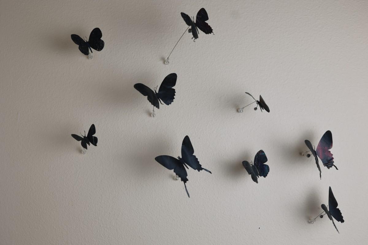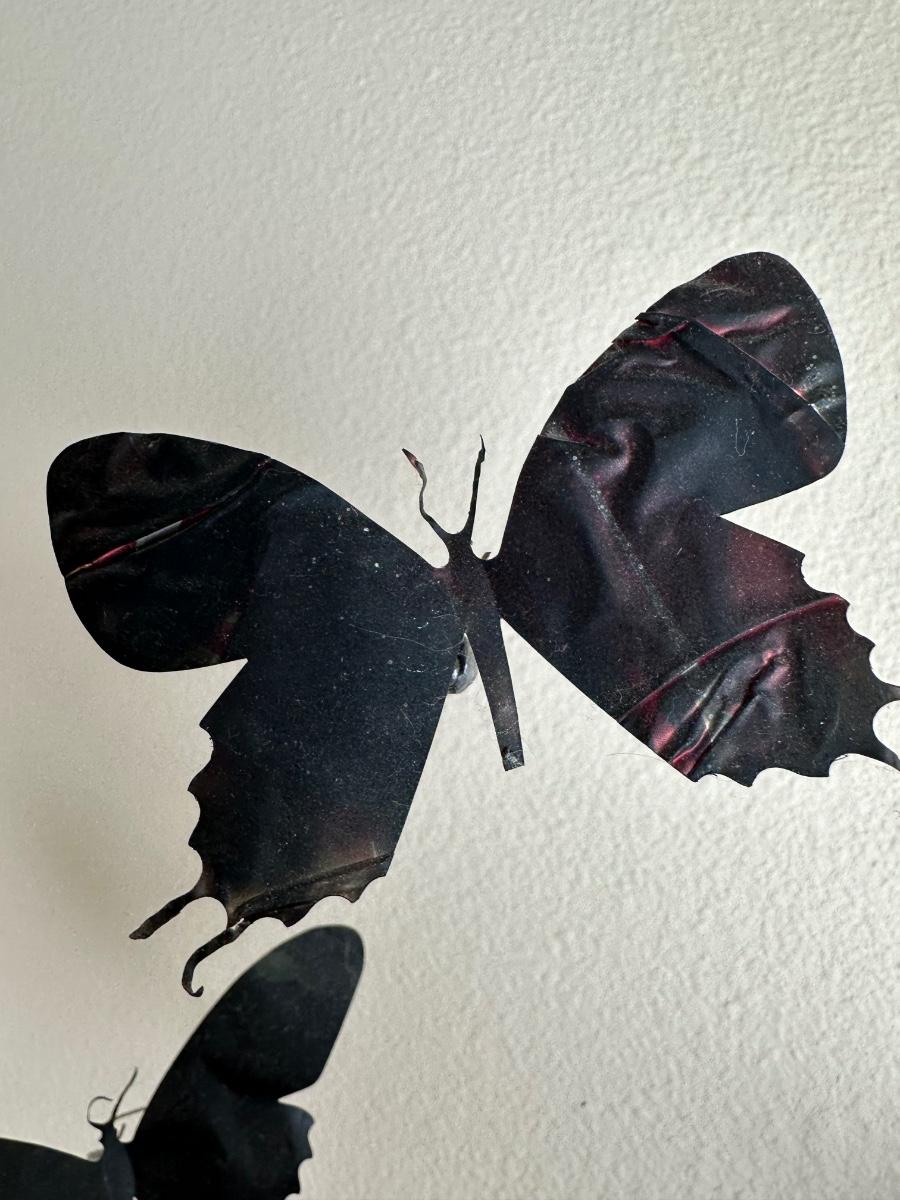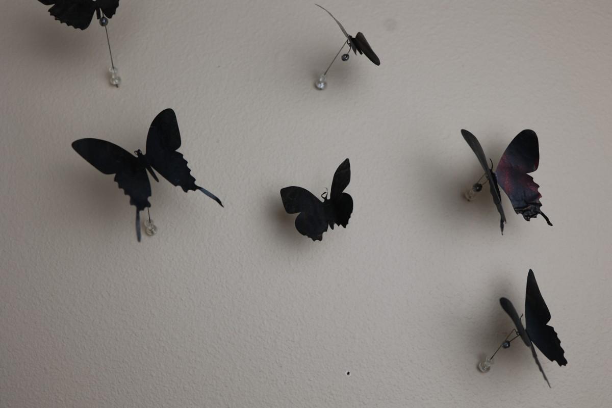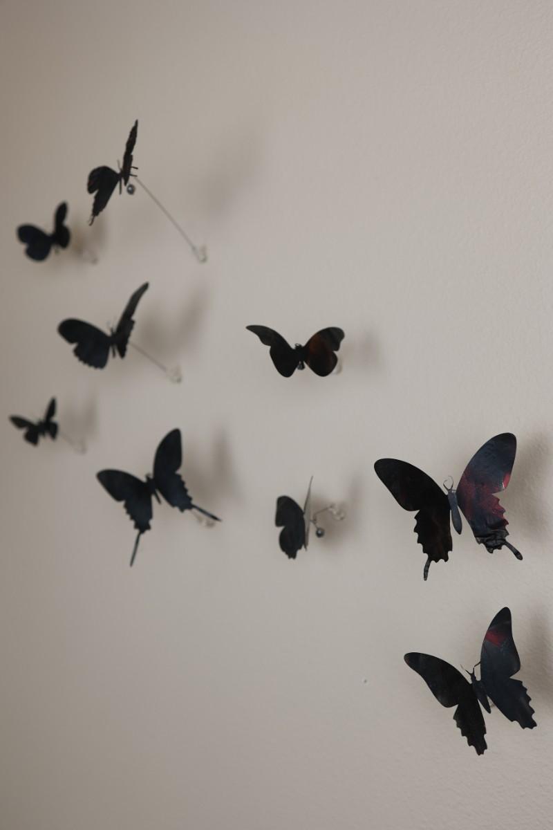 “I am drawn to humble, yet evocative materials; in this case, crushed aluminum cans from the streets of New York - every one of them once raised to someone’s lips. My process of “recycling” them into images of butterflies is a quiet physical meditation, a yoga of tin snips and files and fingers. As the butterflies alight on the walls of my studio, they lead into an exploration of formal, painterly issues. They function both as marks in these abstract, three-dimensional “paintings,” and as actors in curious narratives. Finally, the butterflies operate symbolically, and I try to develop a conceptual unity between materials, process, and imagery: metamorphosing littered beer cans into flocks of butterflies mirrors the act of transformation and rebirth that symbolize across all cultures.” - Paul Villinski