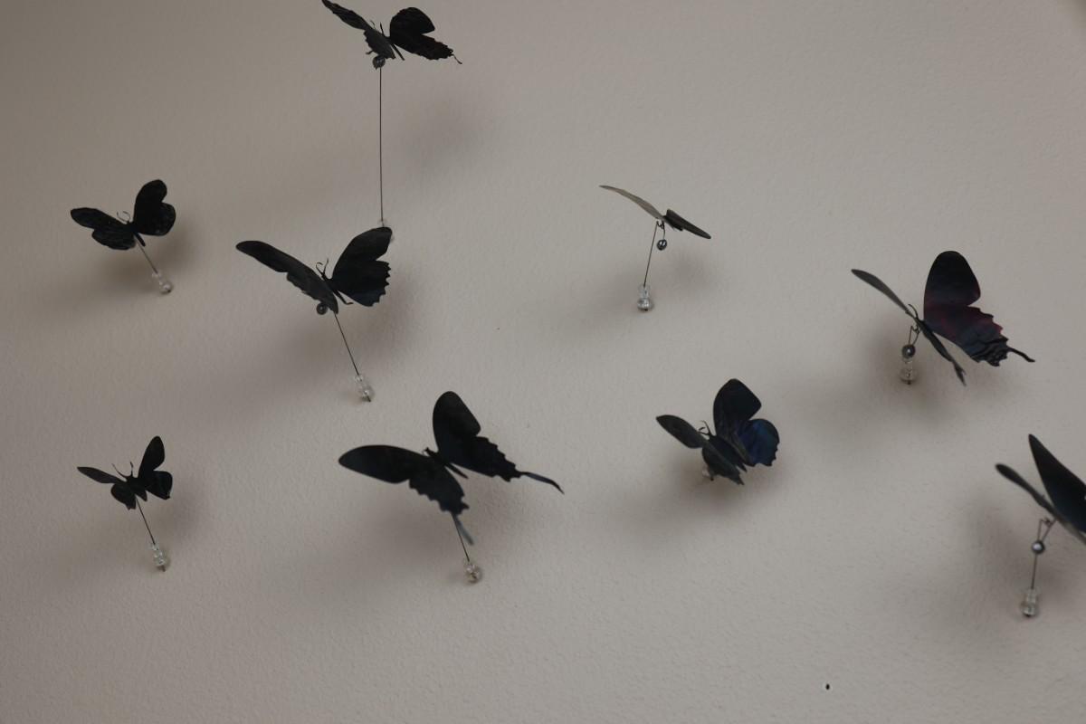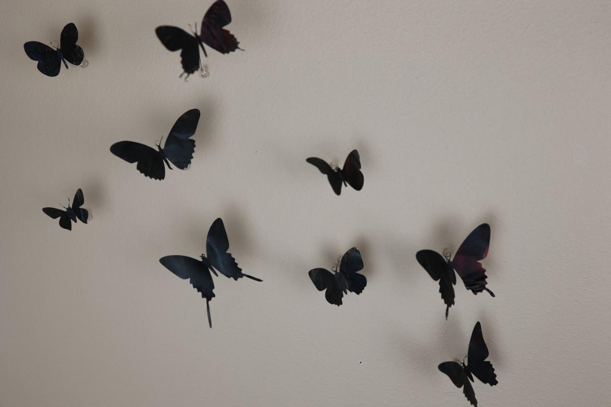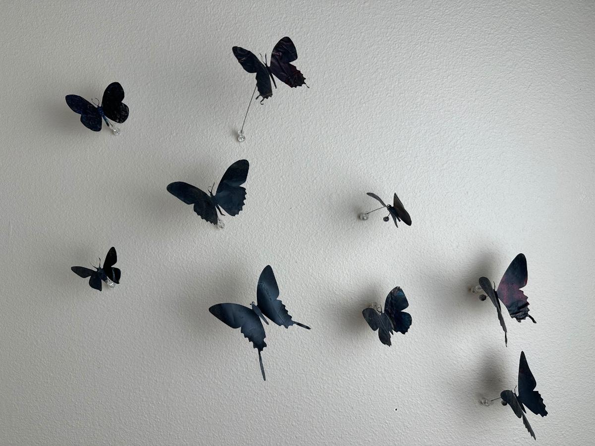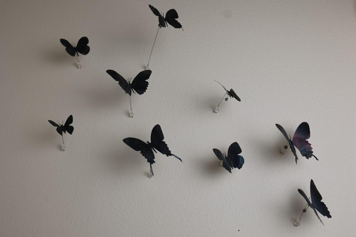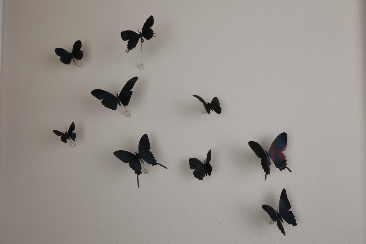 “I am drawn to humble, yet evocative materials; in this case, crushed aluminum cans from the streets of New York - every one of them once raised to someone’s lips. My process of “recycling” them into images of butterflies is a quiet physical meditation, a yoga of tin snips and files and fingers. As the butterflies alight on the walls of my studio, they lead into an exploration of formal, painterly issues. They function both as marks in these abstract, three-dimensional “paintings,” and as actors in curious narratives. Finally, the butterflies operate symbolically, and I try to develop a conceptual unity between materials, process, and imagery: metamorphosing littered beer cans into flocks of butterflies mirrors the act of transformation and rebirth that symbolize across all cultures.” - Paul Villinski
