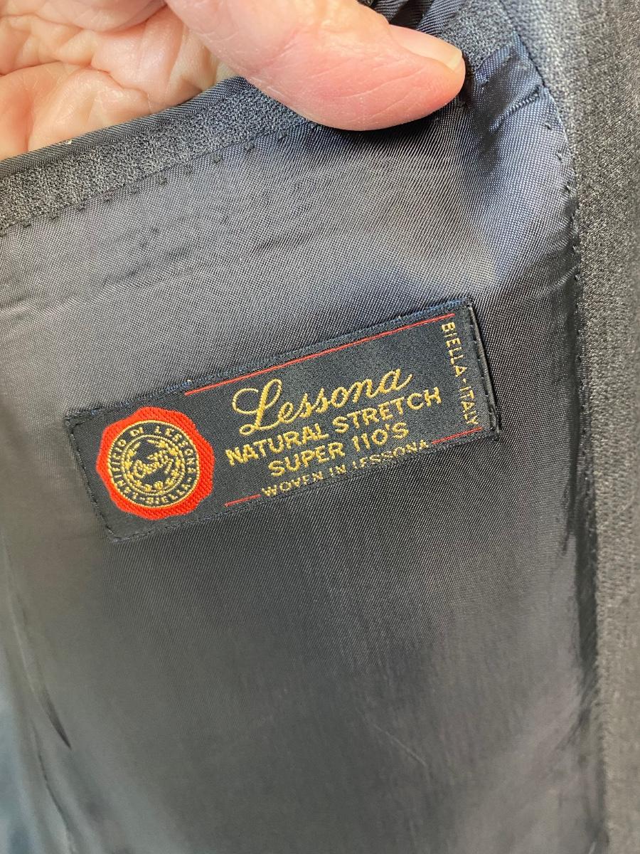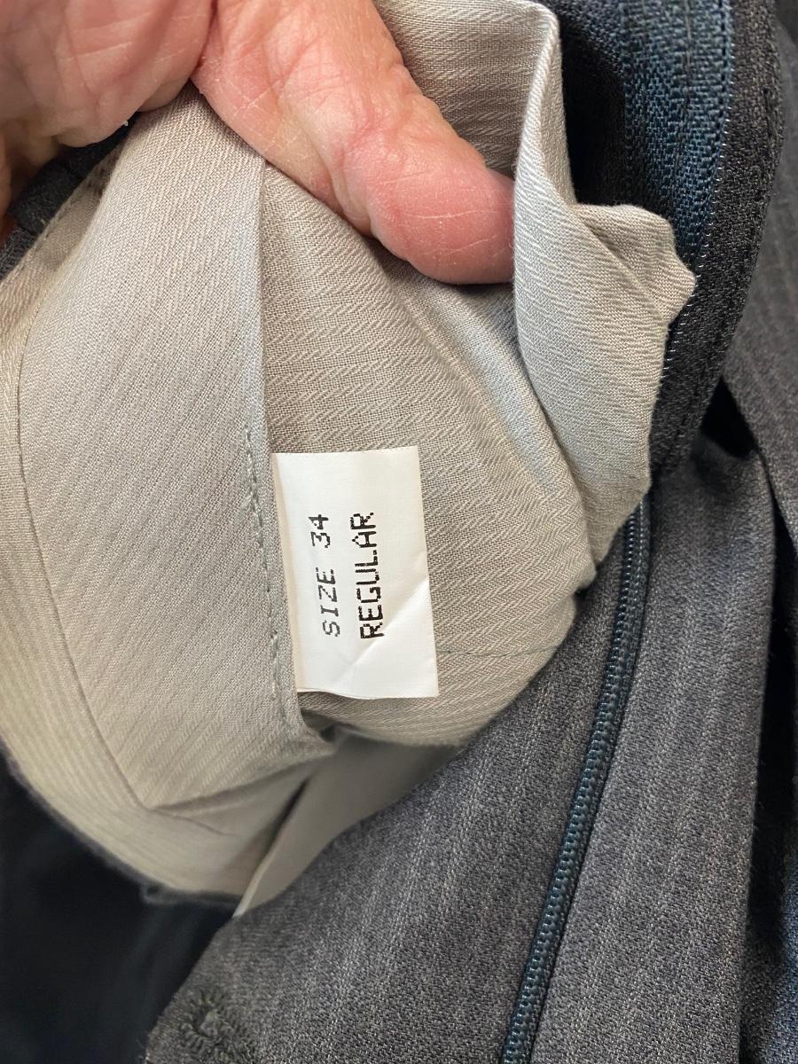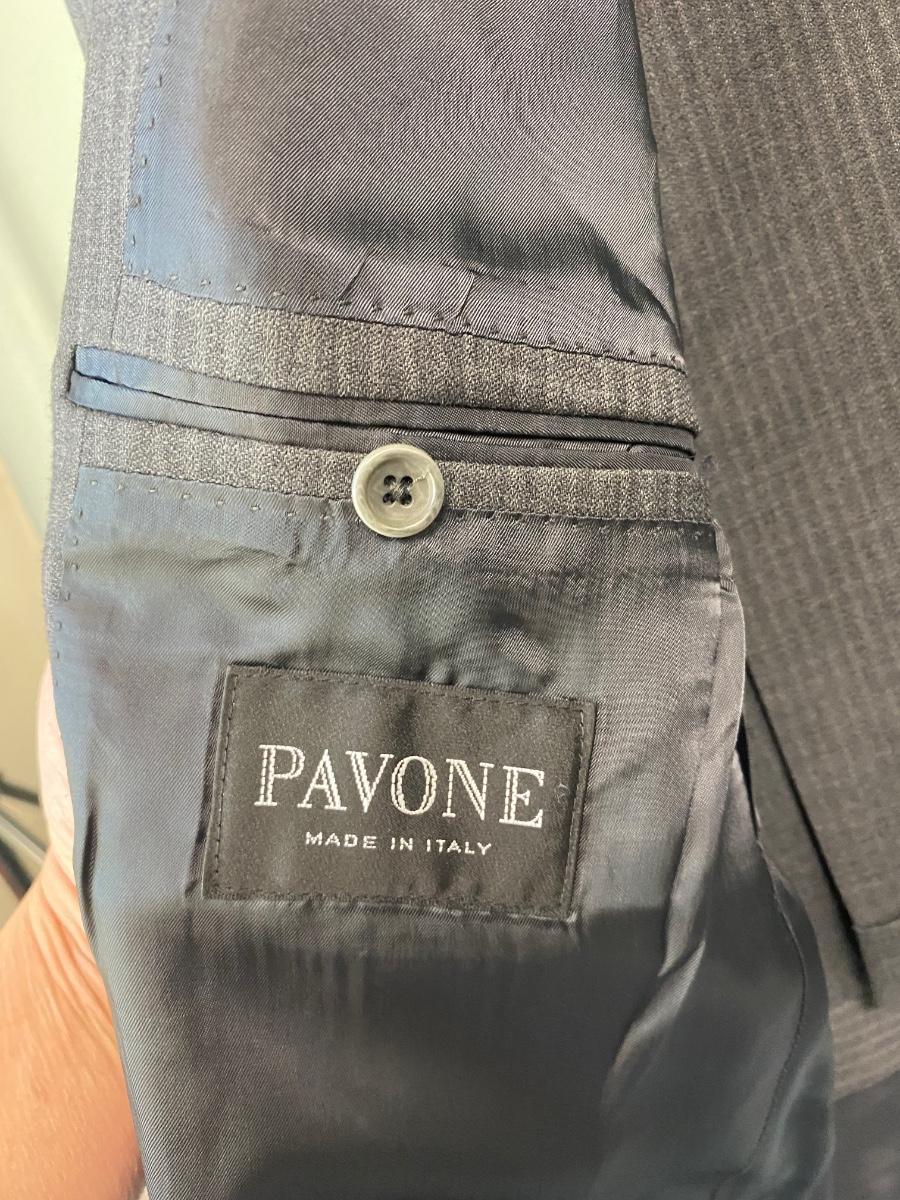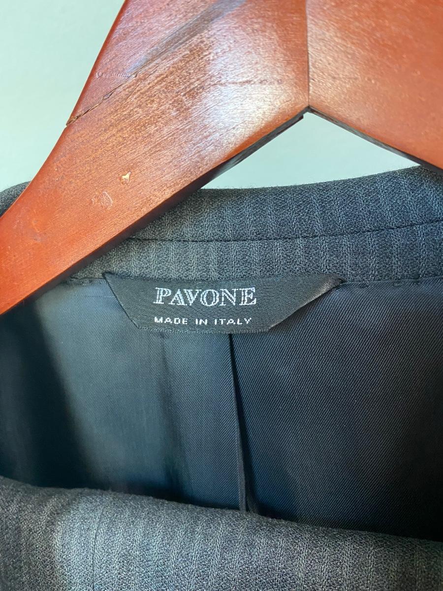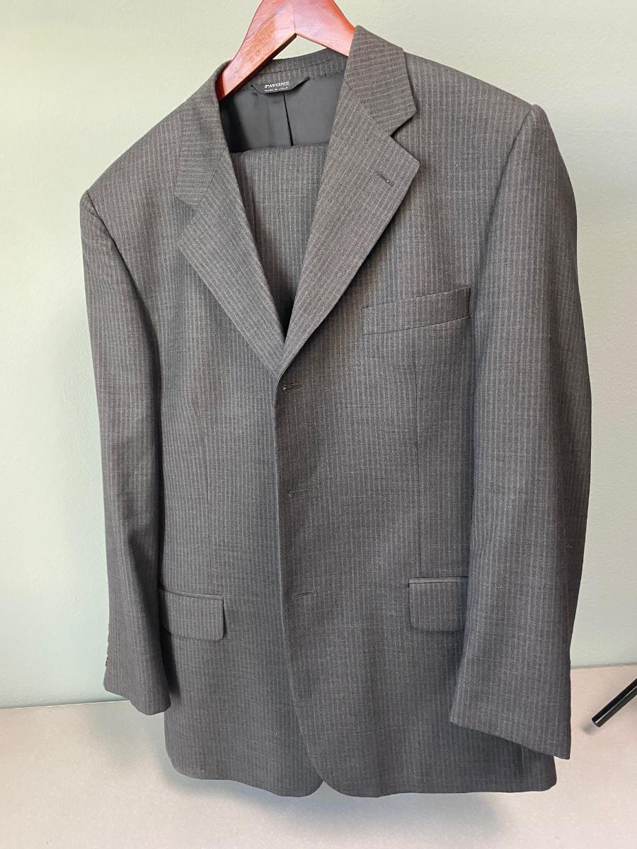 Pavone Grey Pin Stripe Suit Coat and Pants. Pants are a 34, jacket is probably a large. Good condition.