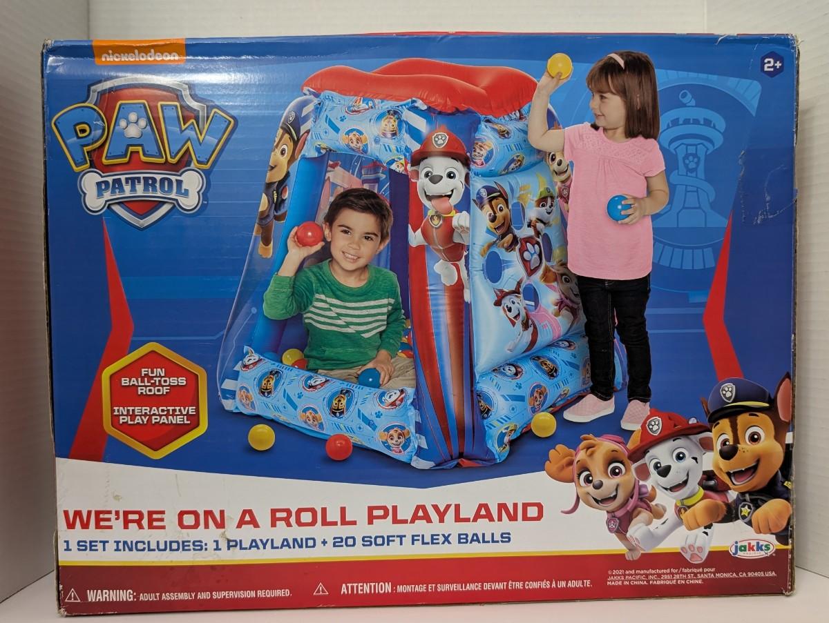 Nickelodeon Paw Patrol “We’re On A Roll” inflatable playland set by Jakks. Includes interactive play panel, fun ball-toss roof, and 20 soft flex balls for active play. Features favorite Paw Patrol characters including Marshall, Chase, and Skye. A fun indoor play set for children ages 2 and up, perfect for Paw Patrol fans and family playtime.