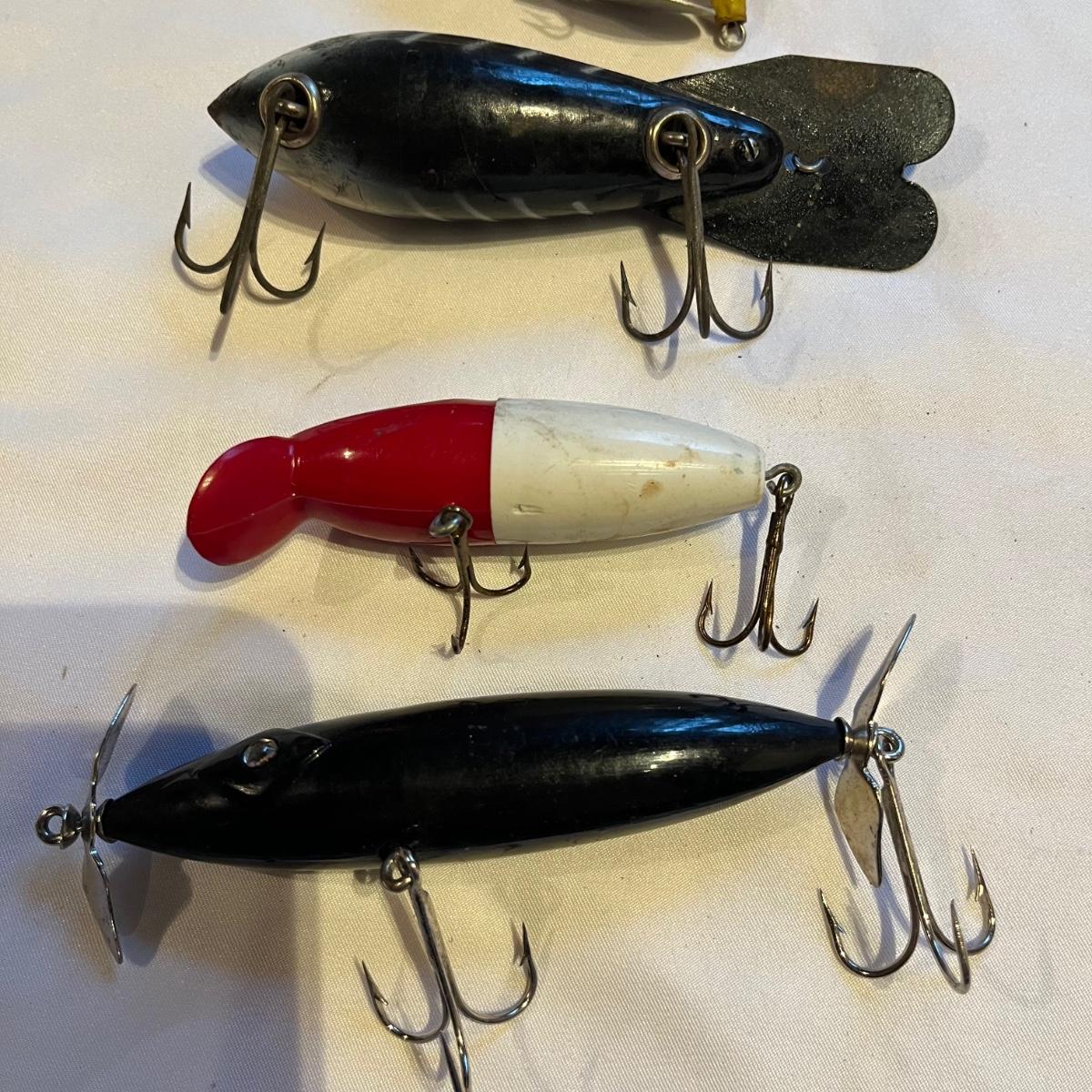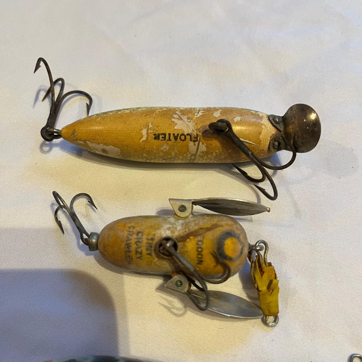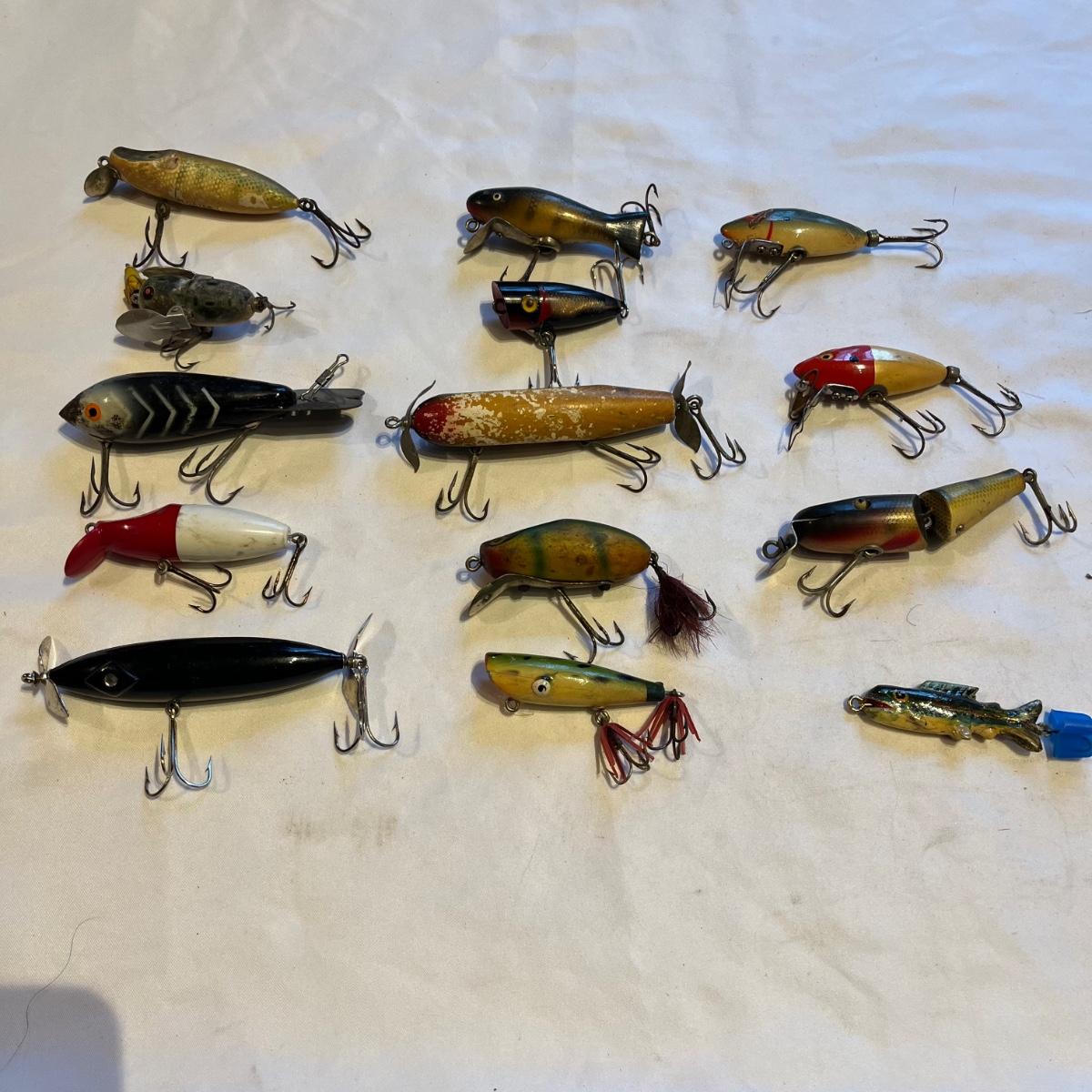 Lot contains fourteen lures including Heddon Crazy Crawler, Paw Paw lure and a assortment of unmarked lures with most appearing to be wood. Longest lure measures 4.75” long.