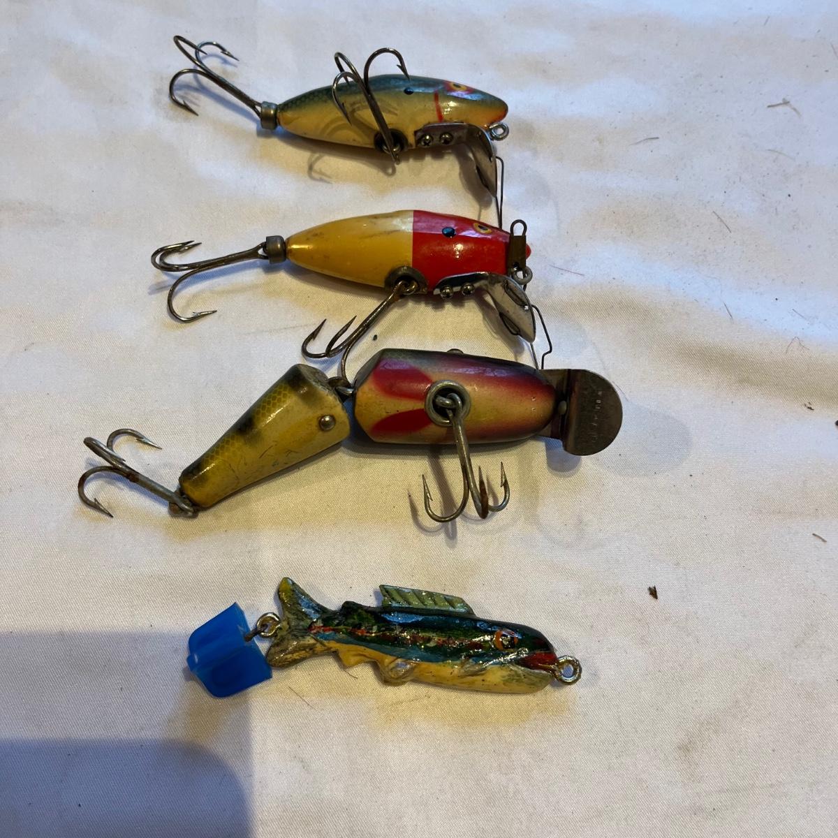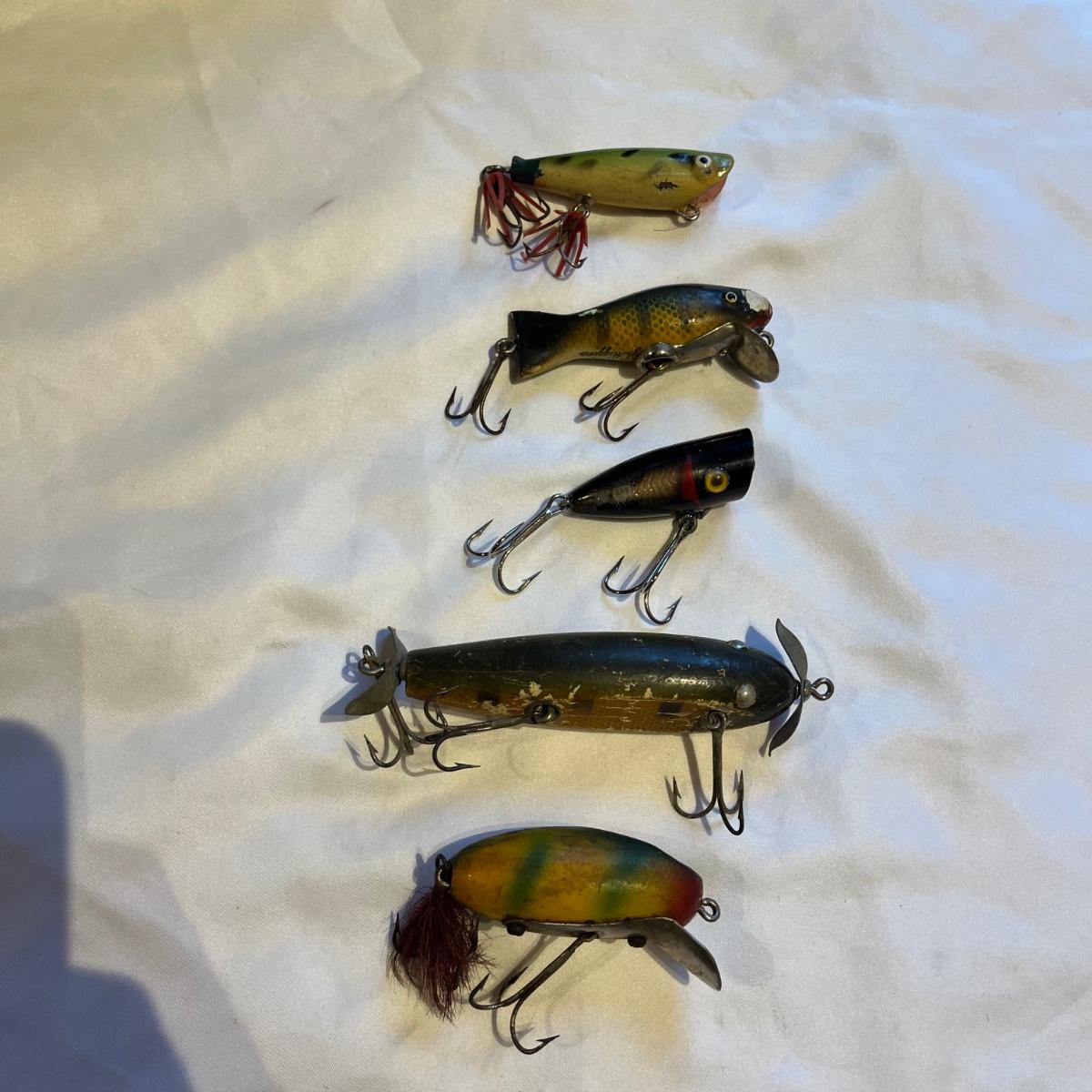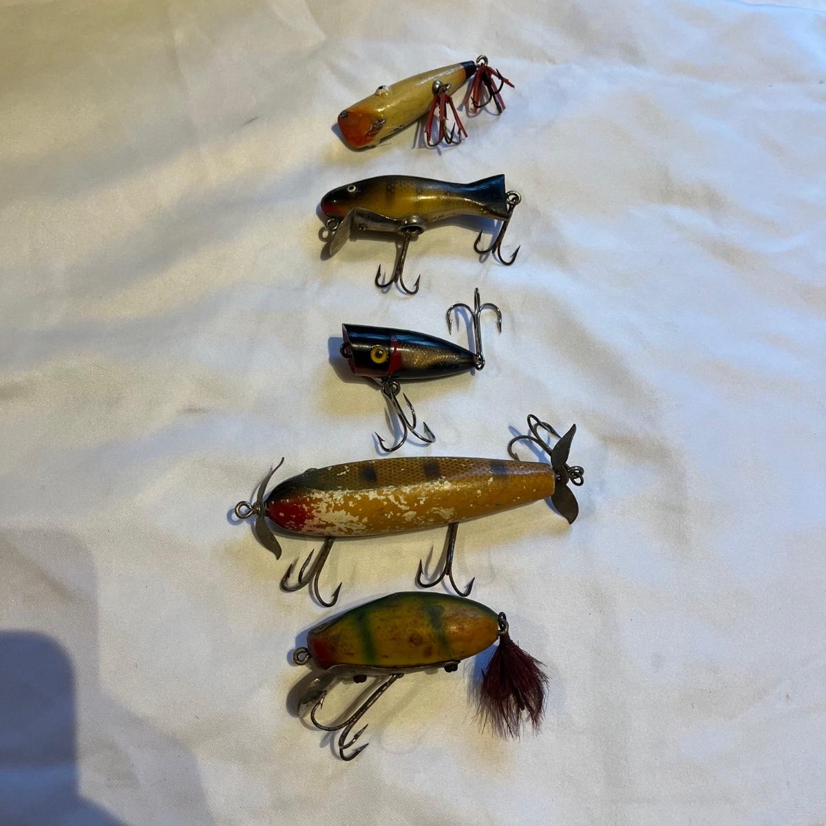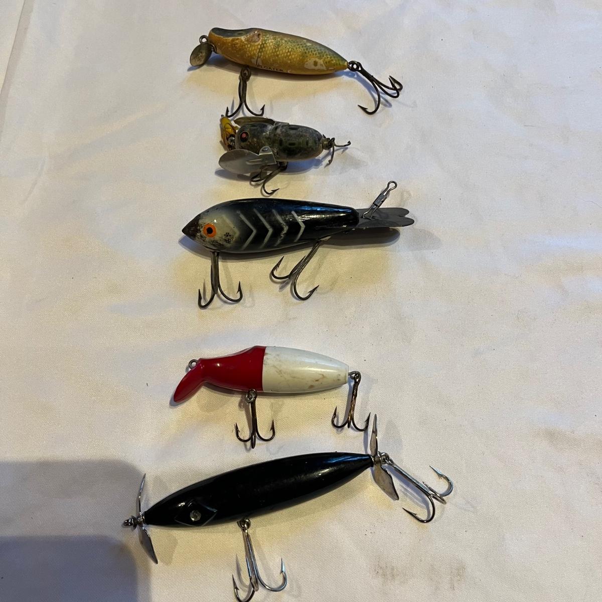 Lot contains fourteen lures including Heddon Crazy Crawler, Paw Paw lure and a assortment of unmarked lures with most appearing to be wood. Longest lure measures 4.75” long.