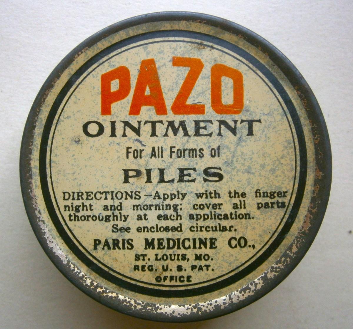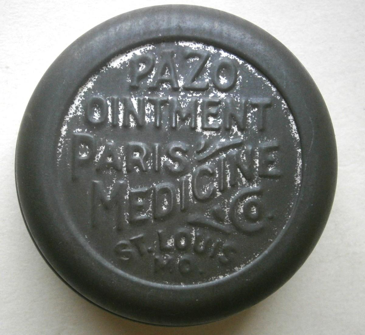 PAZO Ointment for Piles Tin from the early 1900's, 2 in. diameter, lithographed tin.