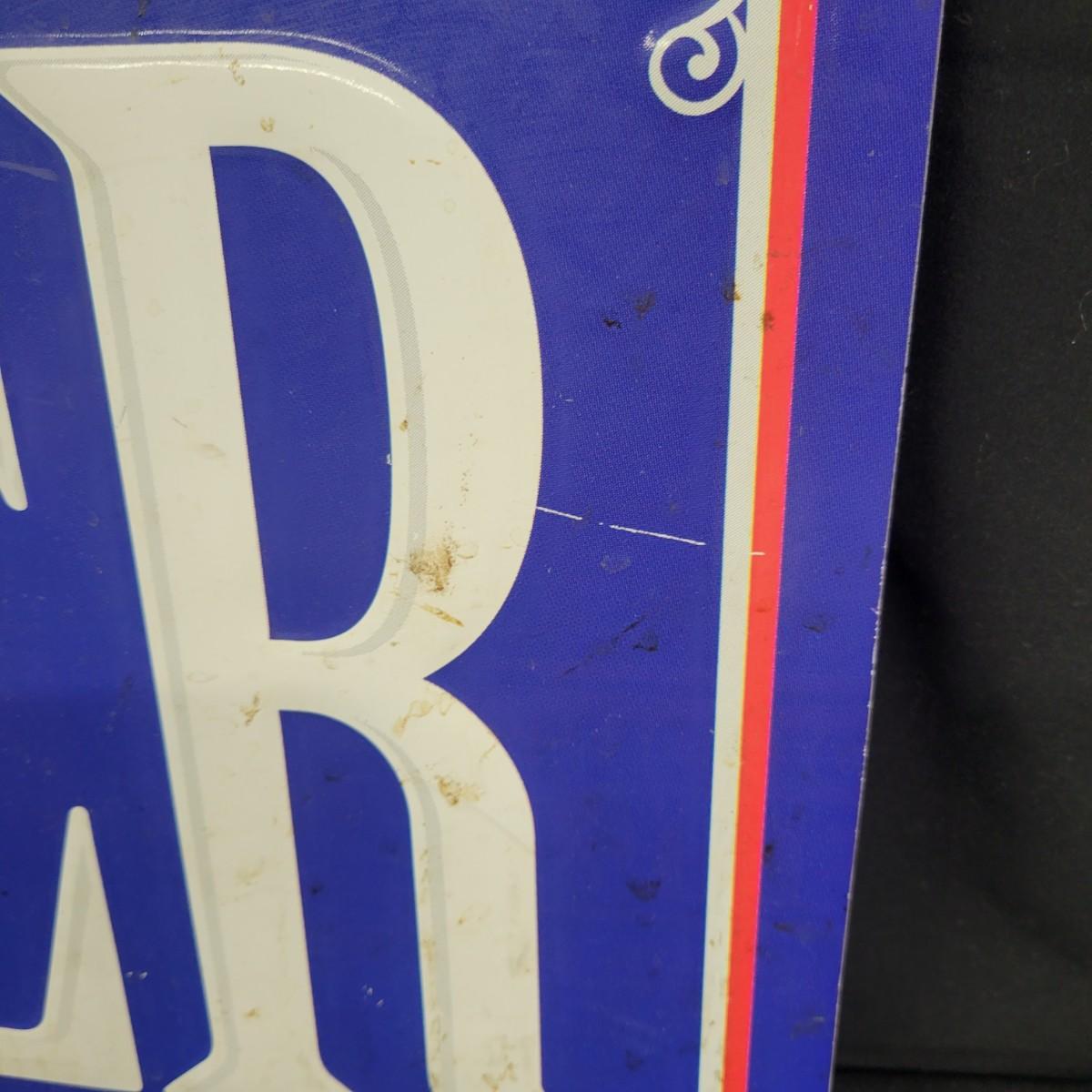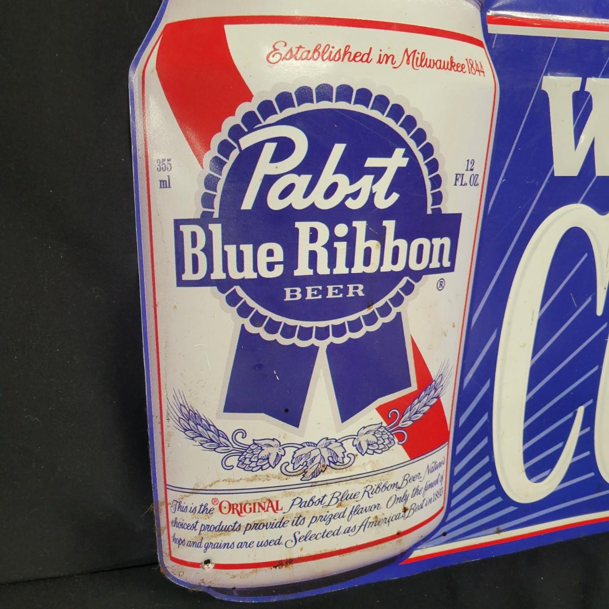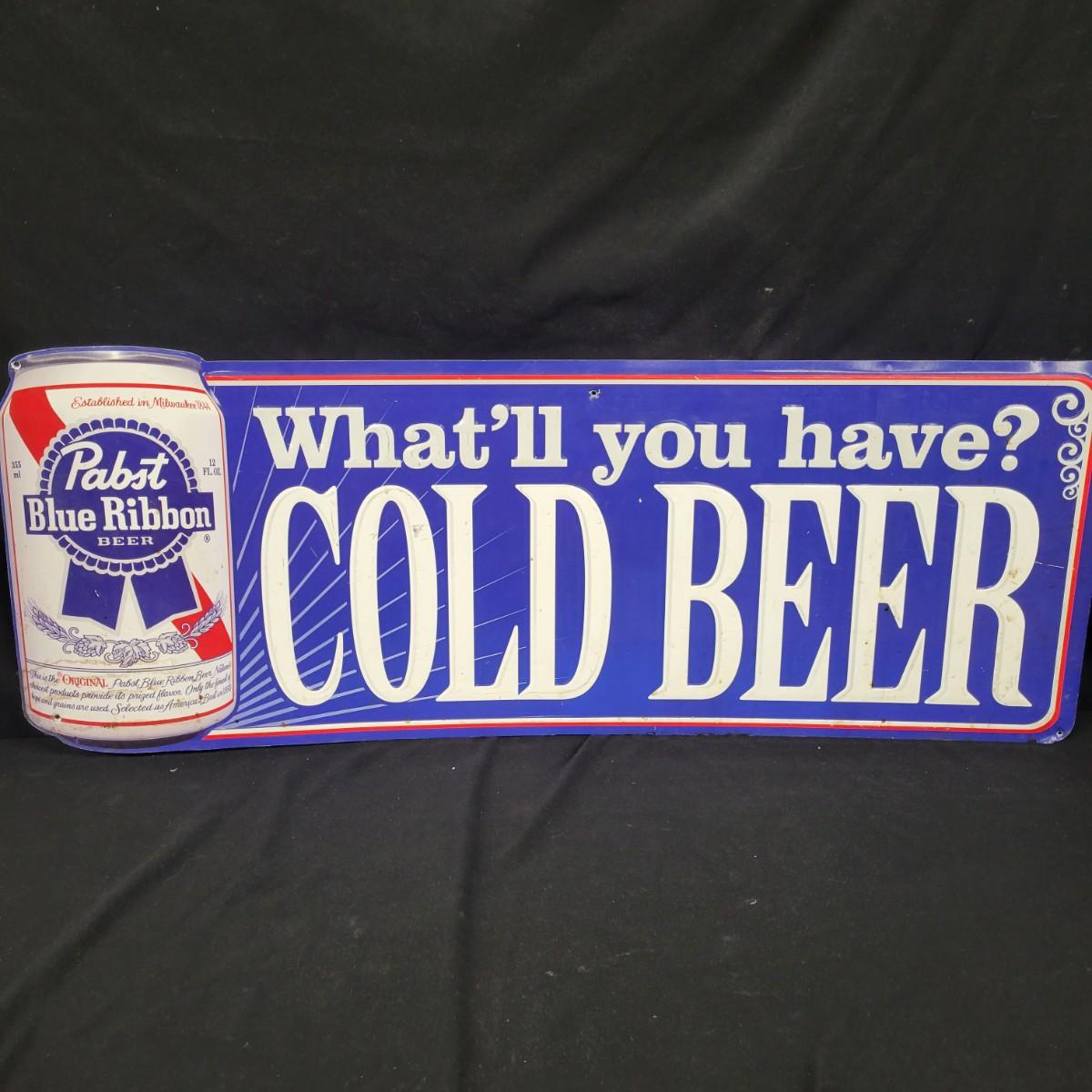 Pabst Blue Ribbon cold beer metal sign in moderate condition. Does show some wear with scratches and stains, see attached pictures. Measures approximately 39.5" x 15" Shipping available