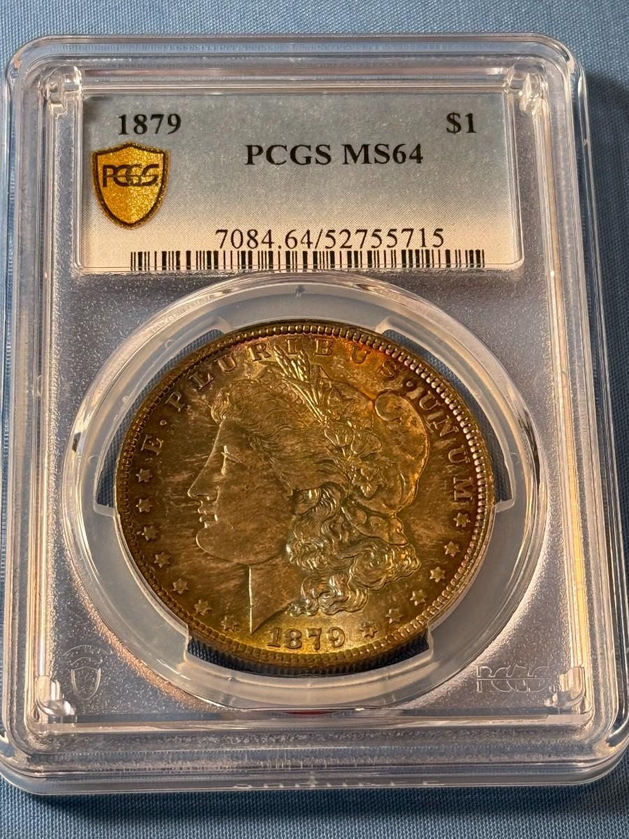 PCGS CERTIFIED 1879 MS64 GRADED SUPERBLY TONED MORGAN SILVER DOLLAR AS PICTURED. $5 DOMESTIC SHIPPING.