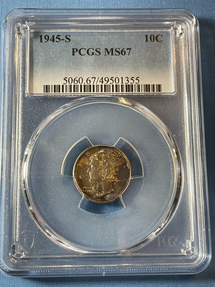 PCGS CERTIFIED 1945-S MS67 MERCURY SILVER DIME AS PICTURED. (COIN #1355). $5 DOMESTIC SHIPPING.