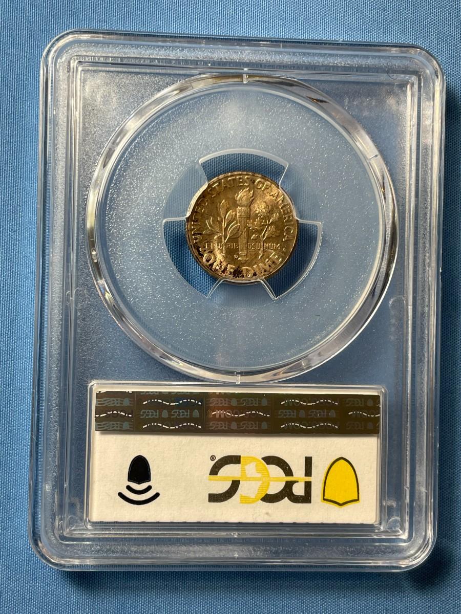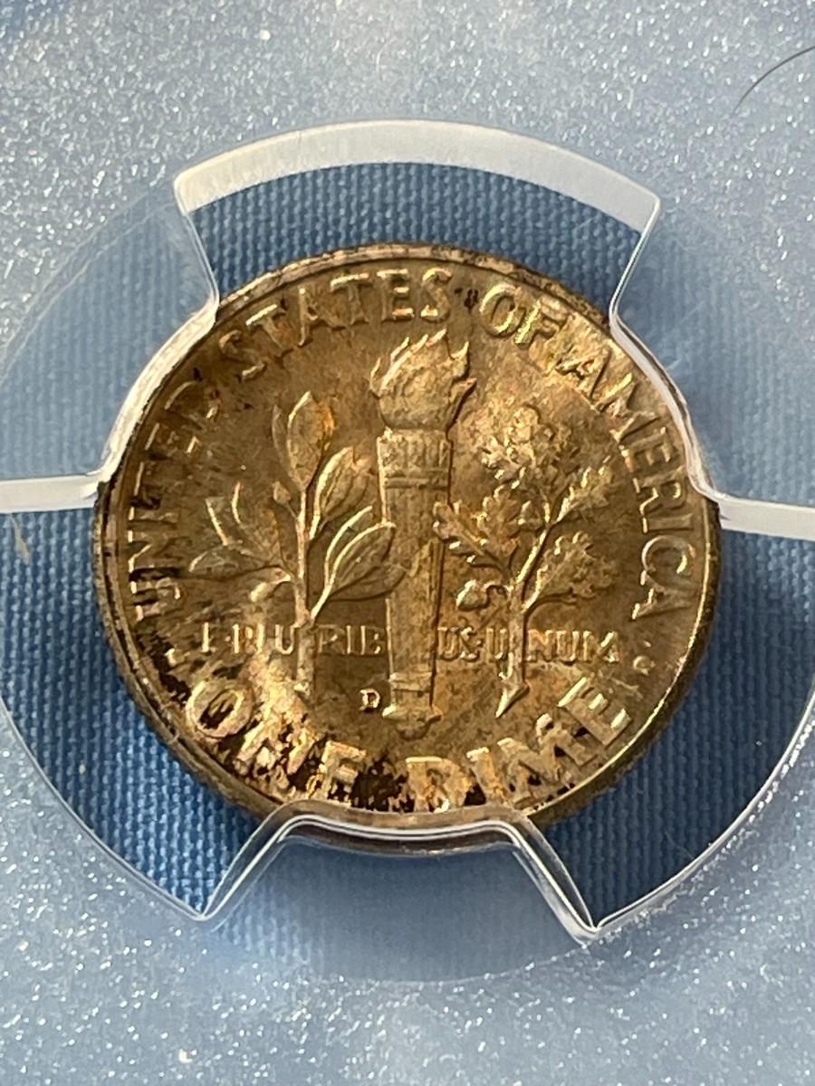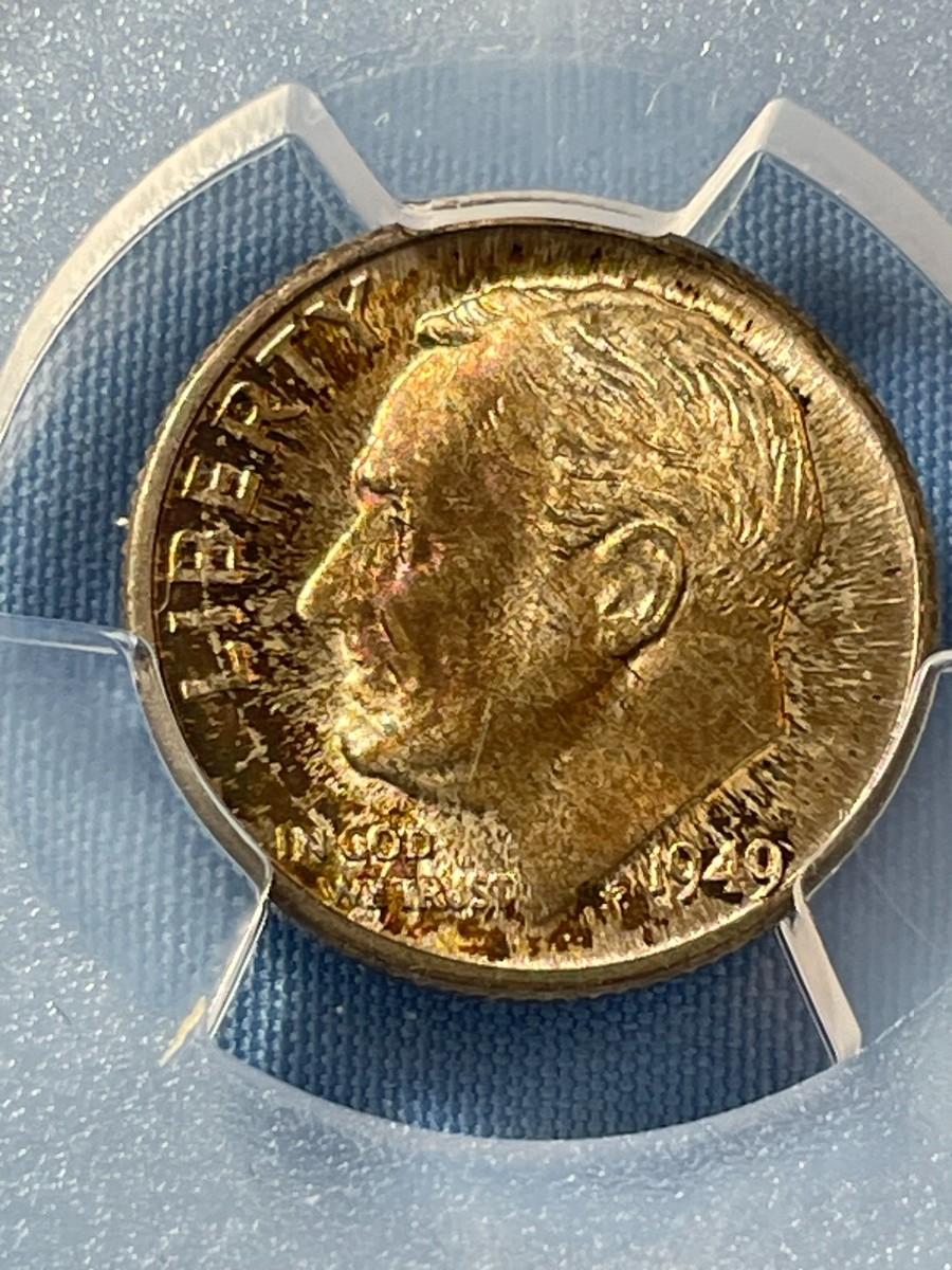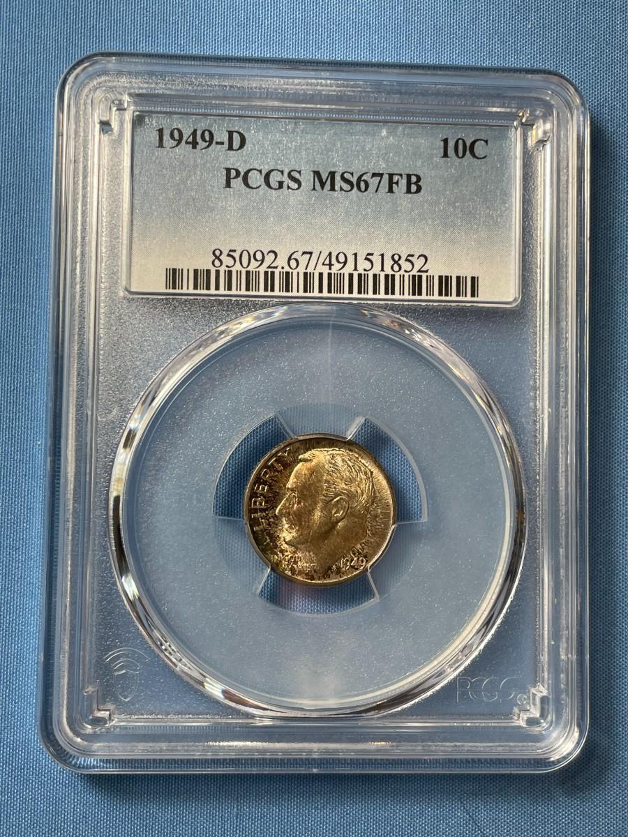 PCGS CERTIFIED 1949-D MS67 TONED FULL BANDS ROOSEVELT SILVER DIME AS PICTURED. $5 DOMESTIC SHIPPING.