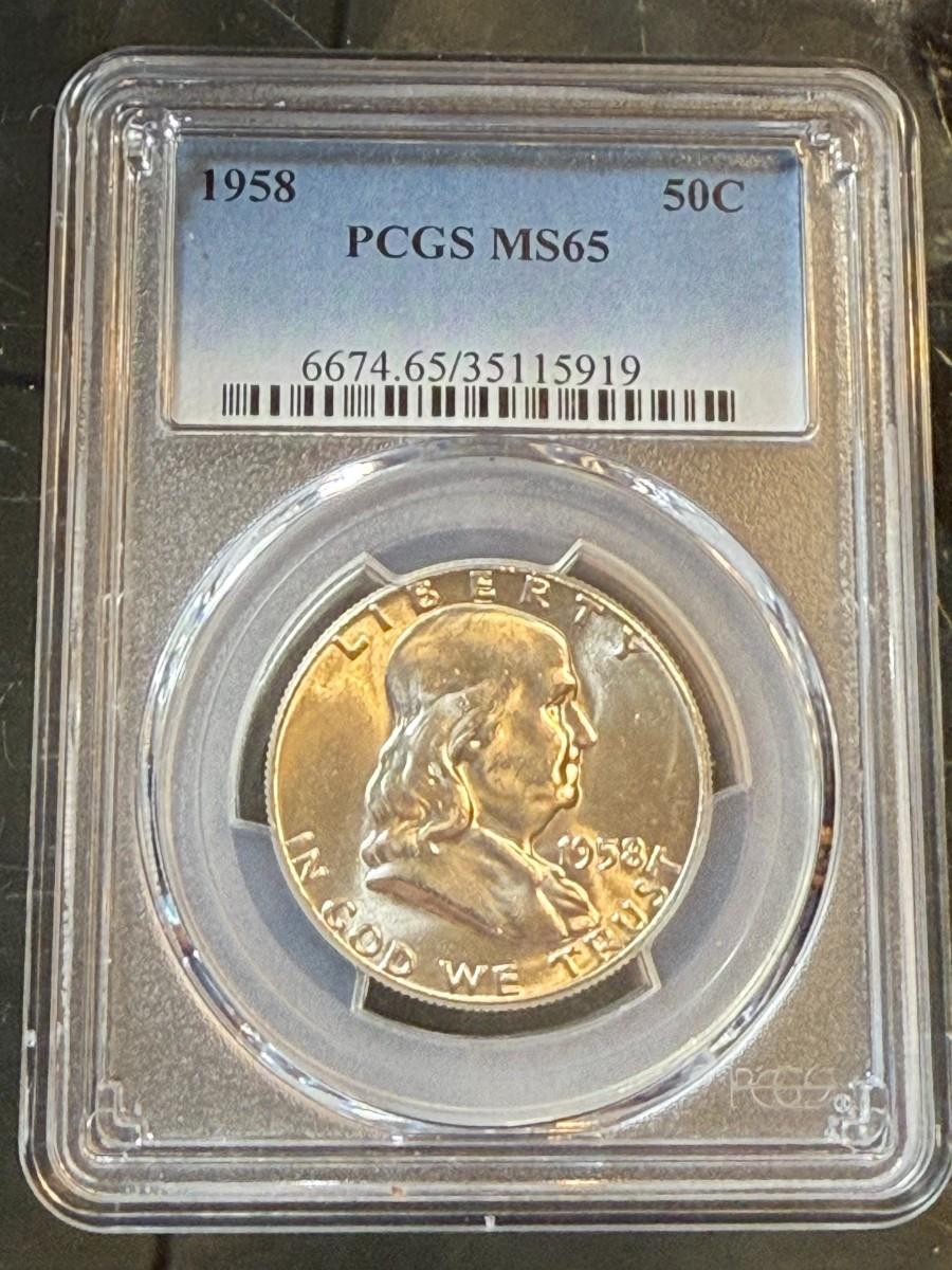 PCGS CERTIFIED 1958 MS65 FRANKLIN SILVER HALF DOLLAR AS PICTURED. $5 DOMESTIC SHIPPING.