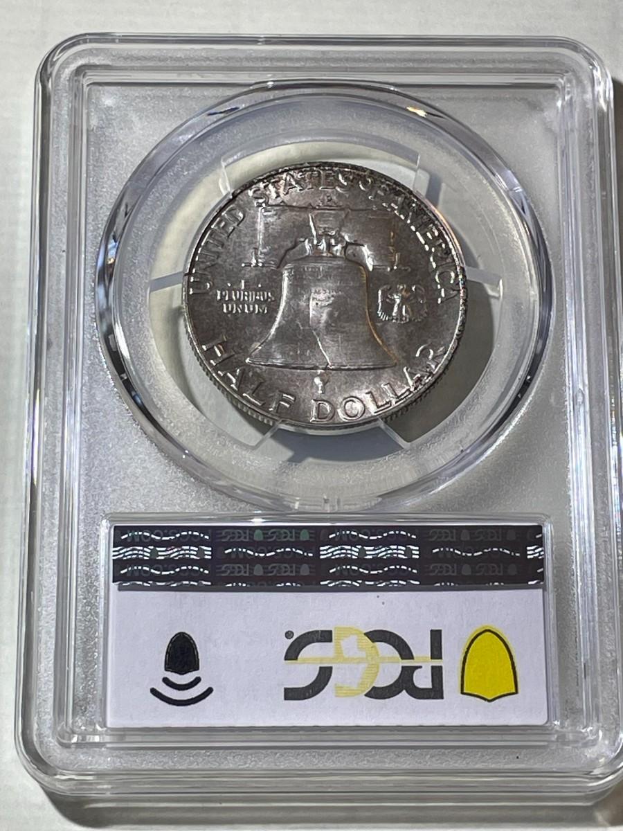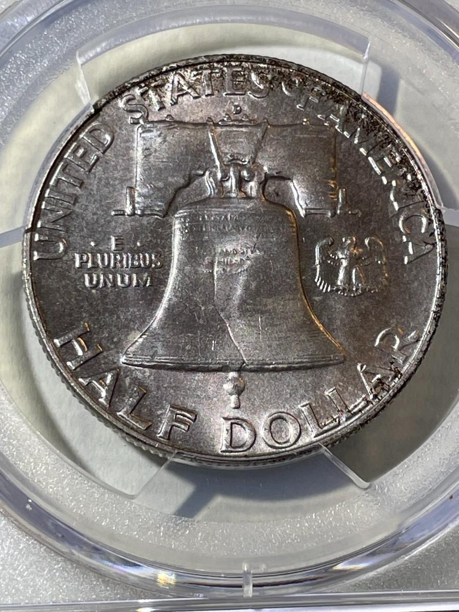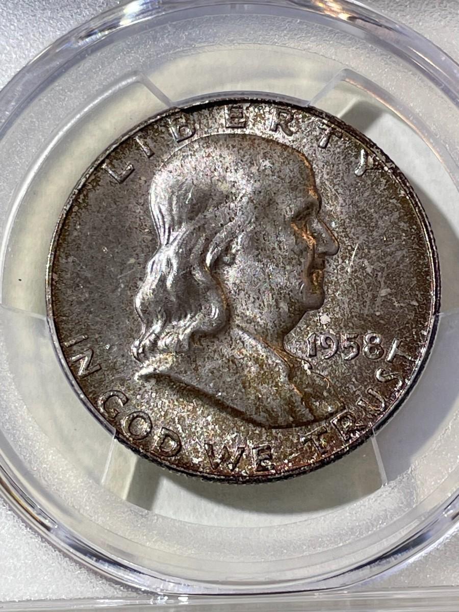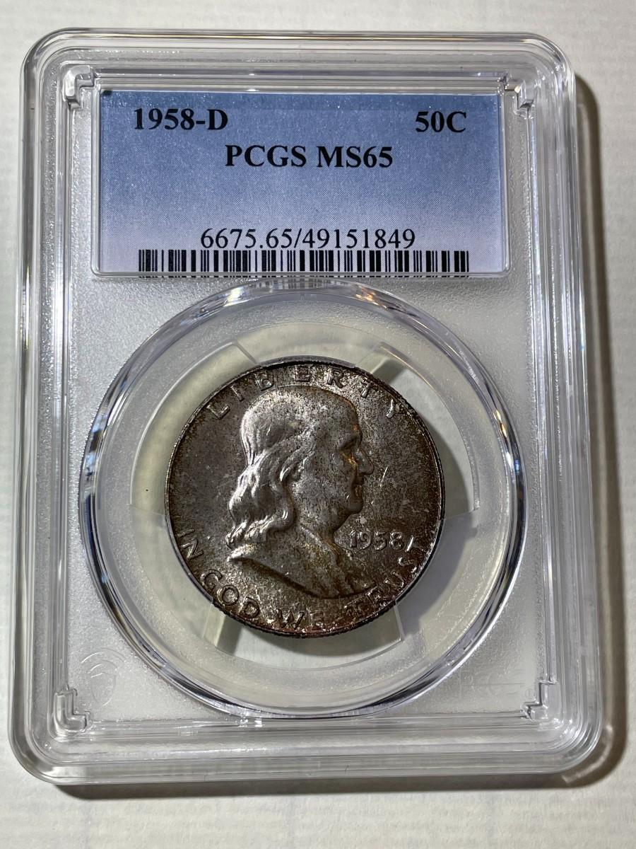 PCGS CERTIFIED 1958-D MS65 SUPERB TONED FRANKLIN SILVER HALF DOLLAR AS PICTURED. $5 DOMESTIC SHIPPING.