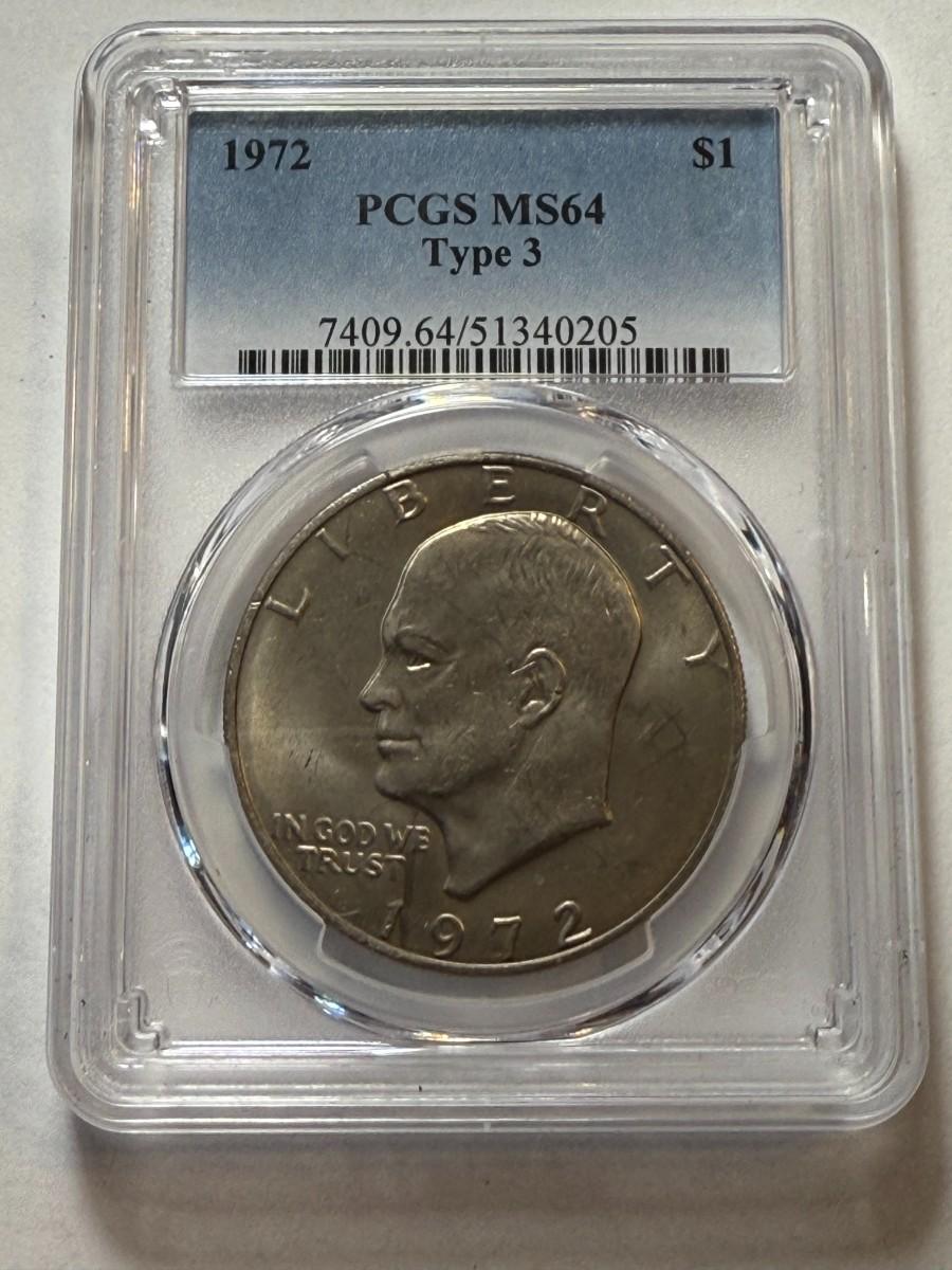 PCGS CERTIFIED 1972 MS64 TYPE-3 EISENHOWER DOLLAR COIN AS PICTURED. $5 DOMESTIC SHIPPING.
