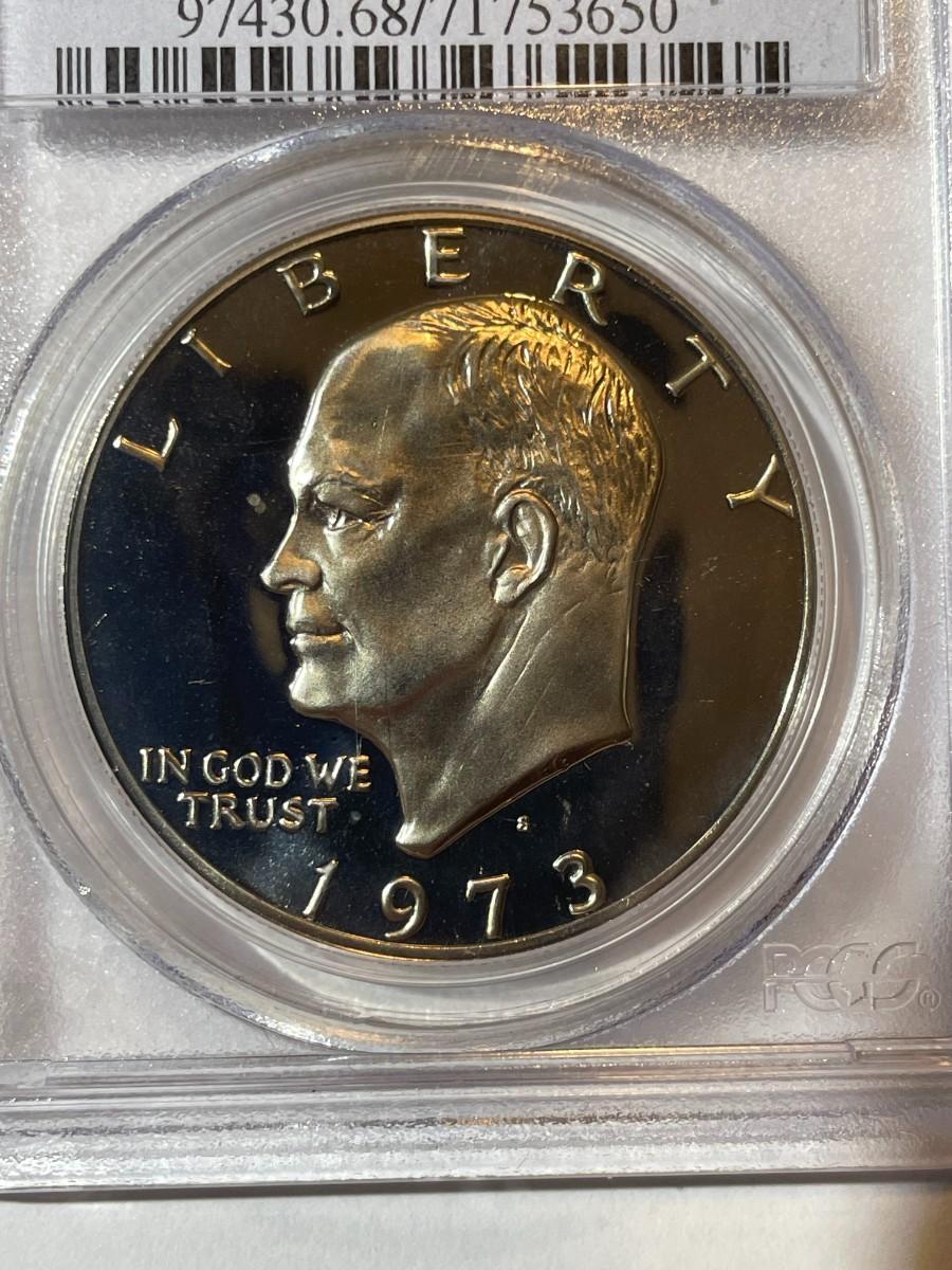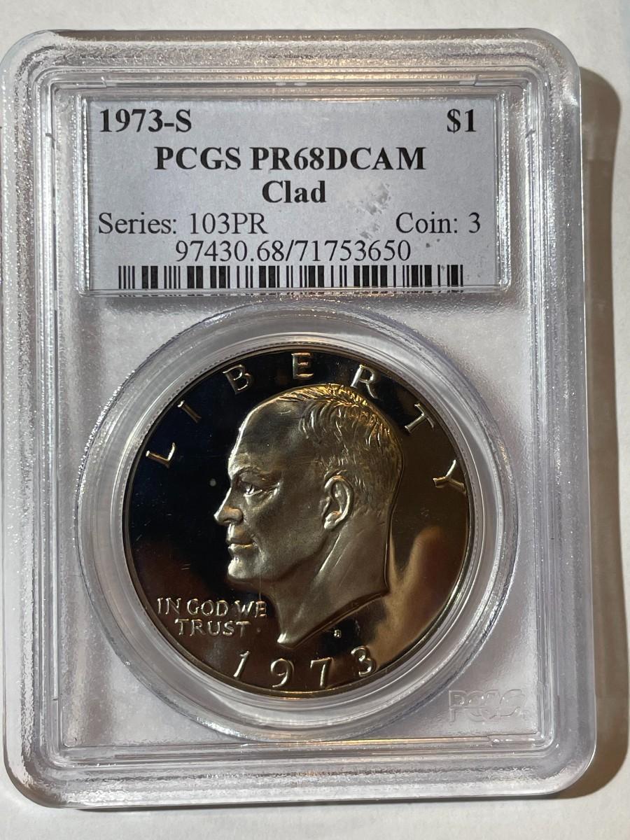 PCGS CERTIFIED 1973-S PROOF68 DEEP CAMEO CLAD EISENHOWER DOLLAR AS PICTURED. $5 DOMESTIC SHIPPING.