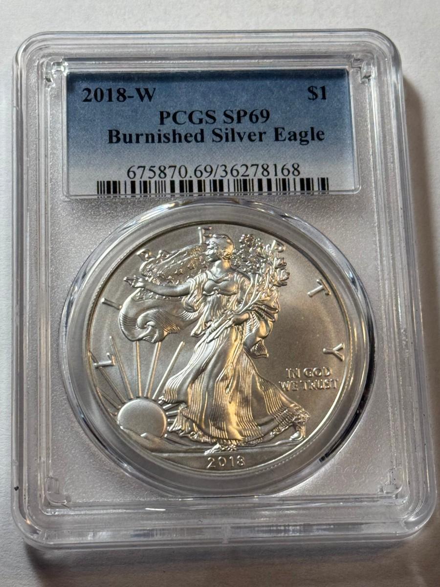 PCGS CERTIFIED 2018-(W) MS69 BURNISHED SILVER EAGLE DOLLAR 1-OUNCE .999 COIN AS PICTURED.