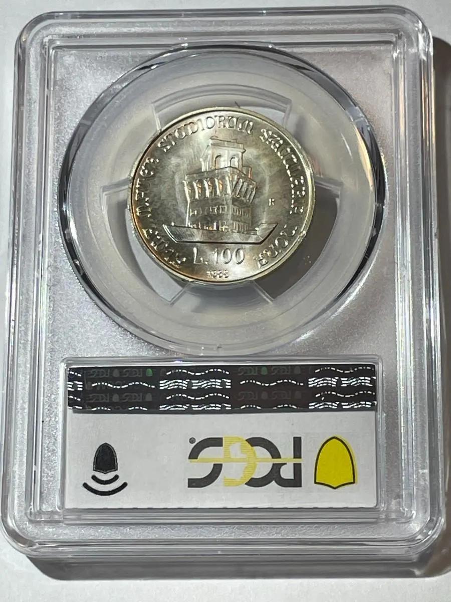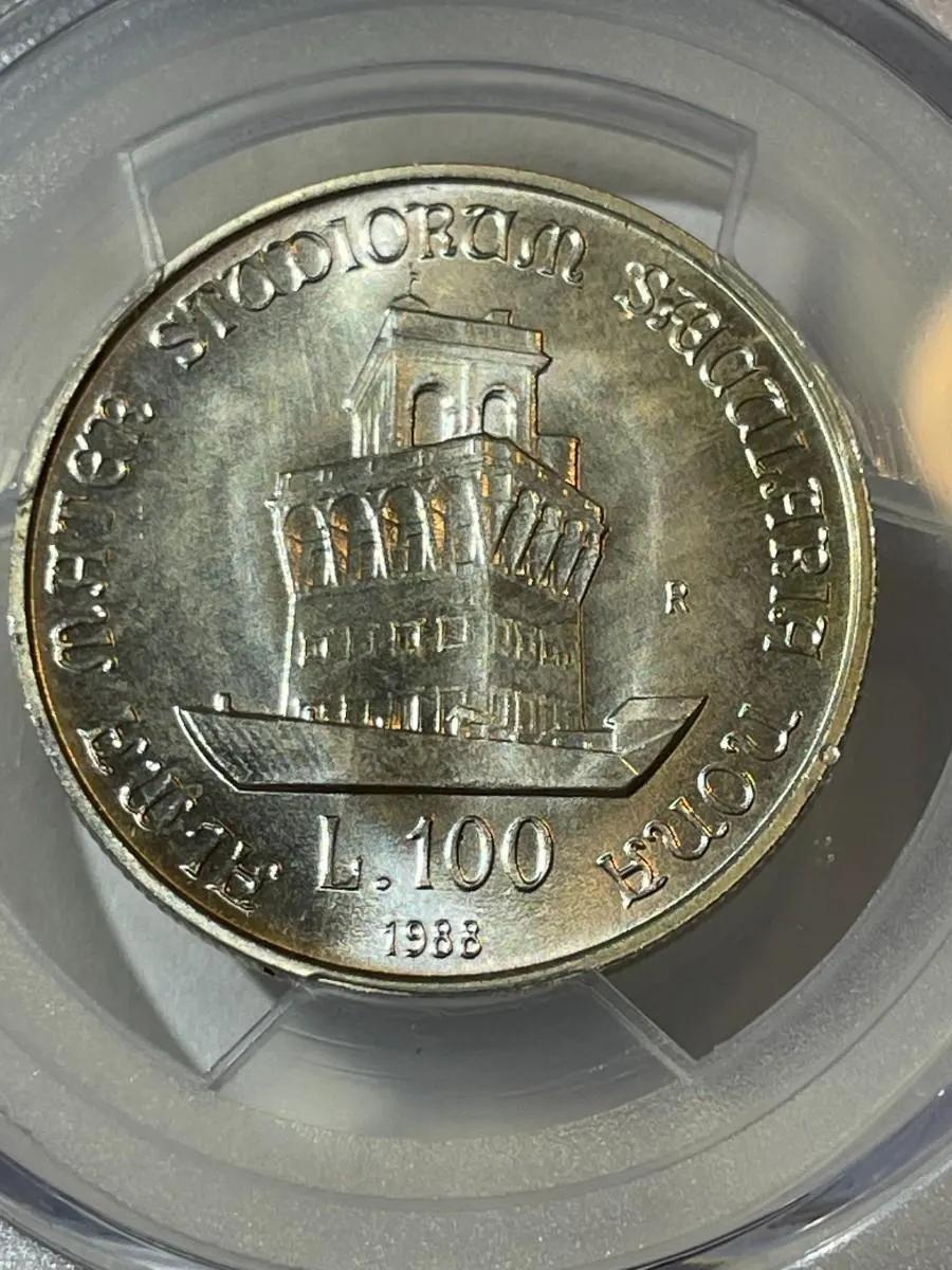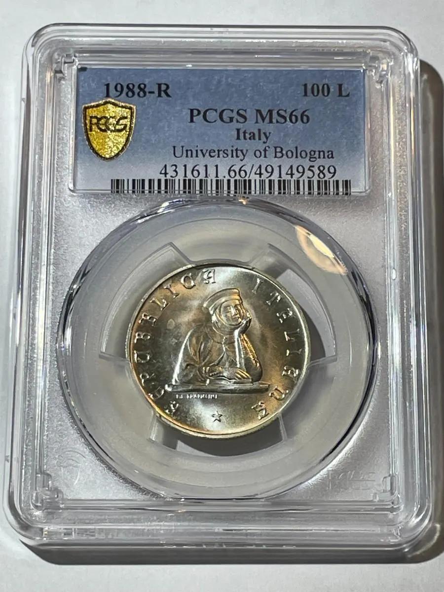PCGS CERTIFIED ITALY 1988-R MS66 100-LIRE UNIVERSITY OF BOLOGNA SILVER COIN AS PICTURED. $5 DOMESTIC SHIPPING.