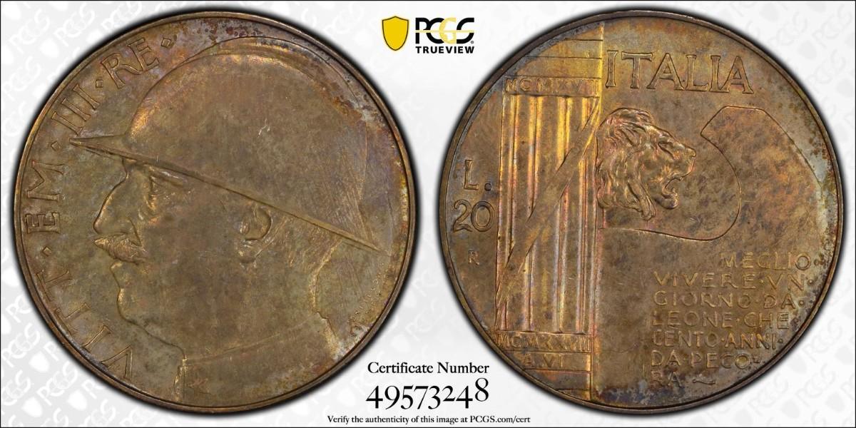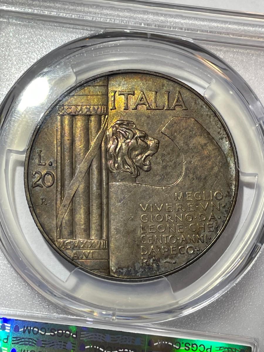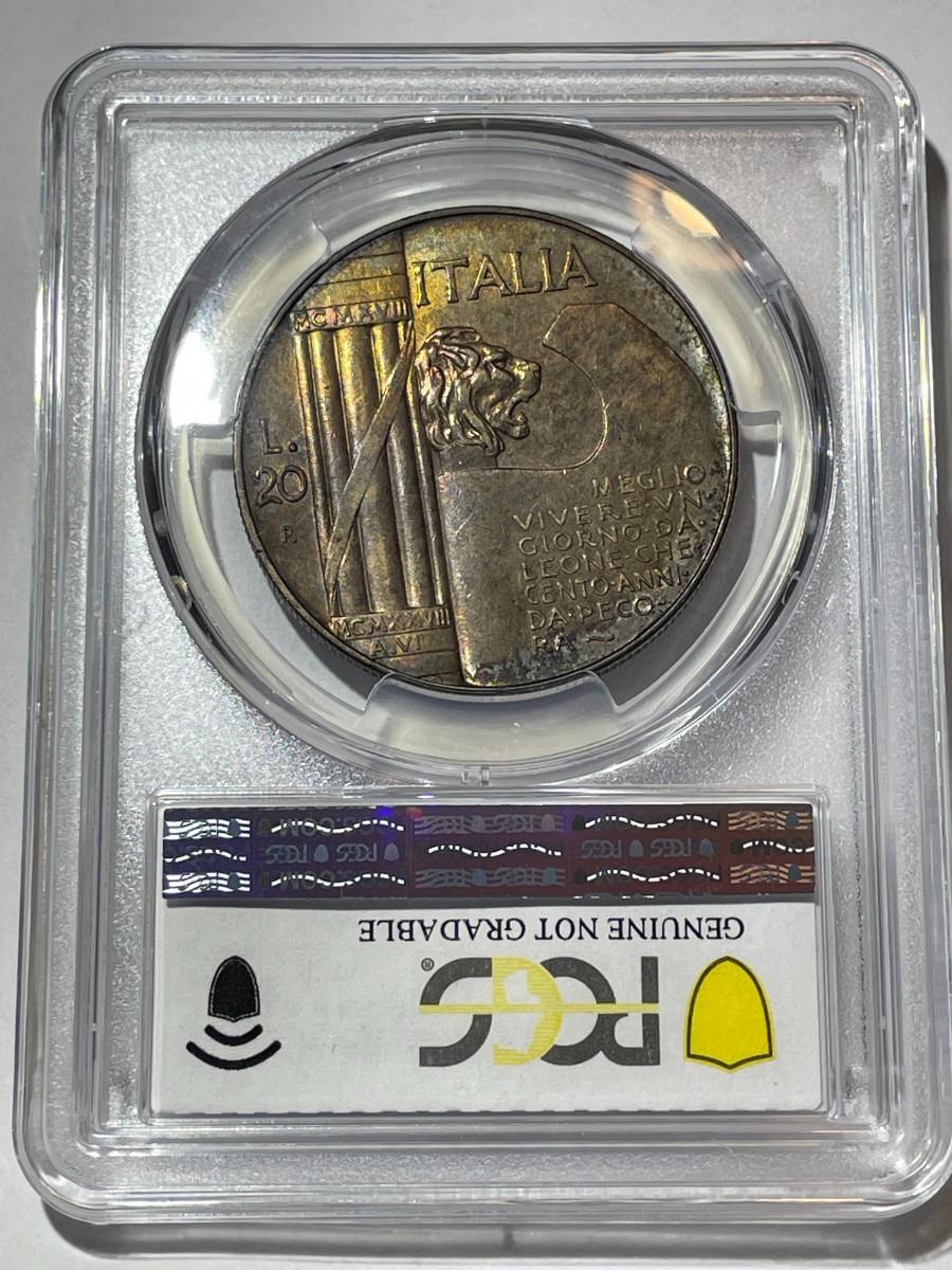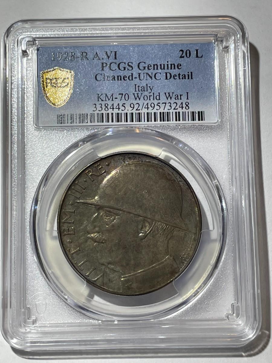 PCGS Certified Scarce Italy 1928-R UNCIRCULATED Detail/Cleaned KM-70 World War I 20-Lira as Pictured. $10 Domestic Shipping.