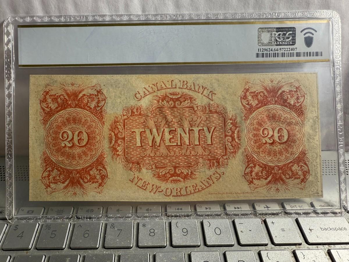 PCGS CERTIFIED United States CANAL BANK $ 20 DOLLARS NEW ORLEANS NOTE 1850'S GRADED CHOICE UNC 64 AS PICTURED. $5 DOMESTIC SHIPPING.