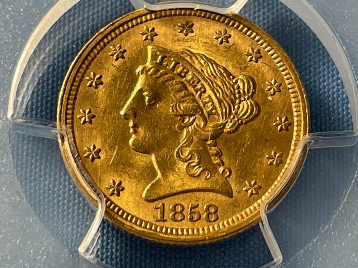 PCGS CERTIFIED VERY RARE 1858 MS62 WAY UNDERGRADED $2.50 LIBERTY GOLD COIN SIRVIVAL IS ESTIMATED AROUND 250 KNOWN PIECES. PROBLEM FREE COIN.