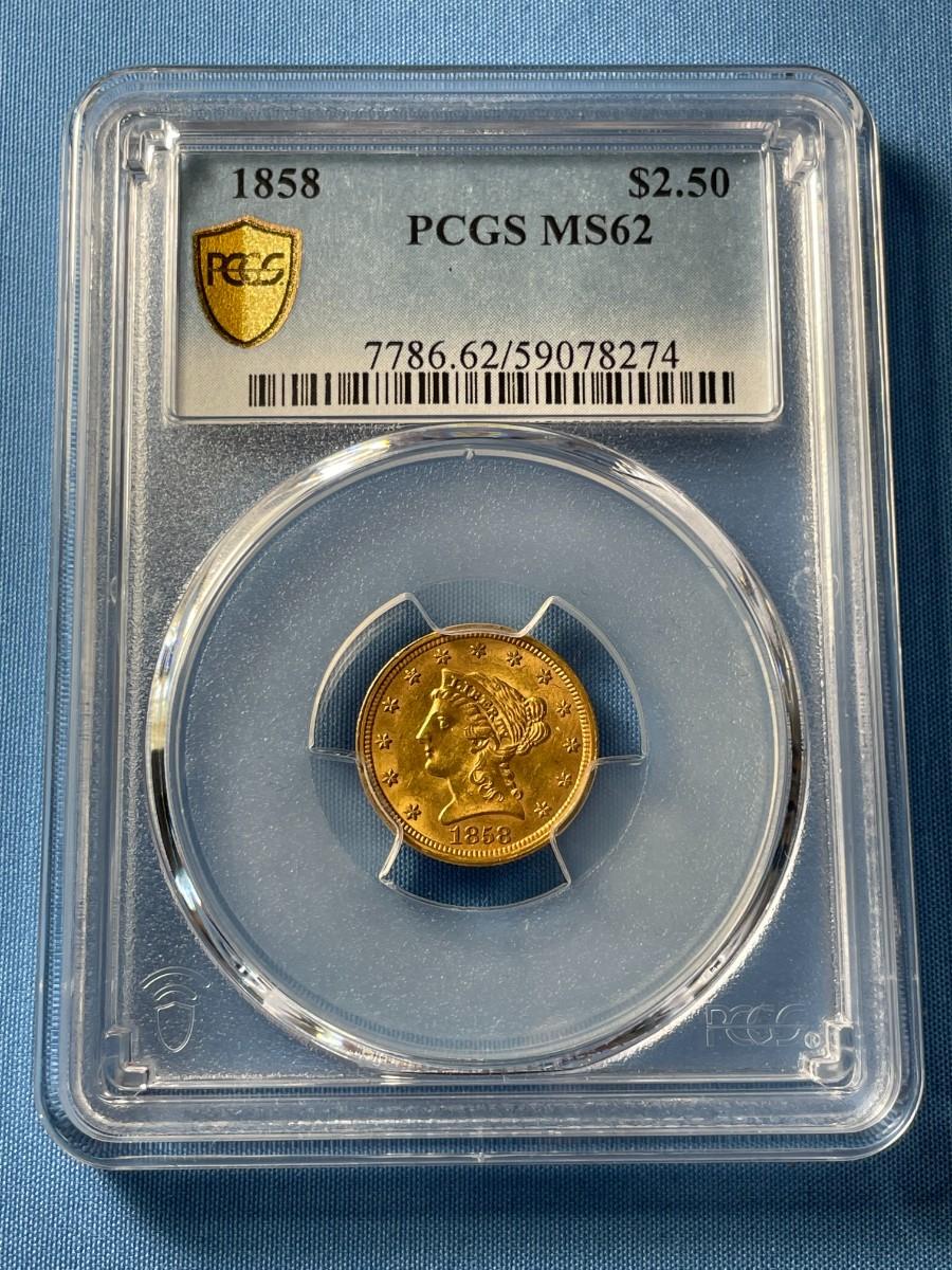 PCGS CERTIFIED VERY RARE 1858 MS62 WAY UNDERGRADED $2.50 LIBERTY GOLD COIN SIRVIVAL IS ESTIMATED AROUND 250 KNOWN PIECES. PROBLEM FREE COIN. FREE DOMESTIC SHIPPING.